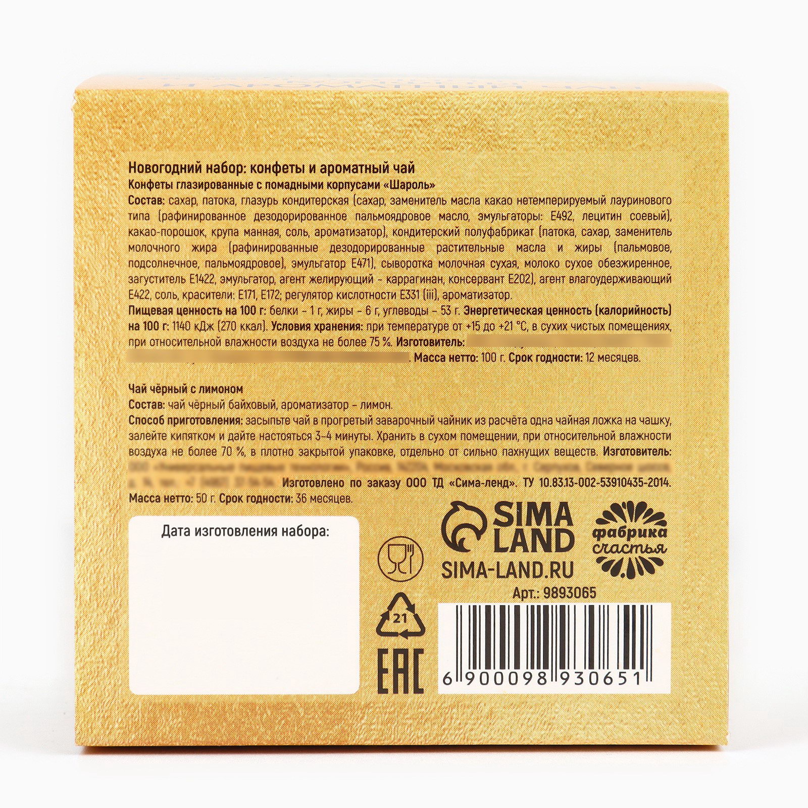 Запрет реализации по сегментам: 00000000266, 00000000593 Составляющие набора: Конфеты, Чай Адресат: Брату, Другу, Маме, Папе, Сестре Размер упаковки: 7 x 14 x 7 см. Символ года: Нет Новогодняя коллекция: Новый год Вид чая: Чёрный tnved: 902300000 tnved: 902300000 Фасовка: Весовой Тематика праздника: Новый год Для кого: Унисекс В наборе, шт.: 2 Вид упаковки: Подарочная коробка Возраст: Для взрослых Тематика подарка: Продукты питания Конфеты "O La La" глазированные Состав: сахар, заменитель масла какао (масло пальмоядровое рафинированное, дезодорированное, фракционированное, гидрогенизированное), сыворотка молочная сухая, какао-порошок, эмульгаторы (лецитин Е322, Е476), начинка: сахар, жир специального назначения (масла растительные рафинированные, дезодорированные, модифицированные), сыворотка молочная сухая, мальтодекстрин, порошок манго сублимированный, ароматизатор натуральный "Манго", краситель пищевой – куркумин. Срок годности: 9 месяцев Масса нетто: 100 г (± 10 г). Чай чёрный ароматизированный Состав: чай чёрный байховый, ароматизатор: лимон. Срок годности: 36 месяцев Масса нетто: 50 гр | ||