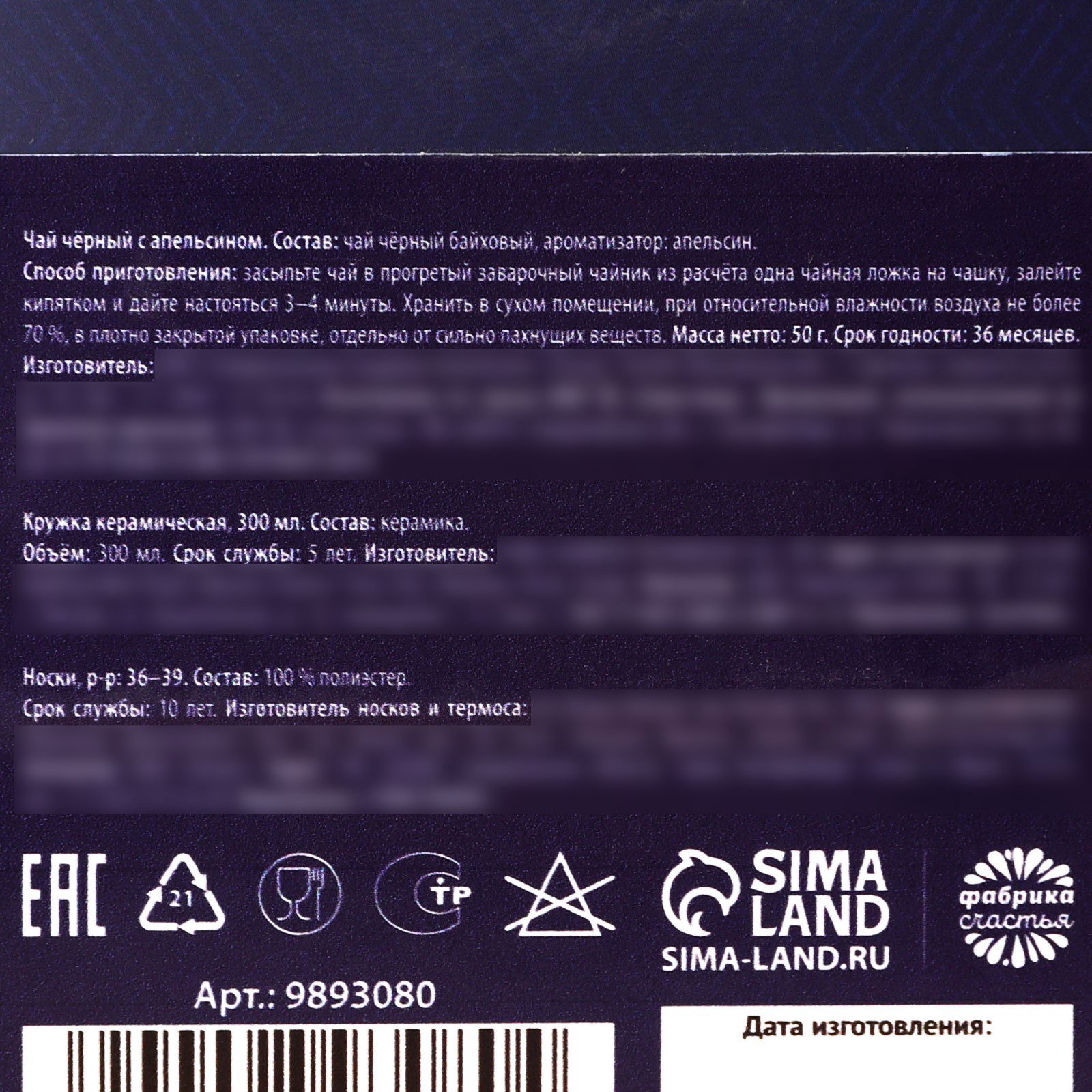 Запрет реализации по сегментам: 00000000266, 00000000593 Составляющие набора: Кружка, Носки, Чай Размер упаковки: 12.5 x 14.5 x 12.5 см. tnved: 6115970000 Честный знак: Честный знак Адресат: Без адресата В наборе, шт.: 3 Возраст: Для взрослых Тематика праздника: Новый год Тематика подарка: Продукты питания Для кого: Унисекс Вид упаковки: Подарочная коробка ПРИ ОФОРМЛЕНИИ ЗАКАЗА, ПРОСИМ ЗАПРАШИВАТЬ АКТУАЛЬНЫЕ СРОКИ ГОДНОСТИ У МЕНЕДЖЕРА Чай чёрный с апельсином Состав: чай чёрный байховый, ароматизатор: апельсин. Способ приготовлении: засыпьте чай в прогретый заварочный чайник из расчёта одна чайная ложка на чашку, залейте кипятком и дайте настояться 3-4 минуты . Срок годности: 36 месяцев Масса нетто: 50 гр Кружка керамическая Состав: керамика. Срок службы: 5 лет Объем: 300 мл Носки, размер 36-39 Состав: 100% полиэстер. Срок службы: 10 лет | ||