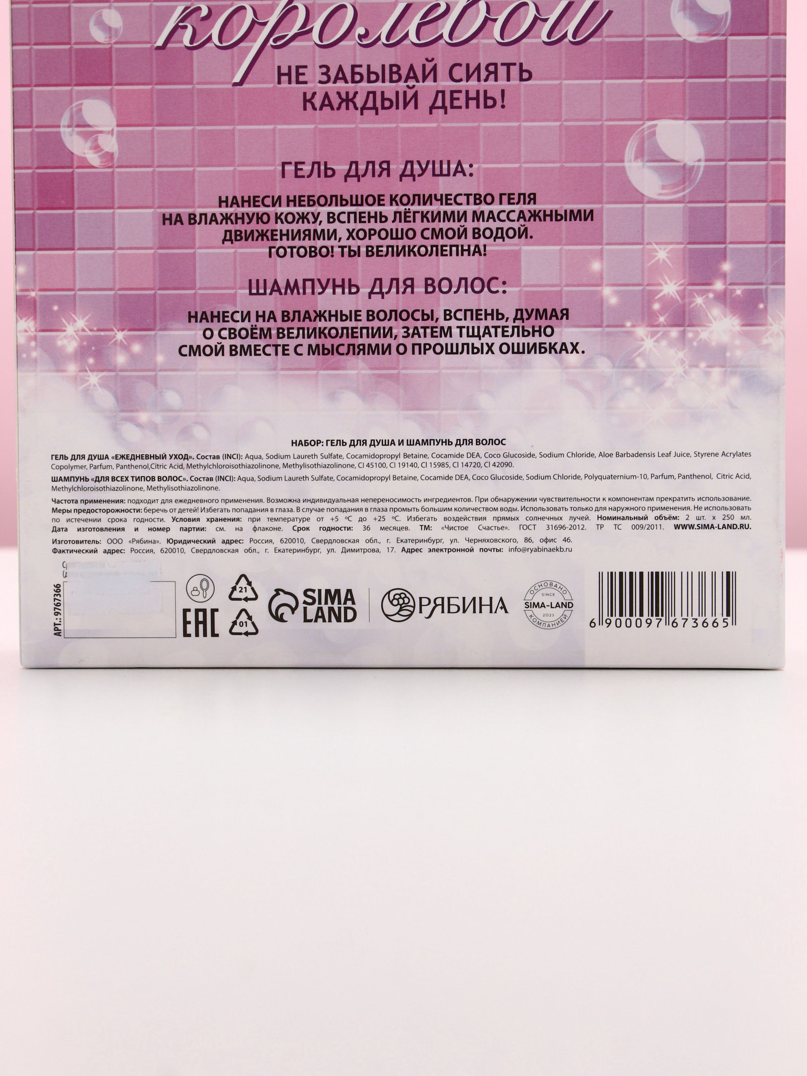 Цвет: Прозрачный, Розовый Область применения: Для волос, Для головы, Для тела, Для тела Вид: Гель, Гель для душа, Шампунь, Шампунь Возраст: Взрослый, Для взрослых, Для всех возрастов Составляющие набора: Гель для душа, Шампунь Размер упаковки: 17 x 20 x 5.5 см. Темпер. ограничение НЕ ВЫШЕ ℃: +25 Тематика: Новогодняя Назначение: Очищение, детокс Эффект: Очищение Форма выпуска: Флакон без дозатора Символ года: Нет Вид шампуня: Жидкий Аромат: Фруктовый микс Тип волос: Для всех типов Набор: Да Адресат: Без адресата Вес, г/Объём, мл: 250 Вид упаковки: Коробка картонная Тематика праздника: Новый год Темпер. ограничение НЕ НИЖЕ ℃: +5 tnved: 3401300000 tnved: 3401300000 Для кого: Для женщины В наборе, шт.: 2 Тематика подарка: Уходовая косметика | ||