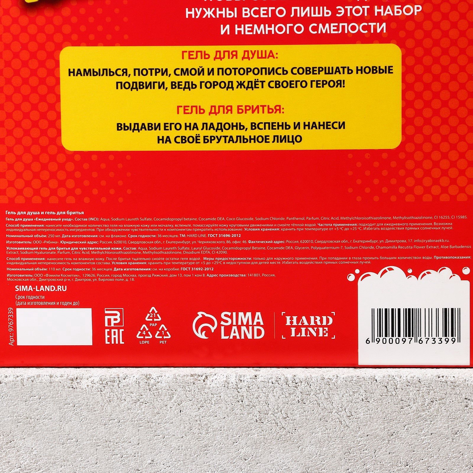 Объём, мл: 110, 250 Область применения: Для лица, Для лица, Для тела, Для тела Вид: Гель, Гель для бритья, Гель для душа Вес, г/Объём, мл: 110, 250 Возраст: Взрослый, Для взрослых, Для всех возрастов Составляющие набора: Гель для бритья, Гель для душа Размер упаковки: 17.5 x 20 x 5.5 см. Темпер. ограничение НЕ ВЫШЕ ℃: +25 Набор: Да Аромат: Парфюм Форма выпуска: Флакон без дозатора Тип кожи: Для всех типов Тематика: Новогодняя Применение: Для бритья Назначение: Очищение, детокс Символ года: Нет Адресат: Без адресата Тематика праздника: Универсальная тематика Темпер. ограничение НЕ НИЖЕ ℃: +5 Цвет: Разноцветный Вид упаковки: Подарочная коробка Вид упаковки: Подарочная коробка tnved: 3401300000 В наборе, шт.: 2 Для кого: Для мужчины Тематика подарка: Уходовая косметика | ||