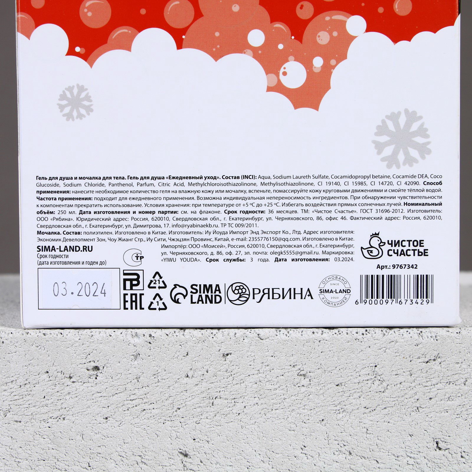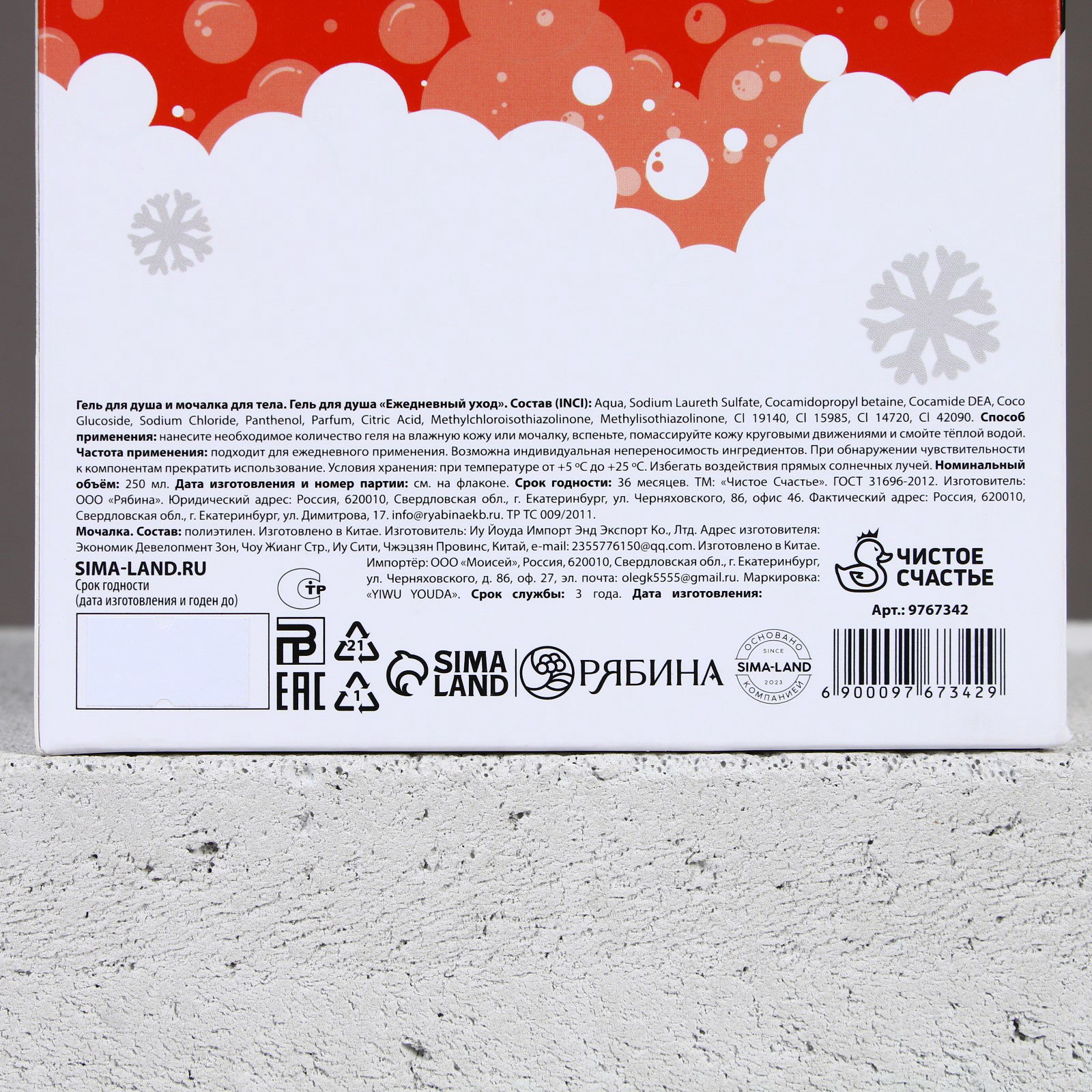 Область применения: Для тела, Для тела Вид: Гель, Гель для душа, Мочалка для тела Возраст: Взрослый, Для взрослых, Для всех возрастов Составляющие набора: Гель для душа, Мочалка Размер упаковки: 13.5 x 5.5 x 18.5 см. Тематика праздника: Новый год Темпер. ограничение НЕ ВЫШЕ ℃: +25 Набор: Да Тематика: Новогодняя Символ года: Нет Форма выпуска: Флакон без дозатора Назначение: Очищение, детокс Адресат: Без адресата Вес, г/Объём, мл: 250 Темпер. ограничение НЕ НИЖЕ ℃: +5 Цвет: Разноцветный Вид упаковки: Подарочная коробка tnved: 3401300000 tnved: 3401300000 Запрет реализации по сегментам: 00000000534 В наборе, шт.: 2 Для кого: Для мужчины Тематика подарка: Уходовая косметика Аромат: Виски | ||