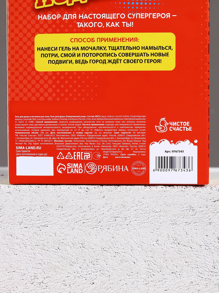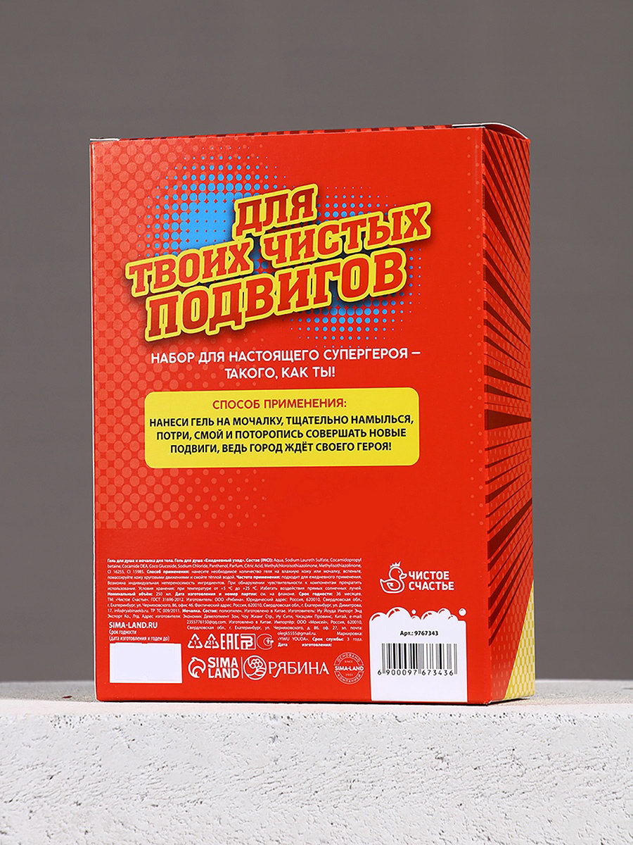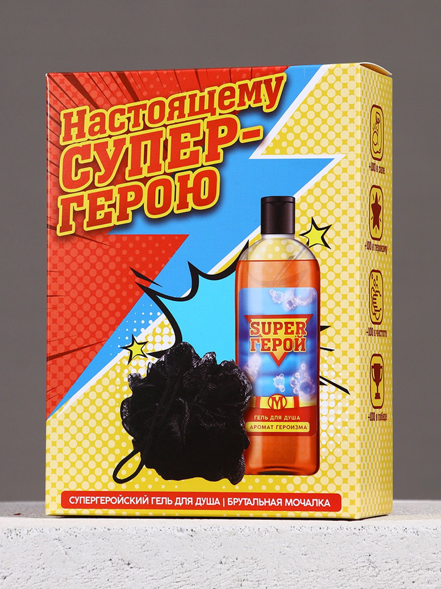 Подарочный набор мужской "Супер-герою", гель для душа 250 мл и мочалка для тела, 250 мл., Чистое счастье, Россия
