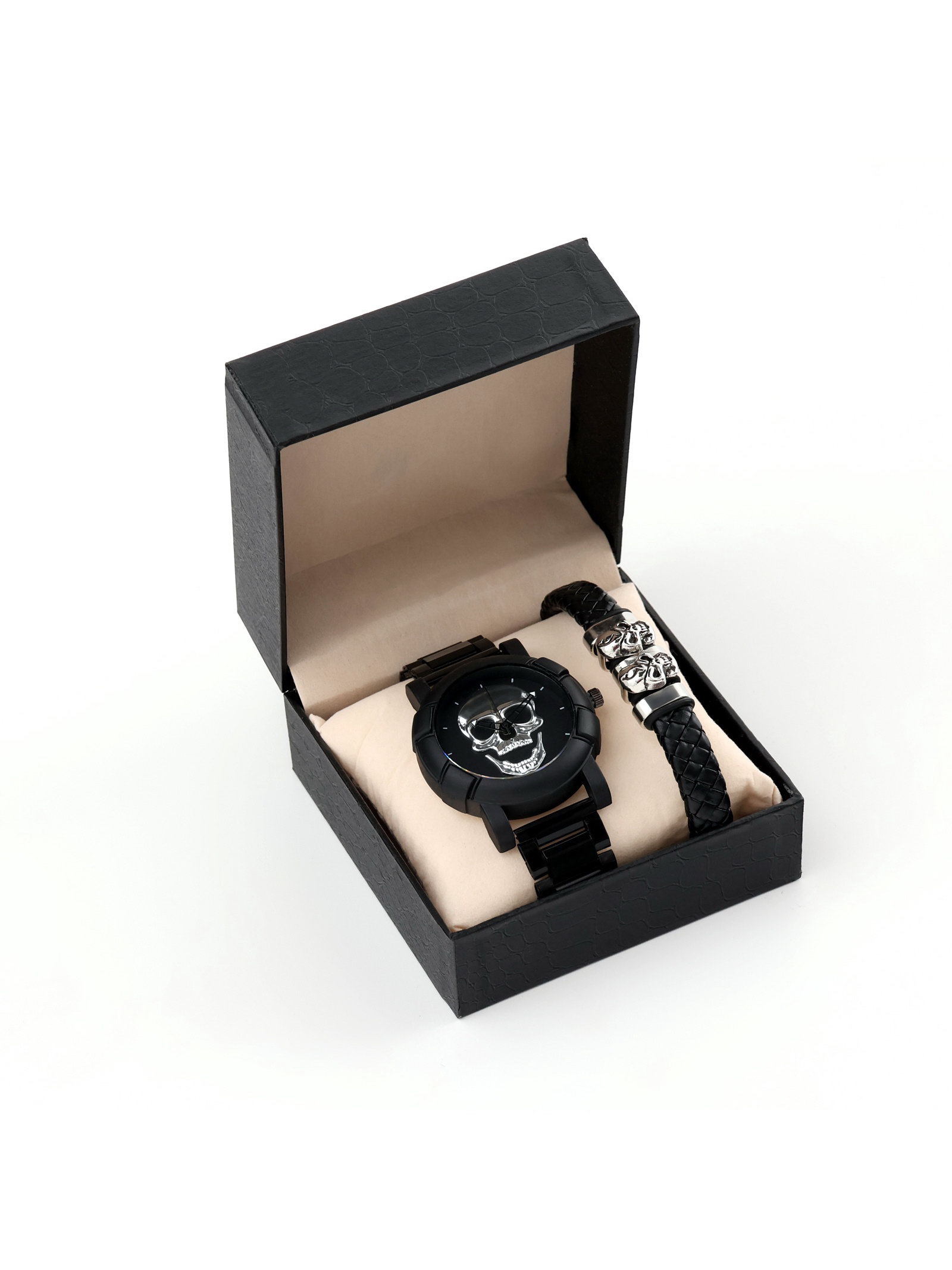Мужской подарочный набор "Череп" 2 в 1: наручные часы, браслет, серебристый, Китай