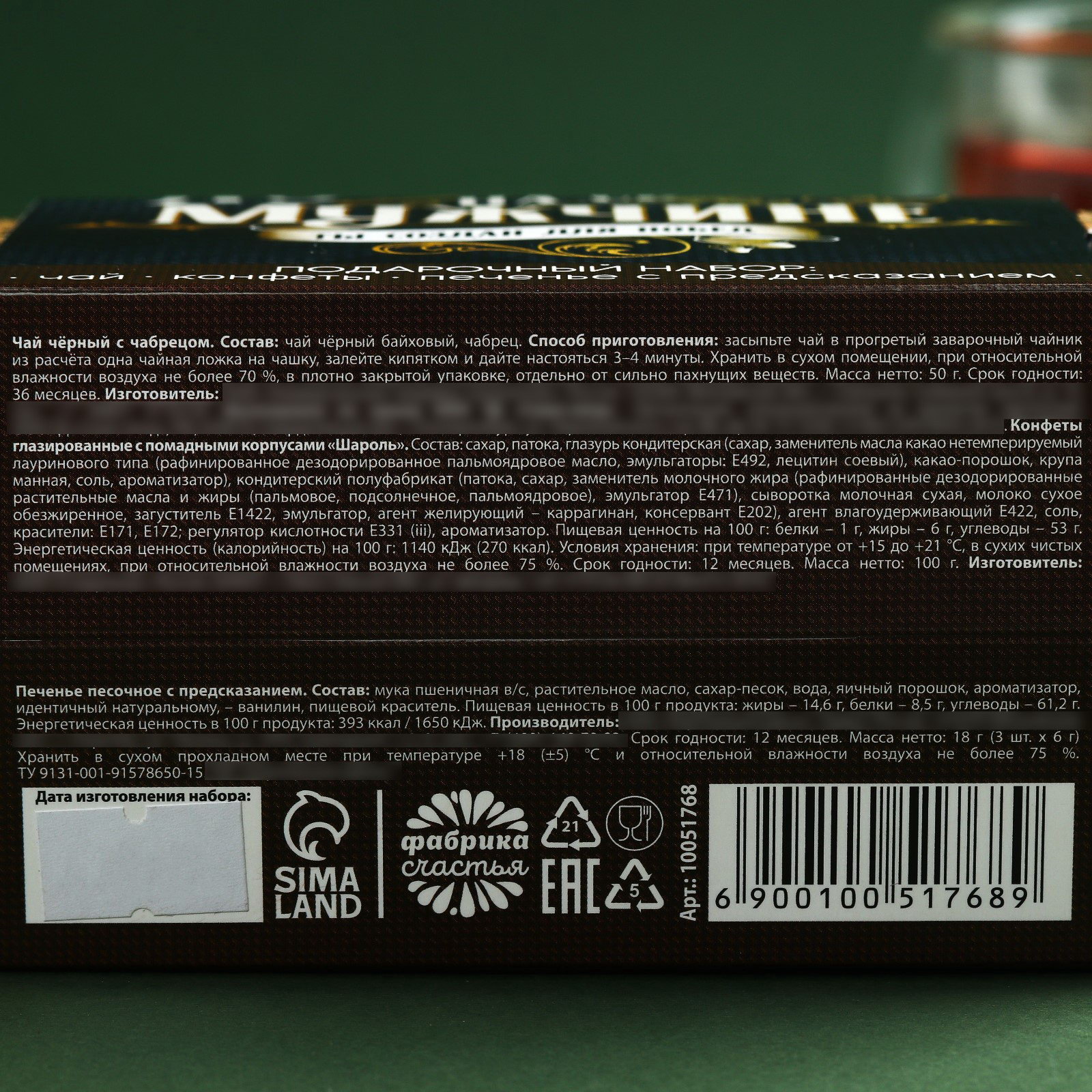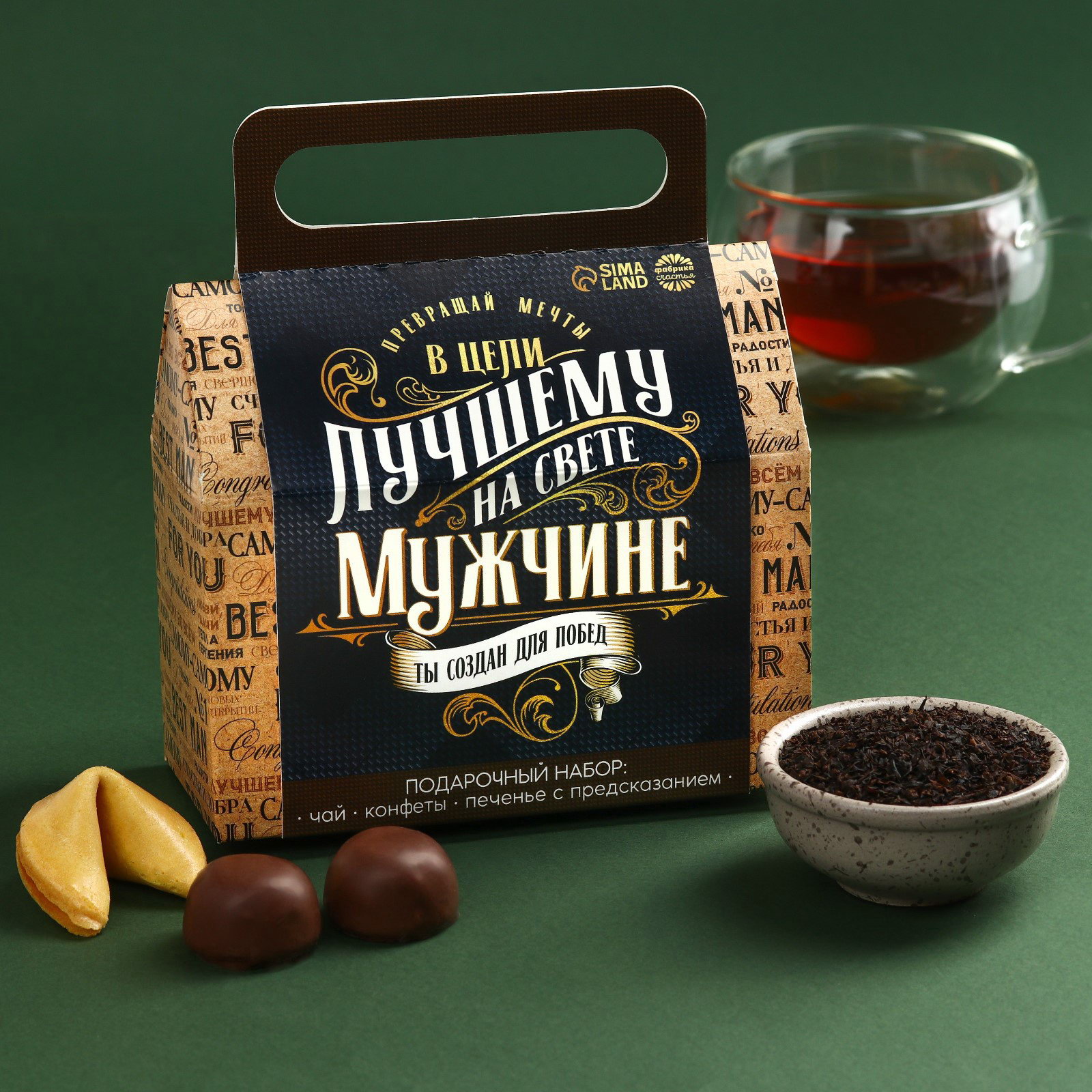 Набор "Лучшему на свете мужчине": чай чёрный с чабрецом 50 гр, конфеты шоколадные с начинкой 100 гр, печенье с предсказаниями, Фабрика счастья, Россия