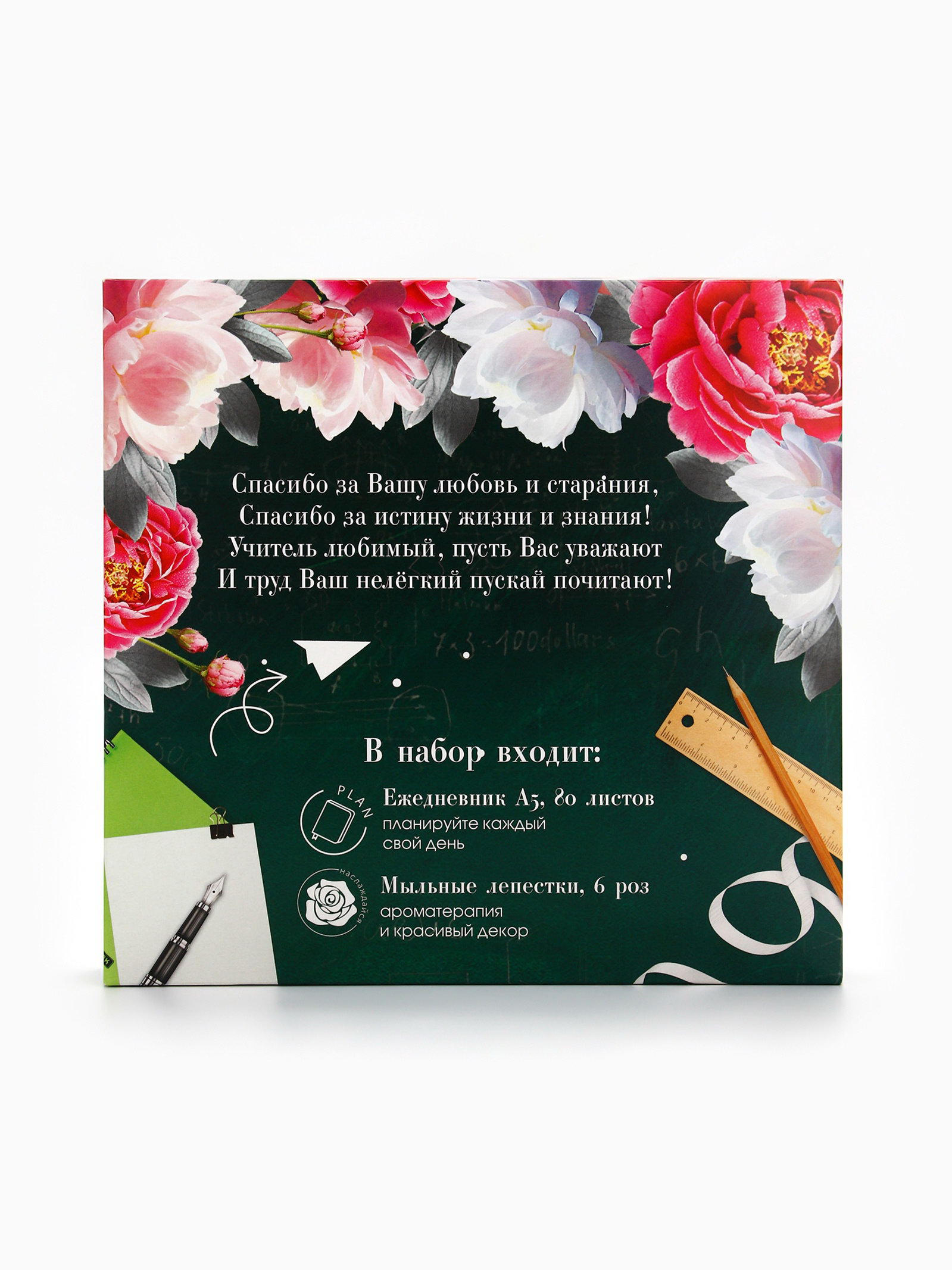 Составляющие набора: Ежедневник, Мыльные лепестки Размер упаковки: 23.5 x 22.2 x 4 см. Для кого: Для женщины Адресат: Учителю Возраст: Для взрослых Тематика праздника: День учителя Формат: А5 Цвет: Зелёный В наборе, шт.: 7 Тематика подарка: Канцтовары Вид упаковки: Плёнка Вид упаковки: Плёнка tnved: 4820109000 Подарочный набор станет отличным подарком на праздник. Ежедневник