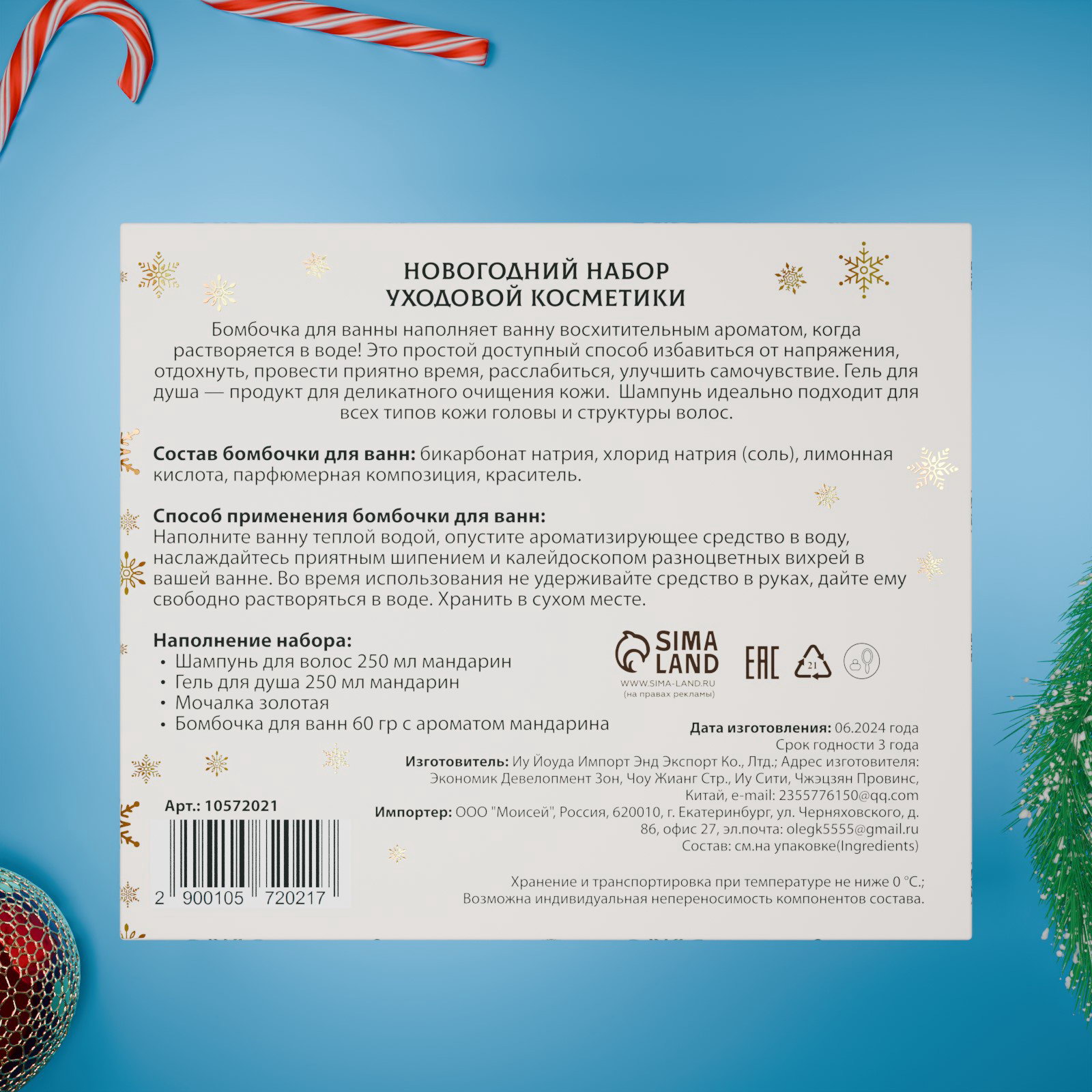 Назначение: Питание и восстановление, Увлажнение Тематика праздника: Новый год, Рождество Составляющие набора: Бомбочка для ванн, Гель для душа, Мочалка, Шампунь Возраст: Взрослый, Для взрослых, Подростковый Тематика: Новогодняя, Рождественская Размер упаковки: 5.2 x 19.6 x 23 см. Набор: Да Для кого: Унисекс Форма выпуска: Флакон без дозатора Вид упаковки: Картонная упаковка Адресат: Без адресата Тематика подарка: Уходовая косметика В наборе, шт.: 4 Символ года: Нет Аромат: Мандарин Аромат: Мандарин Аромат: Мандарин tnved: 3401300000 Новогодний подарочный набор косметики SB Beauty идеальный подарок для создания уюта и праздника в зимнее время. Этот набор включает всё необходимое для комфортного и приятного ухода за собой, делая его незаменимым для подарков на Новый год. Состав набора: