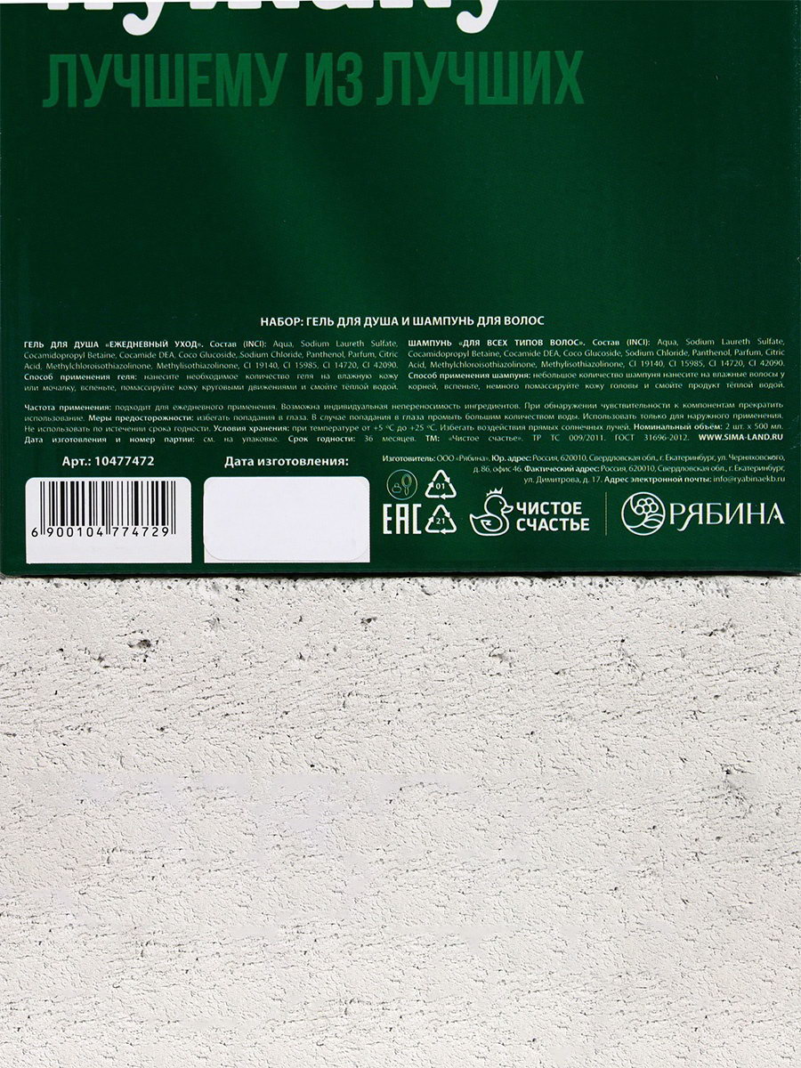 Аромат: Кедр, Можжевельник Возраст: Взрослый, Для взрослых Составляющие набора: Гель для душа, Шампунь Область применения: Для волос, Для головы, Для тела, Для тела Форма выпуска: Флакон без дозатора, Формовые Вид: Гель, Шампунь Размер упаковки: 14.5 x 30.5 x 8 см. В наборе, шт.: 2 Тематика праздника: Универсальная тематика Тематика подарка: Уходовая косметика Для кого: Для мужчины Назначение: Очищение, детокс Набор: Да Темпер. ограничение НЕ НИЖЕ ℃: +5 Темпер. ограничение НЕ ВЫШЕ ℃: +25 Эффект: Очищение Вид шампуня: Жидкий Тип волос: Для всех типов Символ года: Нет Цвет: Зелёный В упаковке, шт.: 2 Вид упаковки: Подарочная коробка Адресат: Без адресата Адресат: Без адресата tnved: 3401300000 | ||