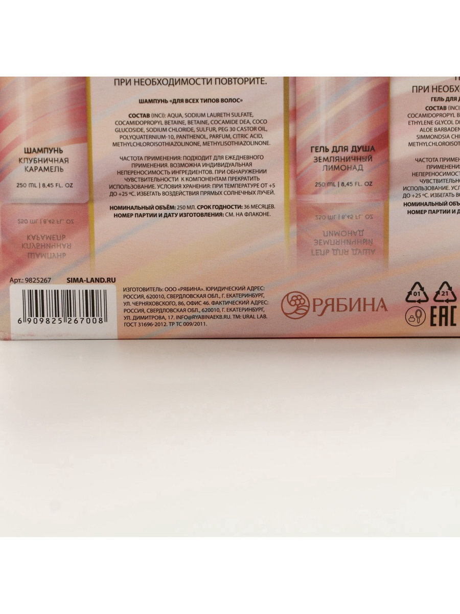 Аромат: Земляничный лимонад, Карамель Возраст: Взрослый, Для взрослых Составляющие набора: Гель для душа, Шампунь Область применения: Для волос, Для тела Вид: Гель для душа, Шампунь Размер упаковки: 14.5 x 20 x 7.5 см. В наборе, шт.: 2 Тематика праздника: Универсальная тематика Вид упаковки: Подарочная коробка Адресат: Без адресата Тематика подарка: Уходовая косметика Для кого: Для женщины Назначение: Очищение, детокс Набор: Да Темпер. ограничение НЕ НИЖЕ ℃: +5 Темпер. ограничение НЕ ВЫШЕ ℃: +25 Вид шампуня: Жидкий Форма выпуска: Флакон без дозатора Цвет: Бежевый Эффект: Очищение Тип волос: Для всех типов Тип волос: Для всех типов tnved: 3401300000 | ||