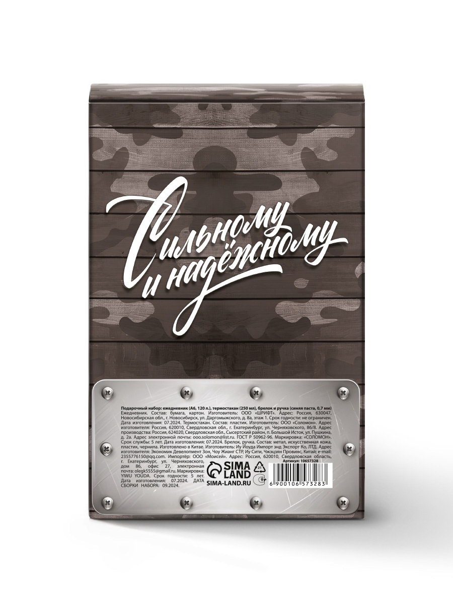 Составляющие набора: Брелок, Ежедневник, Ручка, Термостакан Размер упаковки: 12 x 18 x 9 см. Темпер. ограничение НЕ НИЖЕ ℃: -10 Формат: А6 Вид упаковки: Коробка Тематика праздника: 23 Февраля Для кого: Для мужчины Тематика подарка: Канцтовары Возраст: Для взрослых В наборе, шт.: 4 В наборе, шт.: 4 tnved: 4820103000 | ||