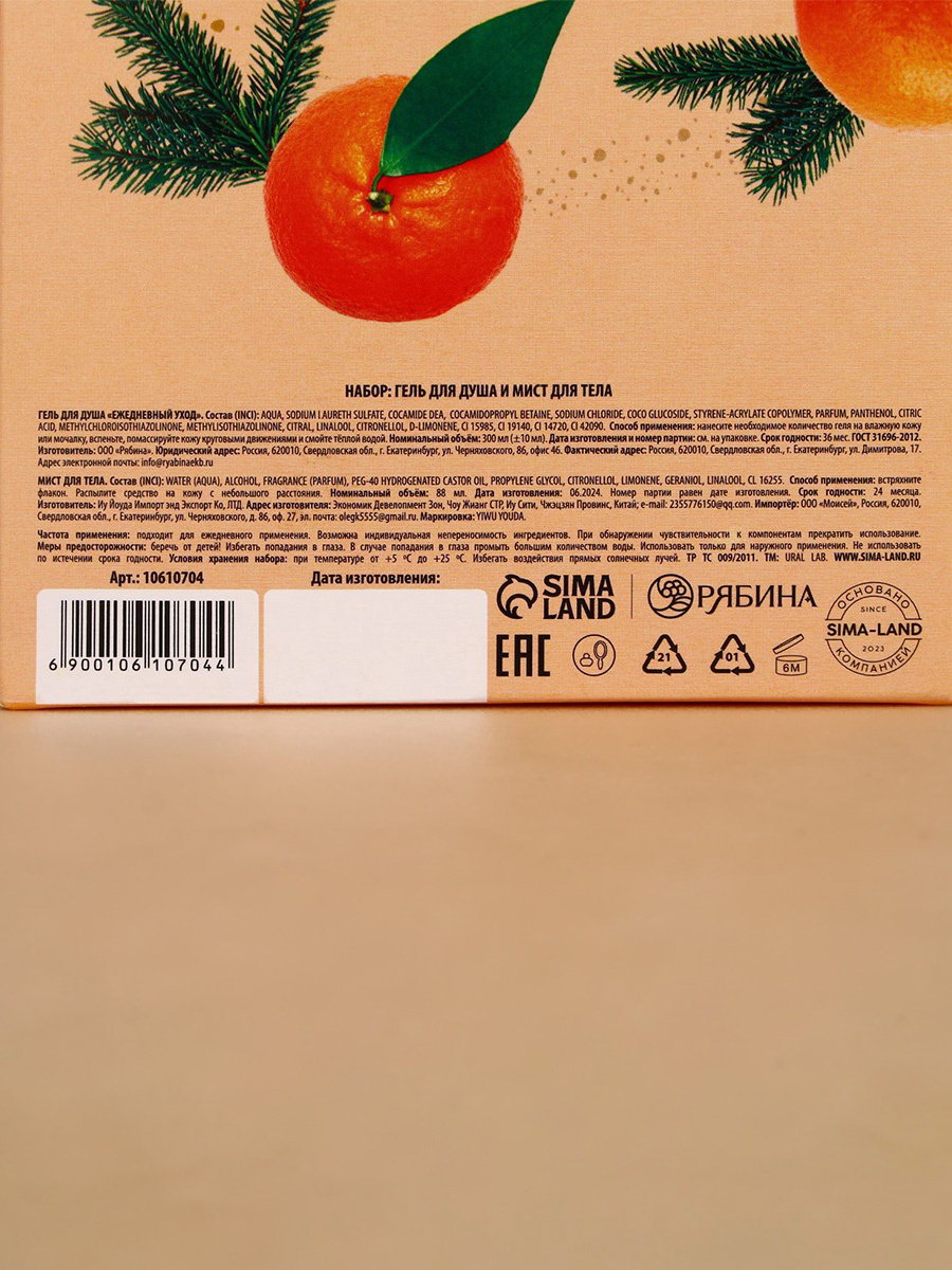 Составляющие набора: Гель для душа, Мист Возраст: Взрослый, Для взрослых Аромат: Сливочный мандарин, Снежный маршмеллоу Назначение: Очищение, детокс, Тонизирование Объём, мл: 88, 300 Размер упаковки: 11.5 x 22.5 x 4.5 см. В наборе, шт.: 2 Тематика подарка: Уходовая косметика Тематика праздника: Новый год Для кого: Для женщины Адресат: Без адресата Вид упаковки: Картонная упаковка Темпер. ограничение НЕ ВЫШЕ ℃: +25 Символ года: Нет Темпер. ограничение НЕ НИЖЕ ℃: +5 Набор: Да Область применения: Для тела Форма выпуска: Флакон без дозатора tnved: 3401300000