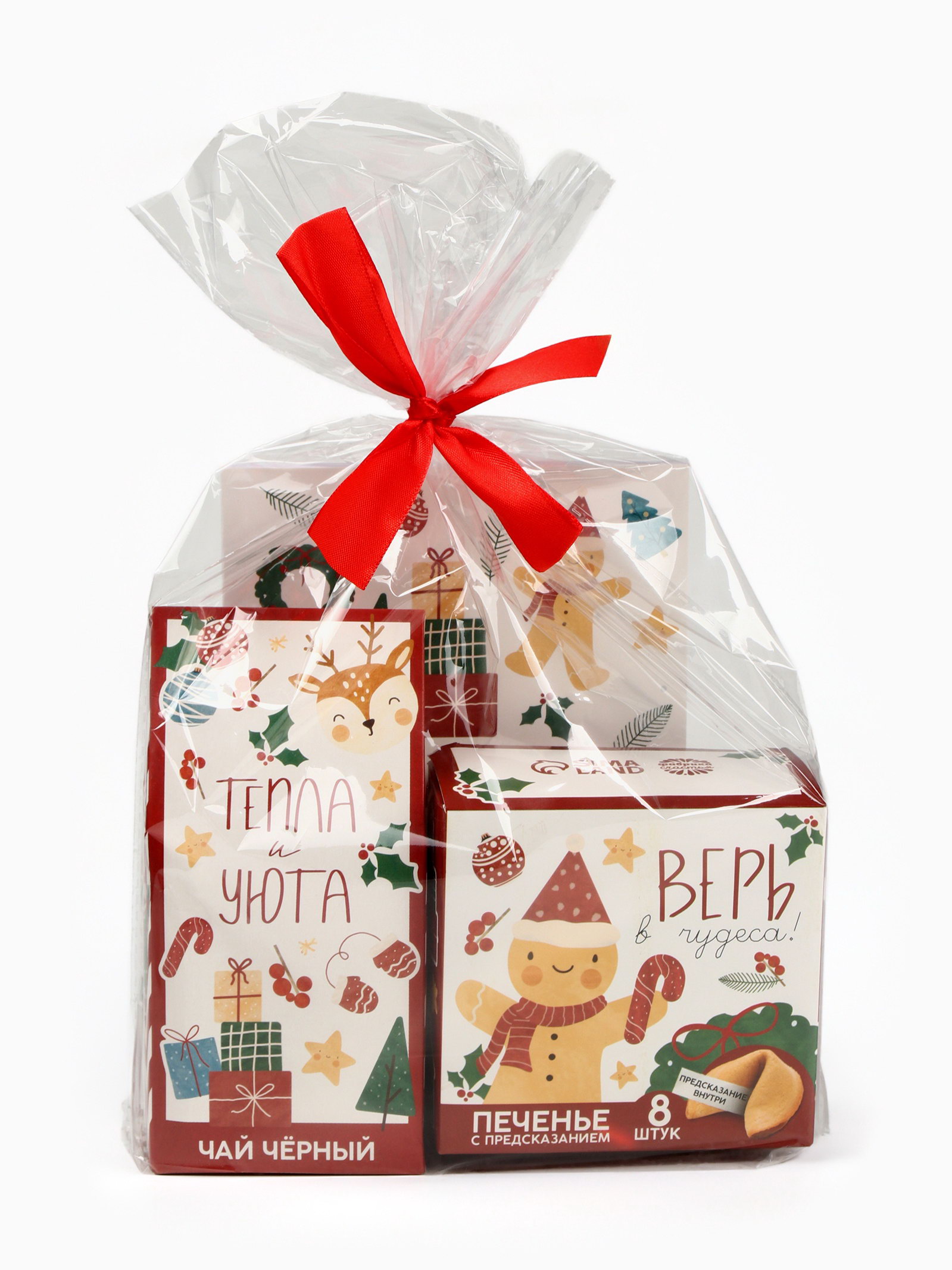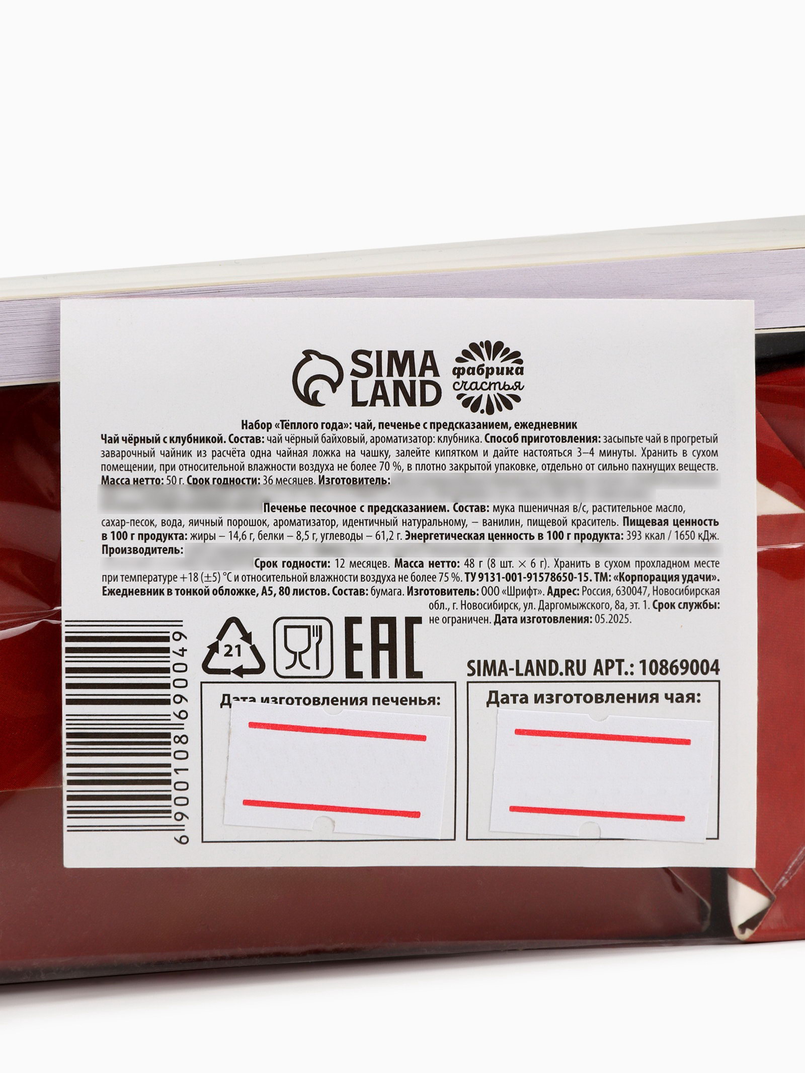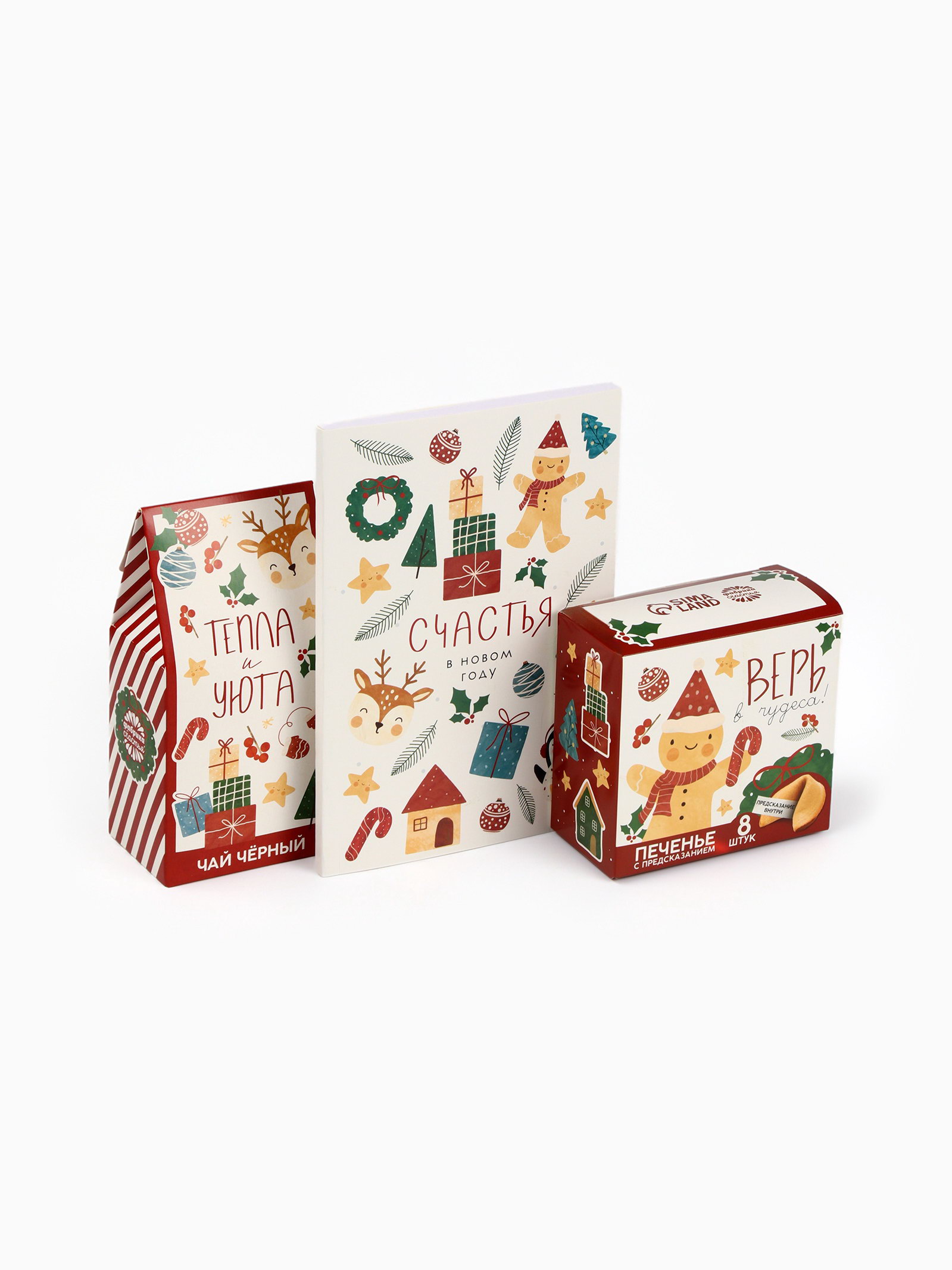 Подарочный набор новогодний: чай 50 г, печенье с предсказанием 8 шт., ежедневник "Тепла и уюта", Фабрика счастья, Россия