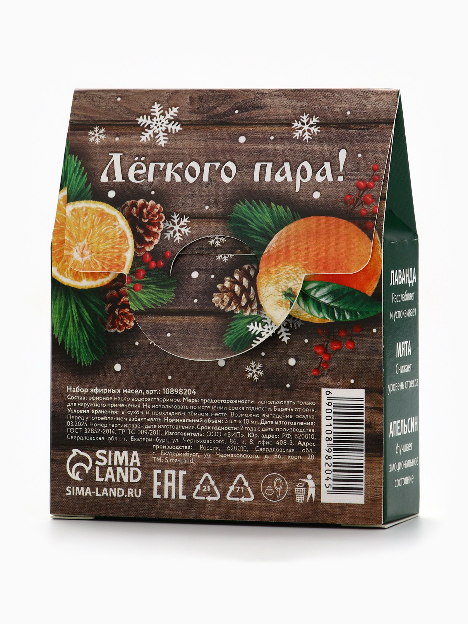 Возраст: Взрослый, Для взрослых Для кого: Для женщины, Для мужчины Аромат: Апельсин, Лаванда, Мята Размер упаковки: 7.5 x 9.5 x 2.5 см. tnved: 3301294000 Составляющие набора: Эфирное масло Адресат: Без адресата Символ года: Нет Тематика праздника: Новый год Тематика подарка: Баня и сауна Вид упаковки: Подарочная коробка В наборе, шт.: 3 Набор: Да | ||