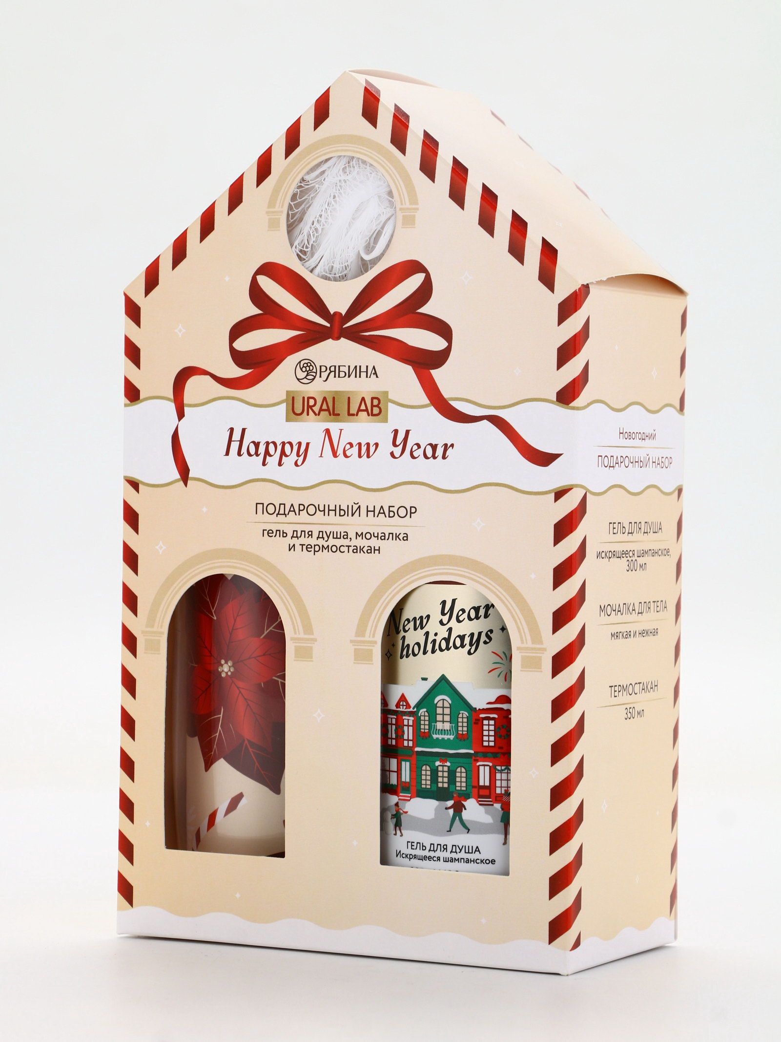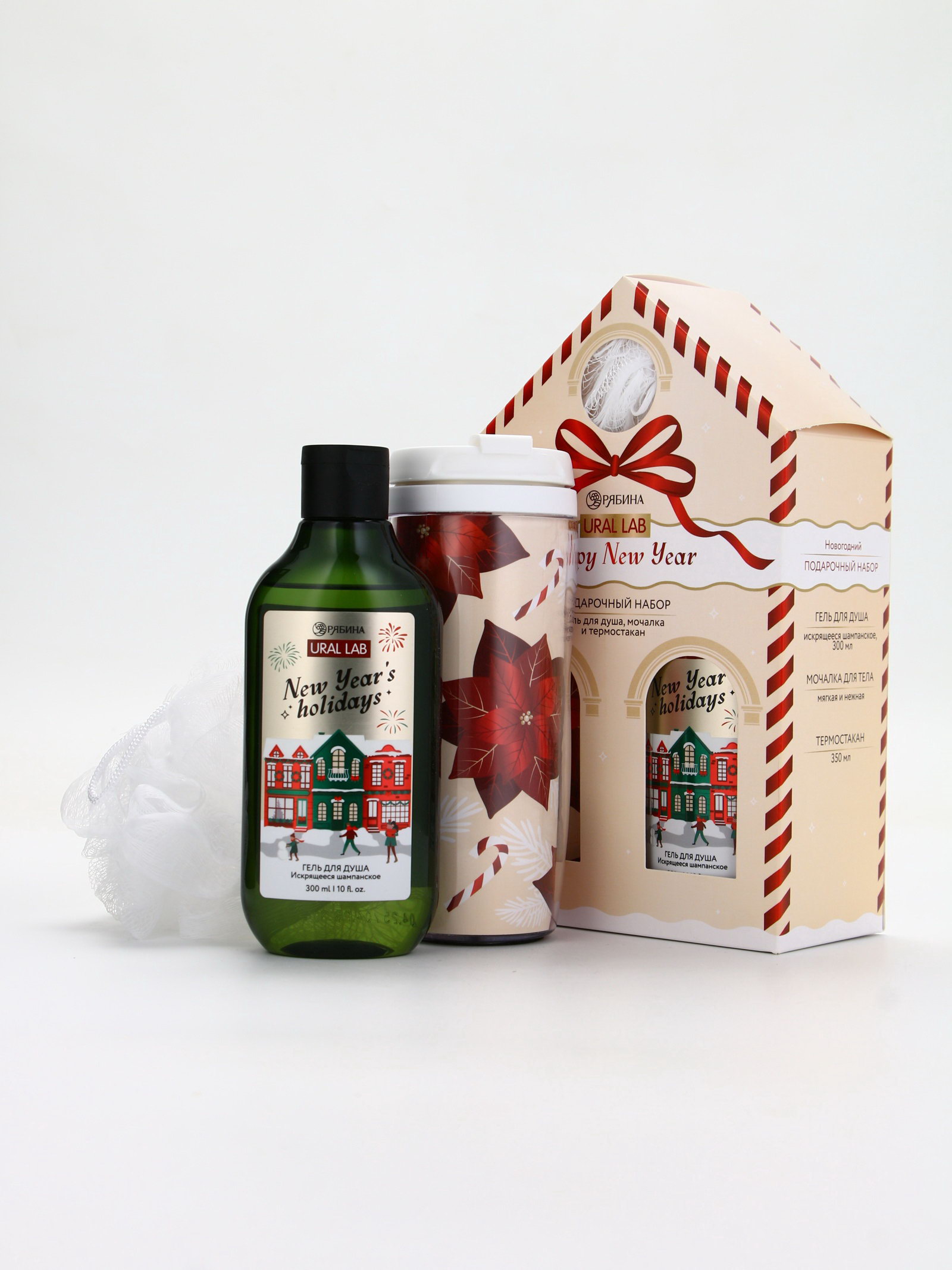 Подарочный набор новогодний Happy New Year: гель для душа, мочалка и термостакан, аромат шампанское, URAL LAB, Россия