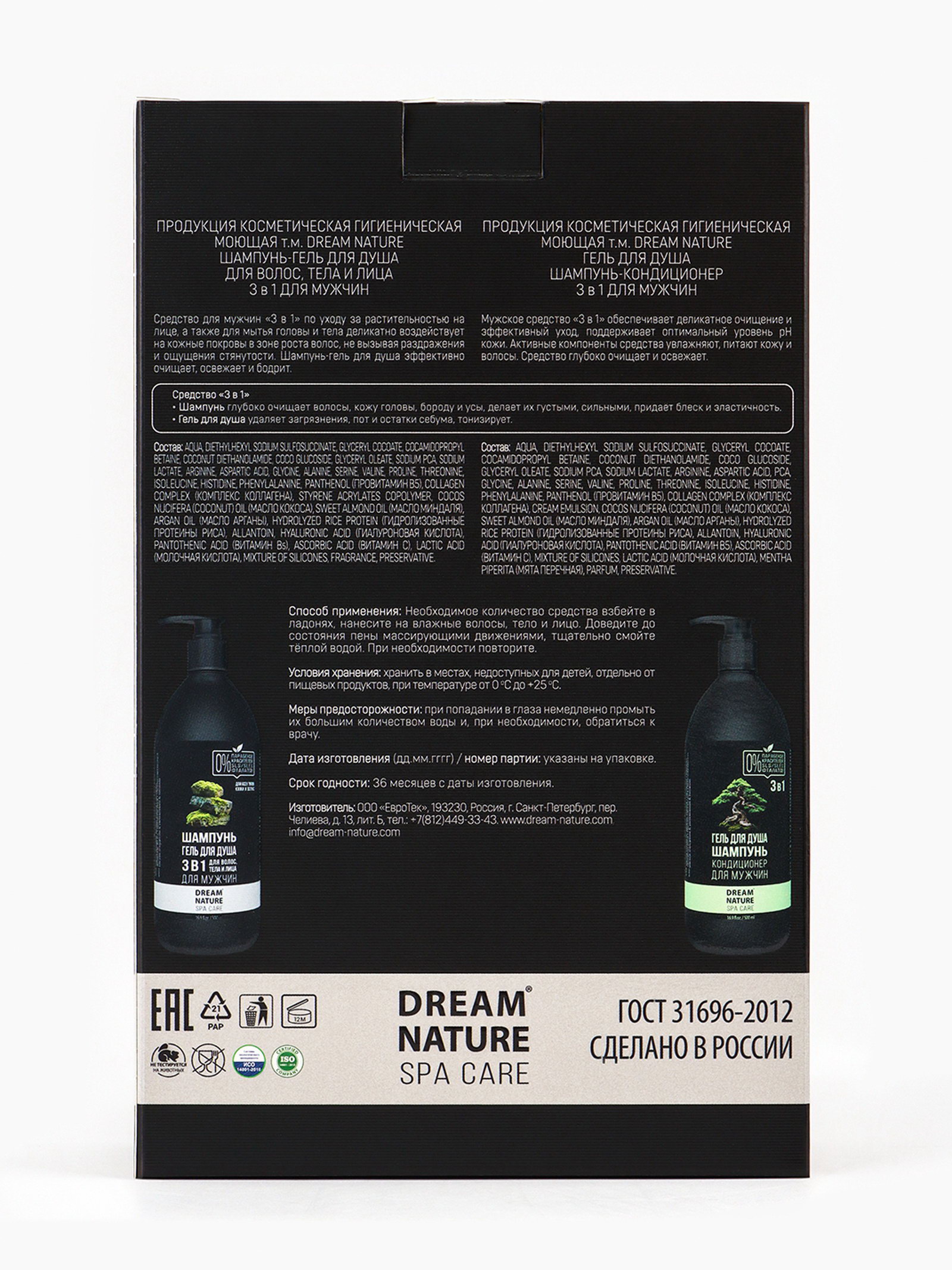 Составляющие набора: Гель для душа, Шампунь Возраст: Взрослый, Для взрослых Область применения: Для волос, Для кожи головы, Для тела Размер упаковки: 13.5 x 7 x 21.5 см. tnved: 3305100000 Температурное ограничение: Нет Вид упаковки: Коробка картонная Для кого: Для мужчины Тематика праздника: Универсальная тематика В наборе, шт.: 2 Тематика подарка: Гигиена Аромат: Свежесть Адресат: Без адресата Состав: шампунь 500 мл, гель для душа 500 мл Подарите себе или близкому мужчине истинное наслаждение заботой о теле с подарочным набором DREAM NATURE SPA CARE "Японские мотивы". Этот набор сочетает традиции японского ухода с современными SPA-технологиями, позволяя окунуться в атмосферу гармонии, свежести и внутреннего равновесия. Каждый компонент набора разработан с вниманием к мужской коже и волосам. Шампунь 500 мл мягко очищает волосы и кожу головы, укрепляет корни, придаёт волосам естественный блеск и шелковистость, не пересушивая кожу. Натуральные экстракты, вдохновлённые японскими традициями, способствуют восстановлению и поддержанию здоровья волос, а аромат создает ощущение свежести и бодрости с утра до вечера. Гель для душа 500 мл превращает ежедневное принятие душа в настоящее SPA-ритуальное очищение. Лёгкая текстура образует мягкую пену, которая эффективно смывает загрязнения, увлажняет кожу и наполняет её деликатным ароматом восточной свежести. Экстракты японских растений, включенные в состав, помогают снять напряжение после долгого дня, оставляя ощущение комфорта и гармонии. Преимущества набора:
