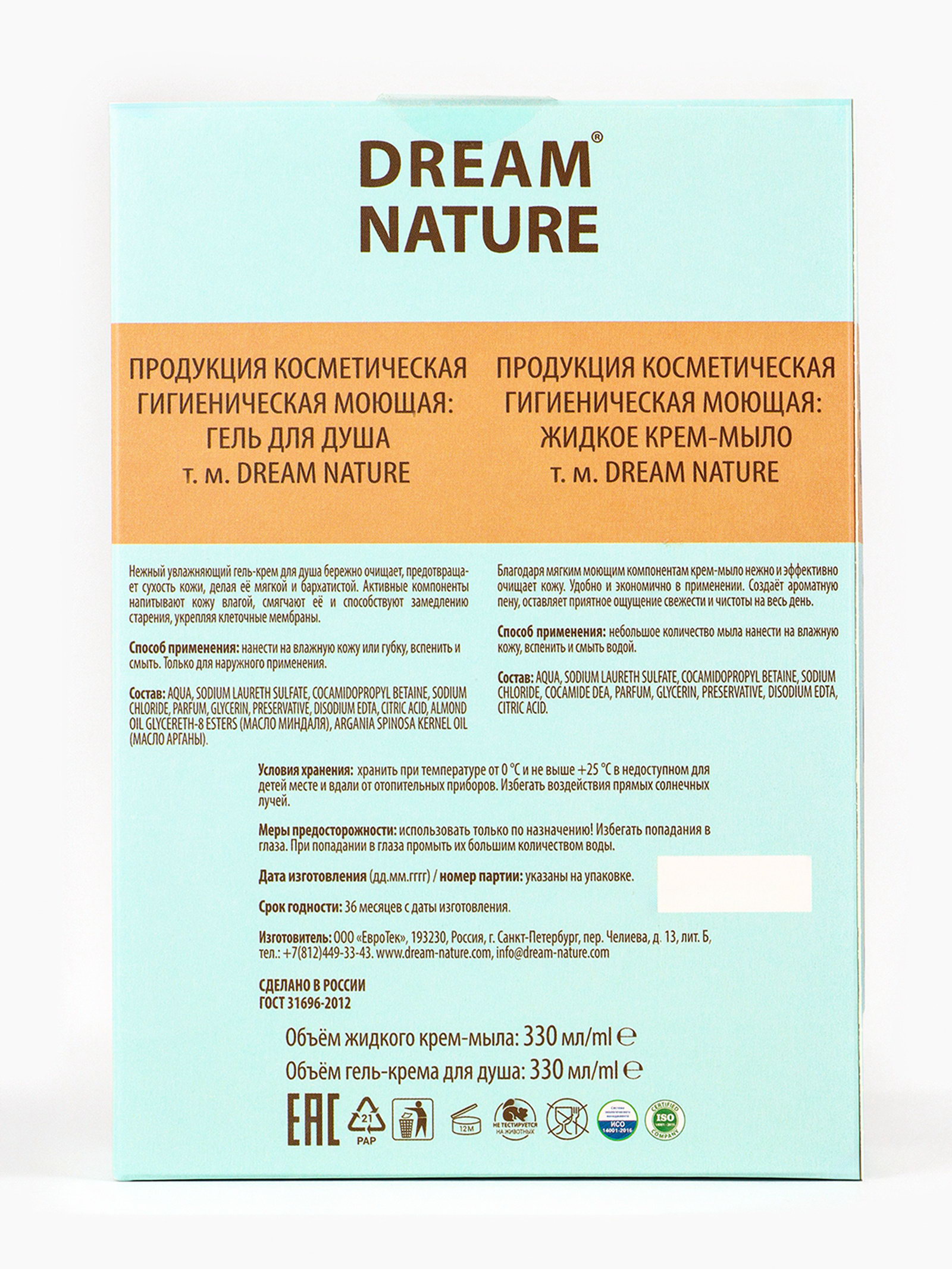 Аромат: Амбра, Восточные специи, Древесные ноты Возраст: Взрослый, Для взрослых Составляющие набора: Гель для душа, Мыло Размер упаковки: 12.5 x 6.5 x 17.5 см. tnved: 3305100000 Температурное ограничение: Нет Вид упаковки: Коробка картонная Для кого: Для женщины Тематика праздника: Универсальная тематика В наборе, шт.: 2 Тематика подарка: Гигиена Адресат: Без адресата Состав: жидкое крем-мыло 330 мл, крем-гель для душа 330 мл Подарите себе или близкой женщине роскошный уход с подарочным набором DREAM NATURE "Baccarat", вдохновлённым атмосферой изысканности и элегантности. Этот набор превращает ежедневный уход в настоящий SPA-ритуал, наполняя пространство ароматами утончённой свежести и создавая ощущение роскоши и гармонии. Жидкое крем-мыло 330 мл мягко очищает кожу рук, увлажняет и питает её, не нарушая естественный баланс. Лёгкая кремовая текстура превращается в бархатистую пену, оставляя кожу гладкой, мягкой и нежной на ощупь. Крем-гель для душа 330 мл бережно очищает кожу тела, создавая густую и плотную пену, которая эффективно смывает загрязнения, увлажняет и дарит ощущение комфорта. Уникальная формула набора заботится о коже, делает её мягкой и эластичной, а аромат придаёт чувство свежести, лёгкости и элегантности. Преимущества набора:
