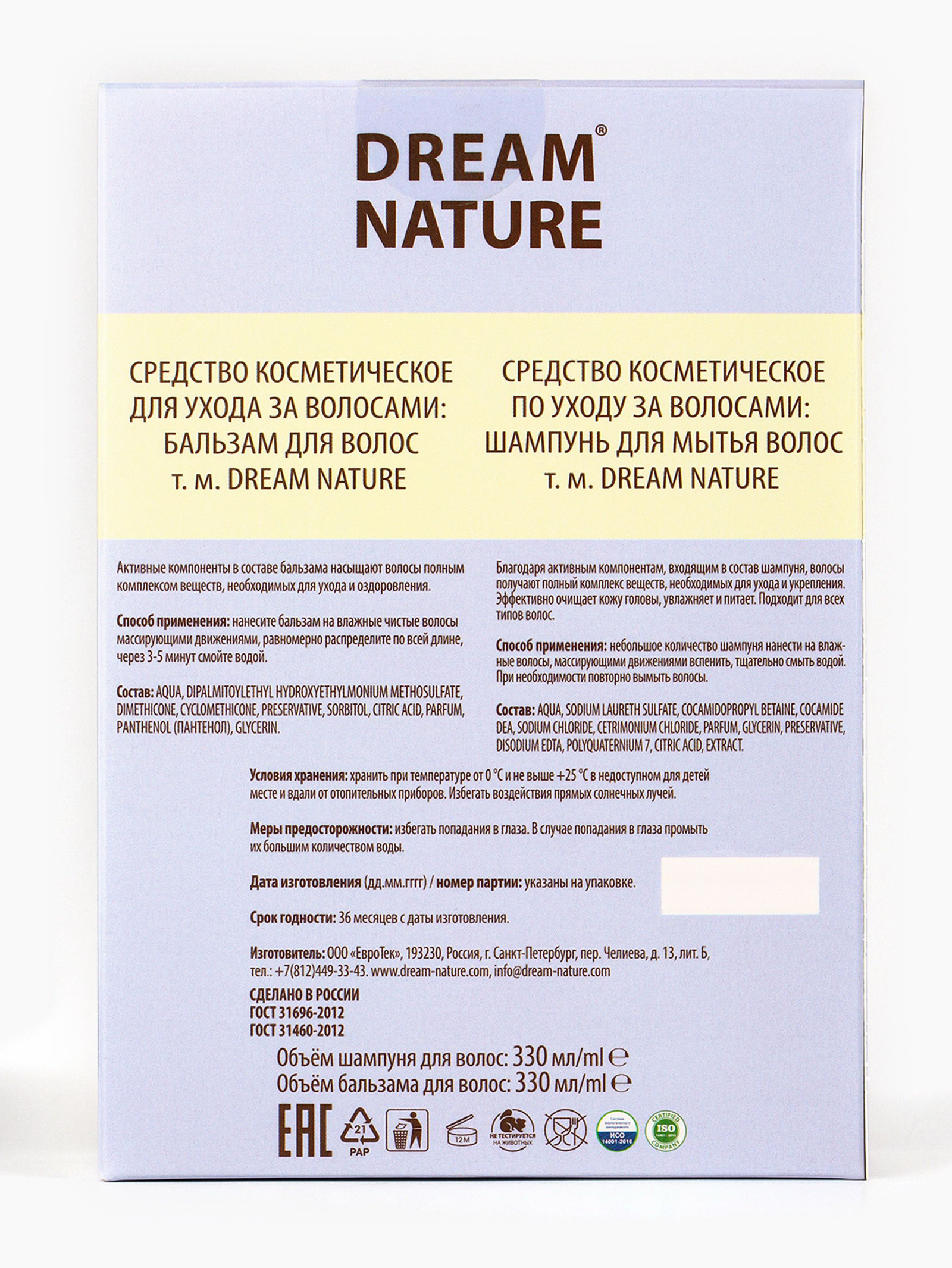 Возраст: Взрослый, Для взрослых Составляющие набора: Бальзам для волос, Шампунь Размер упаковки: 12.5 x 6.5 x 17.5 см. tnved: 3305100000 Температурное ограничение: Нет Аромат: Цветы Вид упаковки: Коробка картонная Для кого: Для женщины Тематика праздника: Универсальная тематика В наборе, шт.: 2 Тематика подарка: Гигиена Адресат: Без адресата Состав: шампунь для волос 330 мл, бальзам для волос 330 мл Подарите своим волосам роскошный уход и здоровье с подарочным набором DREAM NATURE "Diva". Этот набор создан для женщин, которые ценят красоту, силу и блеск волос, превращая ежедневный уход в полноценный SPA-ритуал. Каждое применение дарит ощущение ухоженности, мягкости и лёгкости, позволяя волосам выглядеть живыми, здоровыми и шелковистыми. Шампунь 330 мл мягко очищает волосы и кожу головы, удаляет загрязнения и излишки себума, придаёт волосам естественный объём и блеск. Формула шампуня насыщена питательными компонентами, которые укрепляют волосы от корней до кончиков, делая их более эластичными и послушными. Бальзам 330 мл завершает уход, обеспечивая глубокое питание и увлажнение волос. Он разглаживает их структуру, облегчает расчёсывание, придаёт мягкость и сияние, создавая эффект салонного ухода дома. А лёгкий аромат набора наполняет пространство чувством утончённости и гармонии. Преимущества набора: