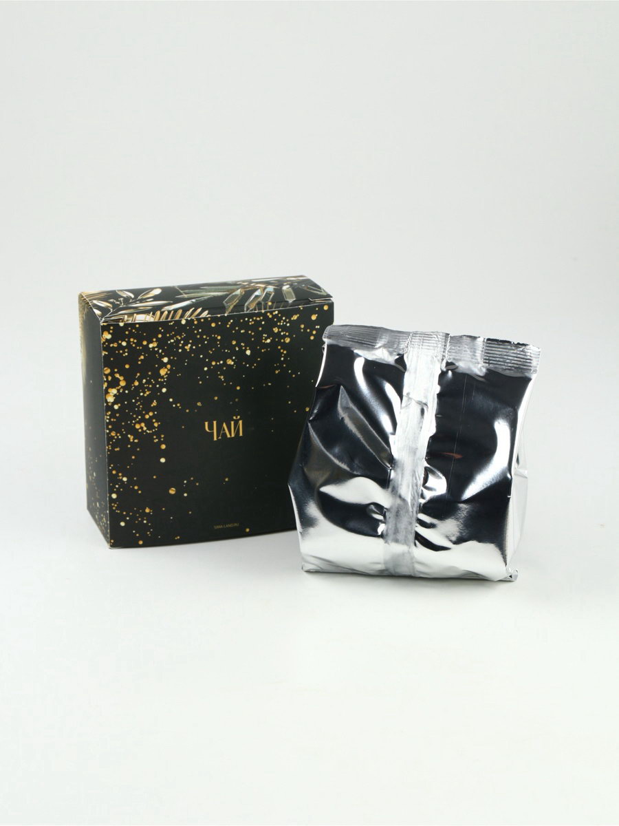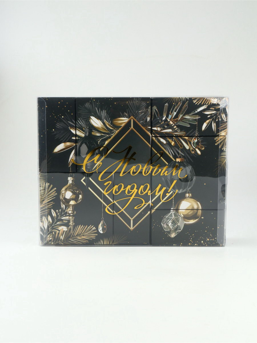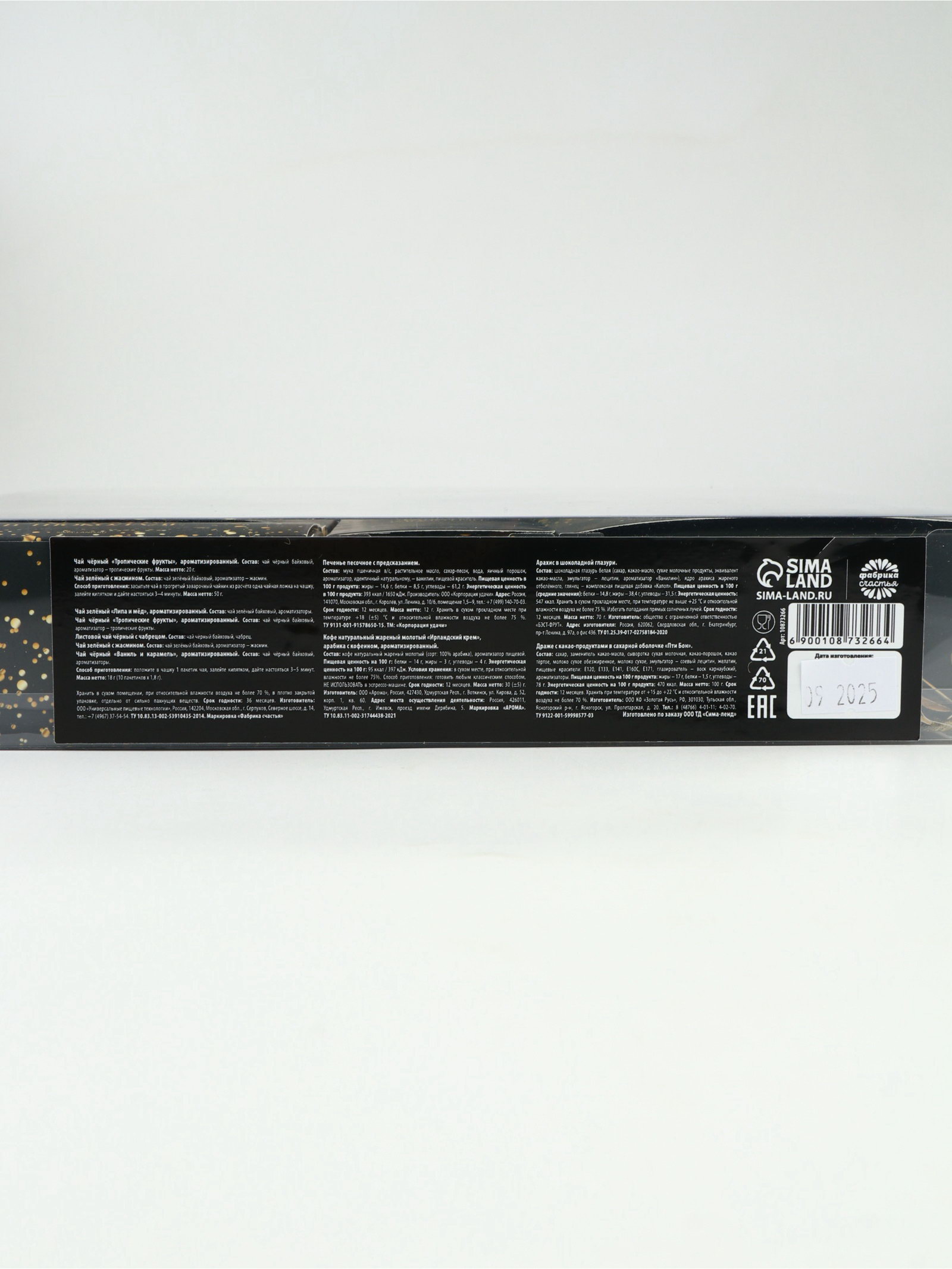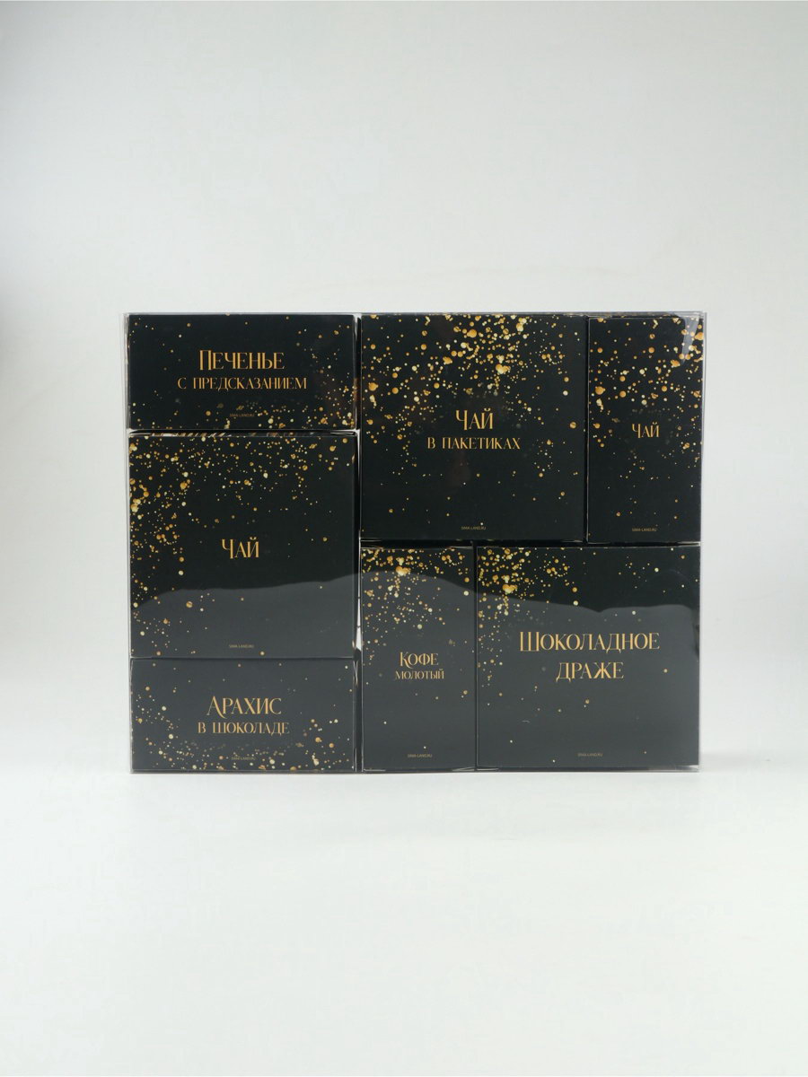 Подарочный новогодний набор "С новым годом, черно-золотой": чай чёрный/зелёный, кофе натуральный жареный молотый, печенье с предсказанием, драже, арахис в шоколадной глазури, Фабрика счастья, Россия