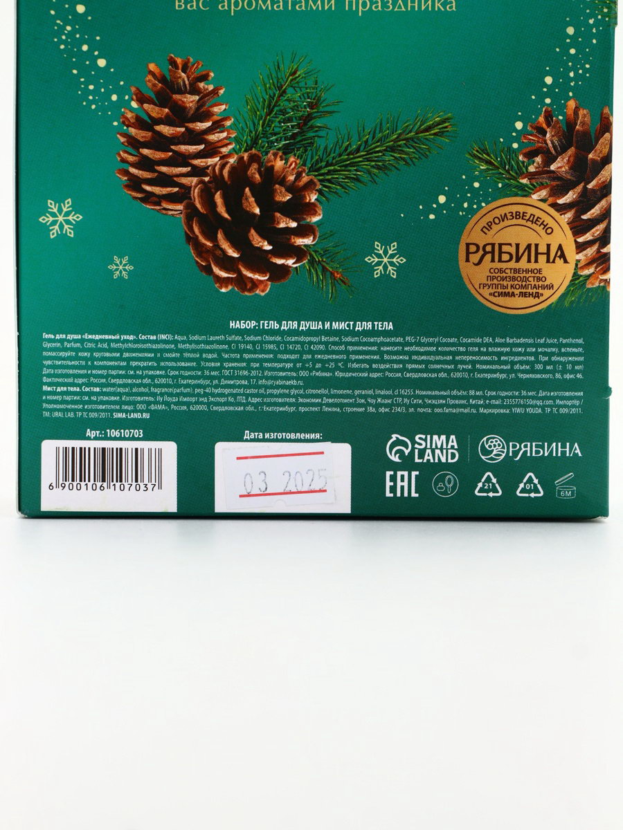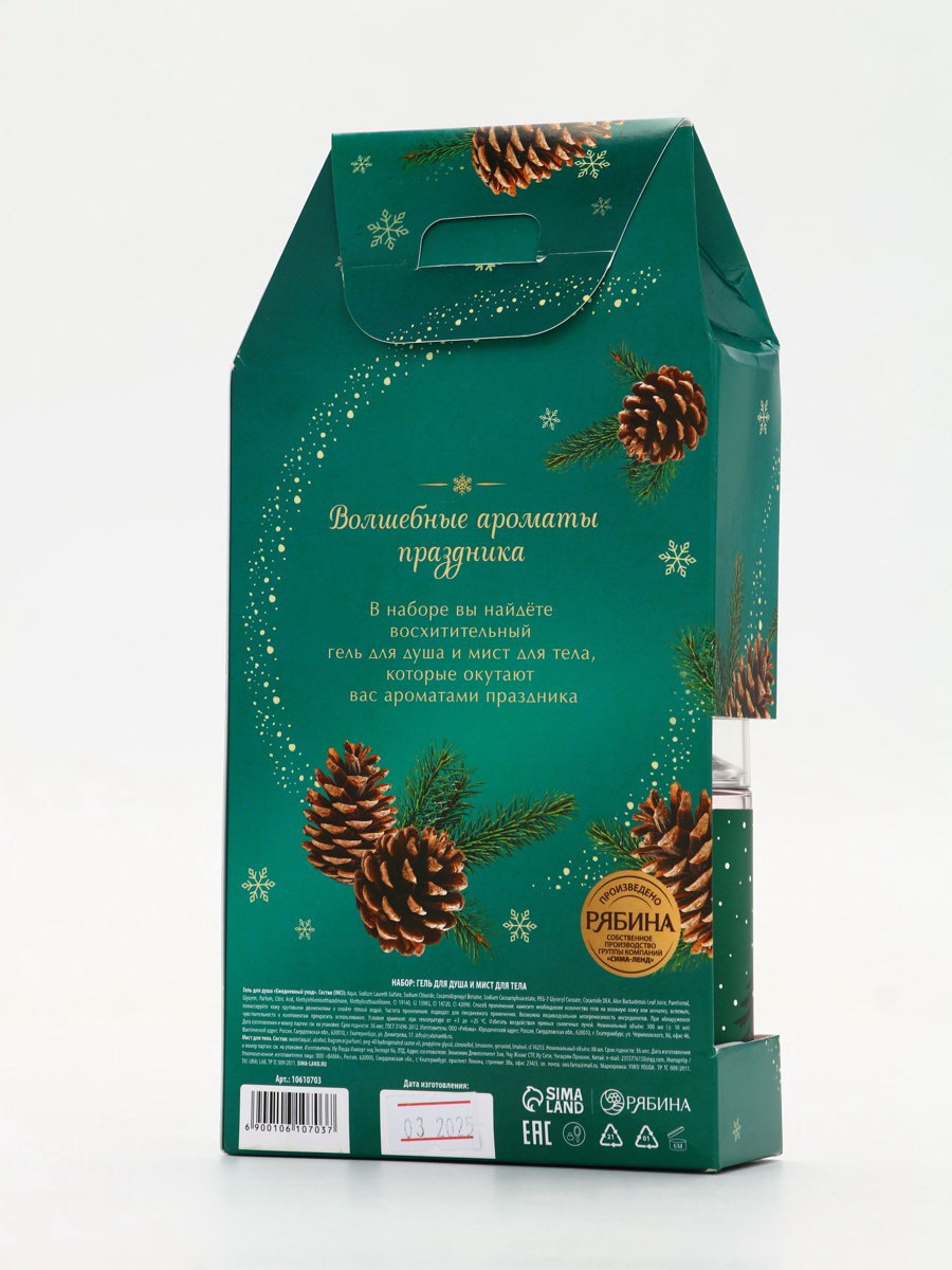 Возраст: Взрослый, Для взрослых Составляющие набора: Гель для душа, Мист Цвет: Зелёный, Прозрачный Назначение: Очищение, детокс, Тонизирование Объём, мл: 88, 300 Аромат: Сахарный леденец, Хвойный лес Размер упаковки: 11.5 x 22.5 x 4.5 см. В наборе, шт.: 2 Тематика подарка: Уходовая косметика Для кого: Для женщины Адресат: Без адресата Тематика праздника: Новый год Вид упаковки: Картонная упаковка Символ года: Нет Набор: Да Форма выпуска: Флакон без дозатора Темпер. ограничение НЕ НИЖЕ ℃: +5 Темпер. ограничение НЕ ВЫШЕ ℃: +25 Область применения: Для тела tnved: 3401300000