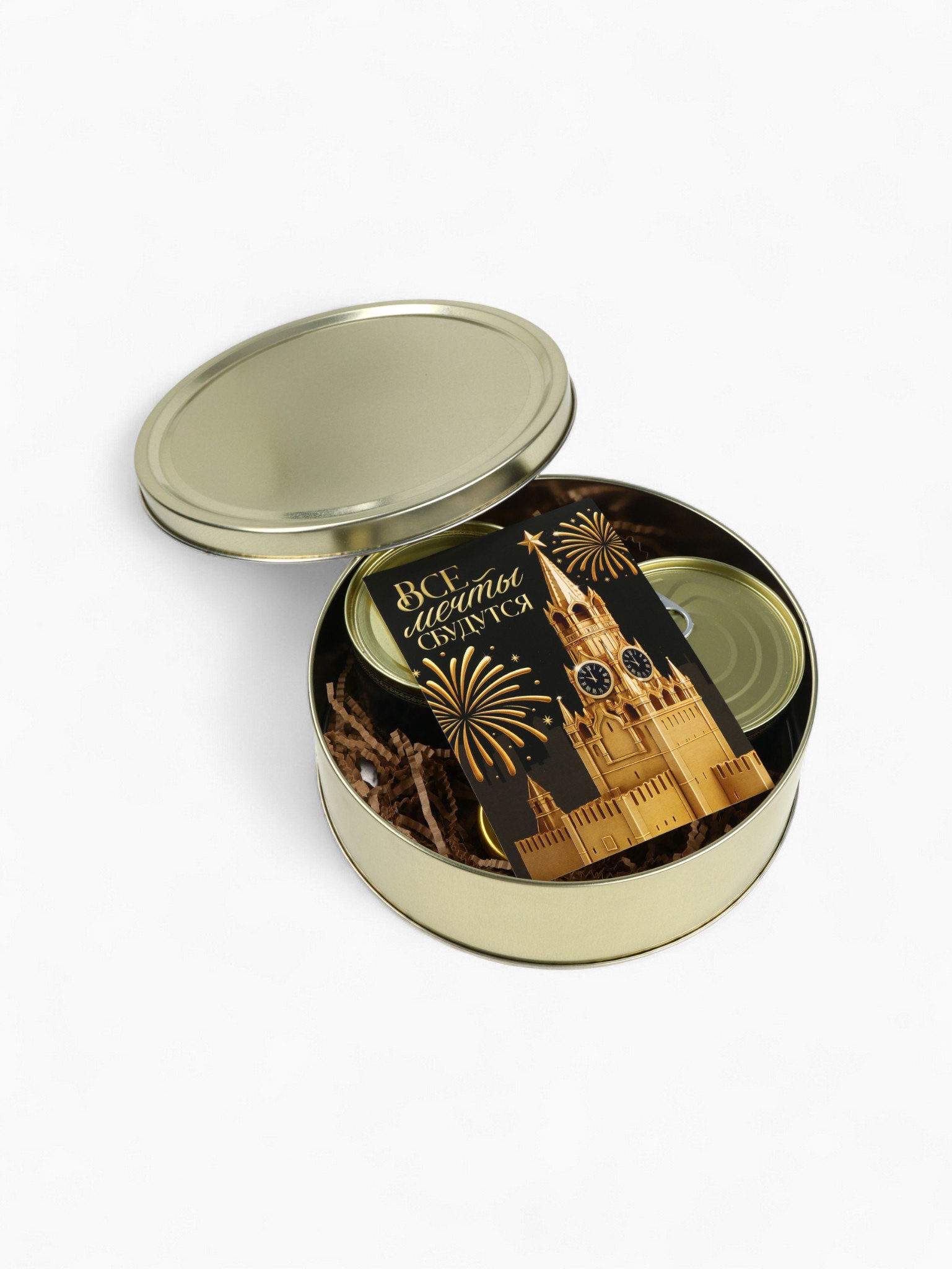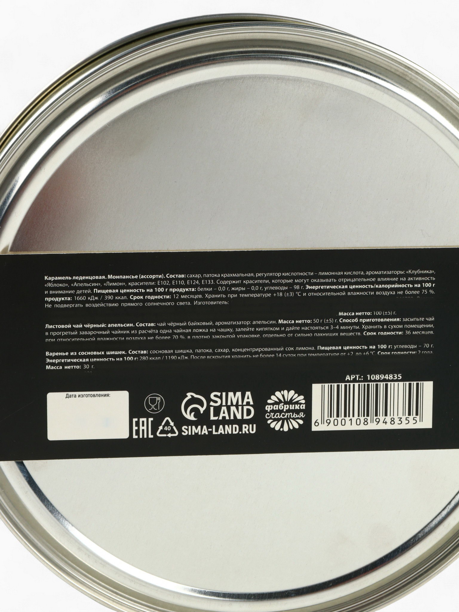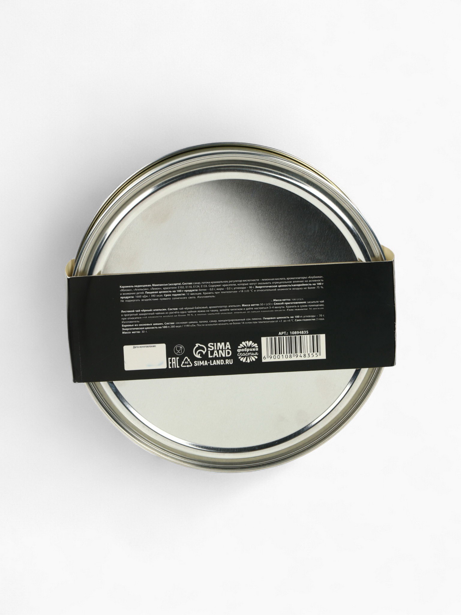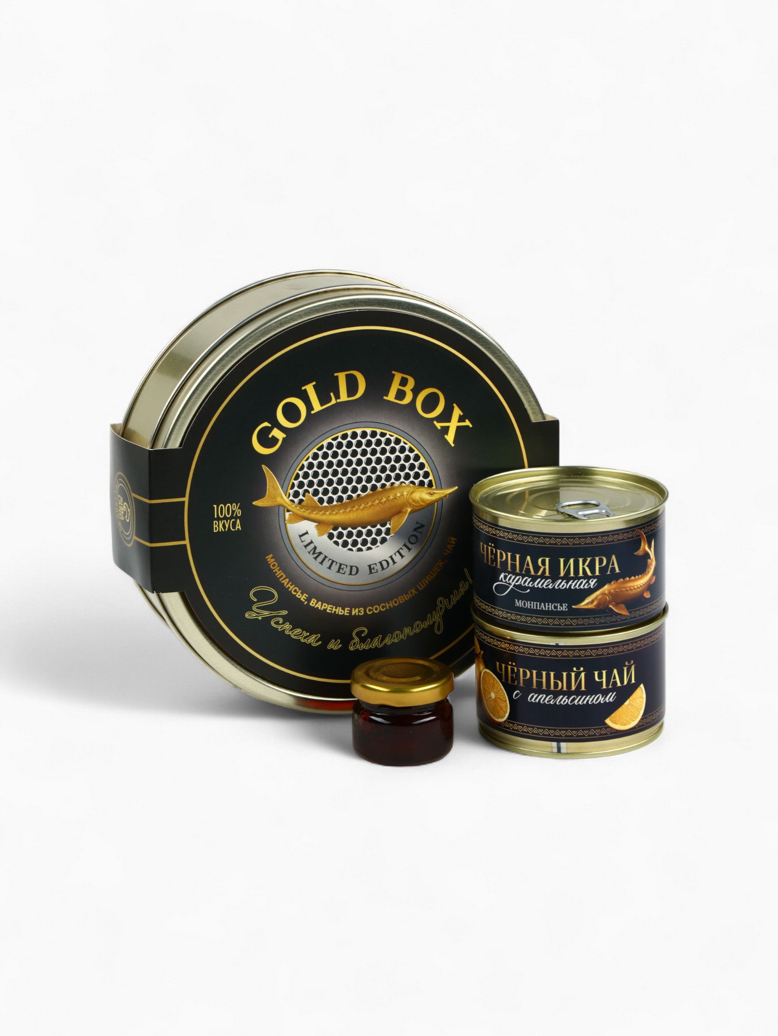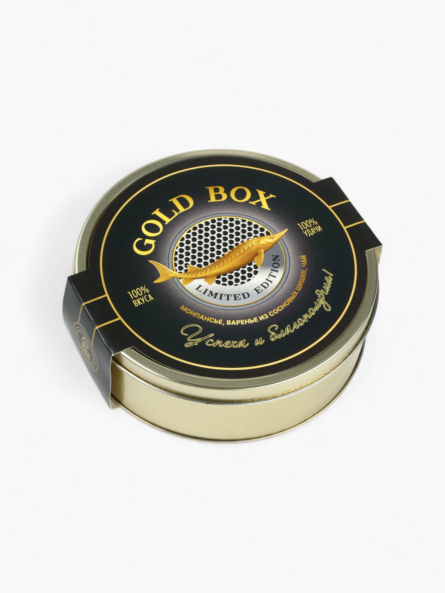 Подарочный новогодний набор в железной банке "Черная икра" : чай 50 г, монпансье 100 г, варенье 30 г, открытка, Фабрика счастья, Россия
