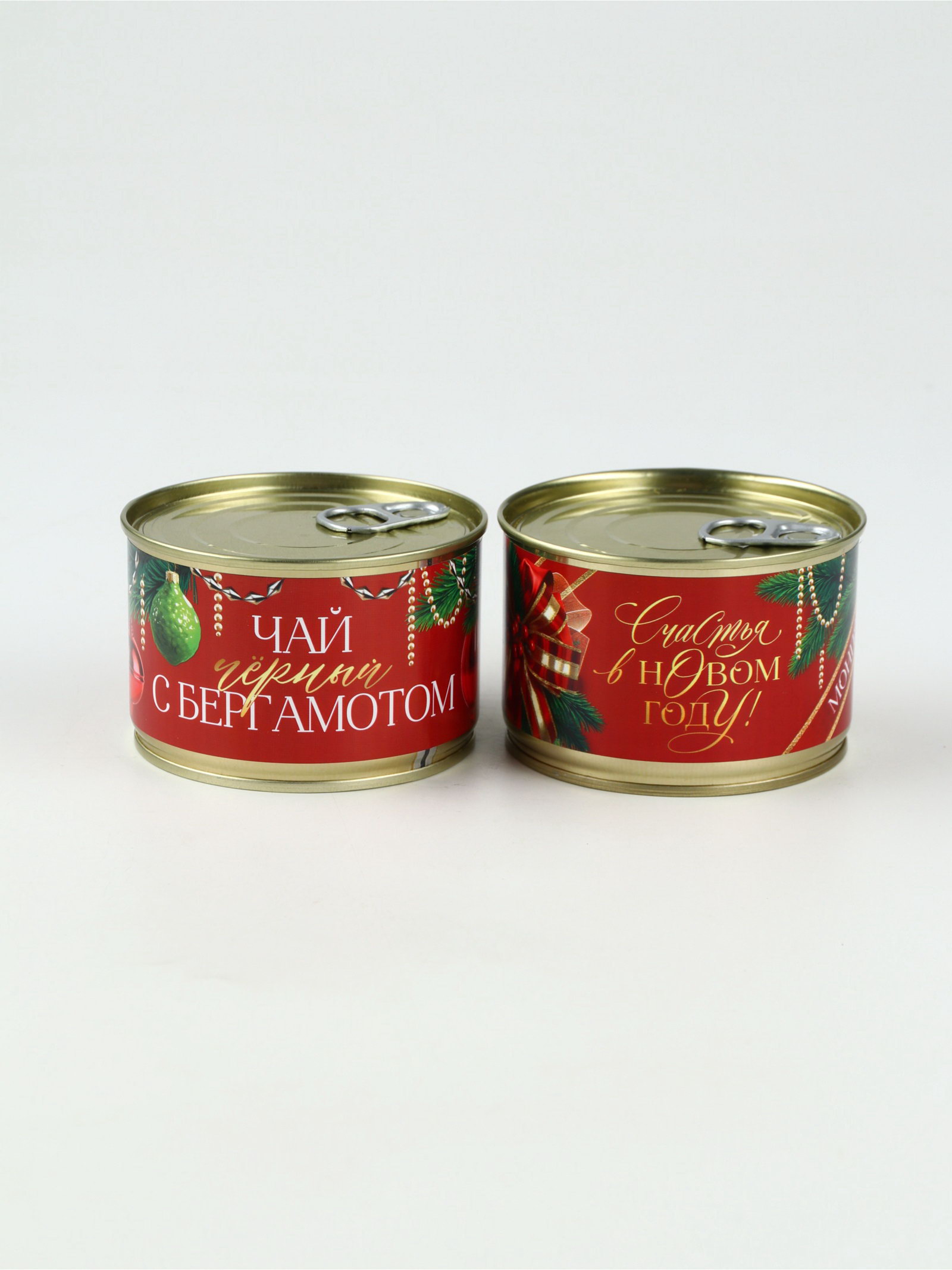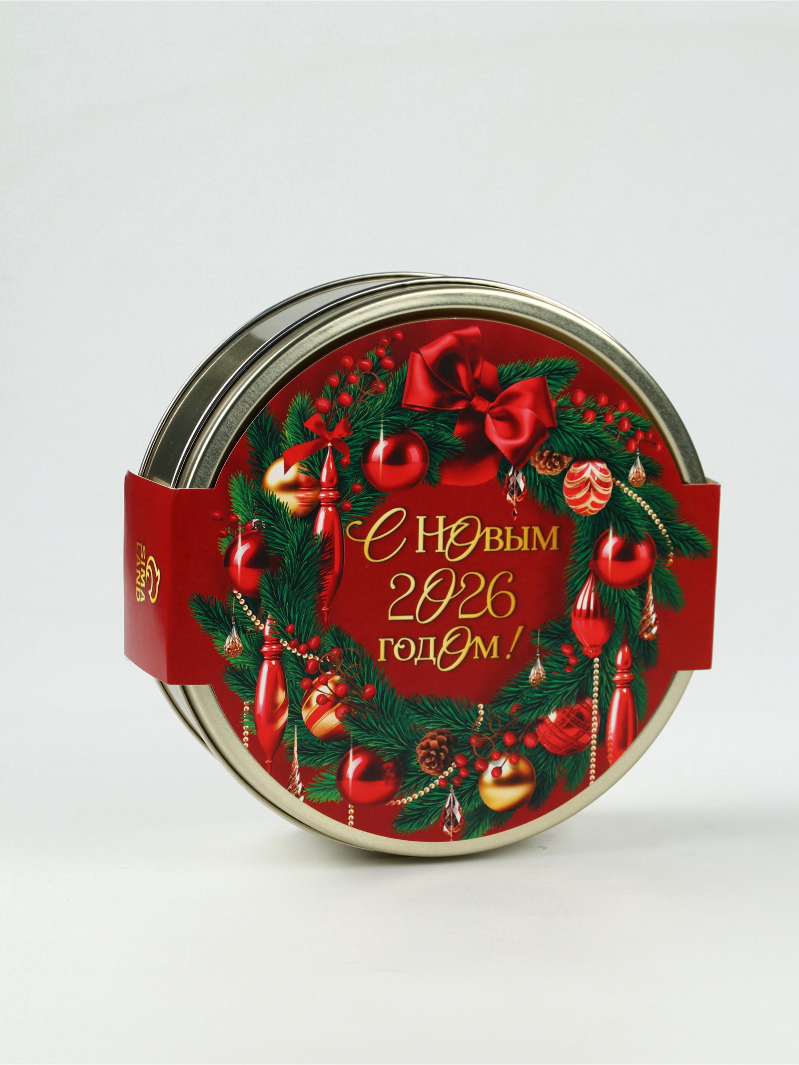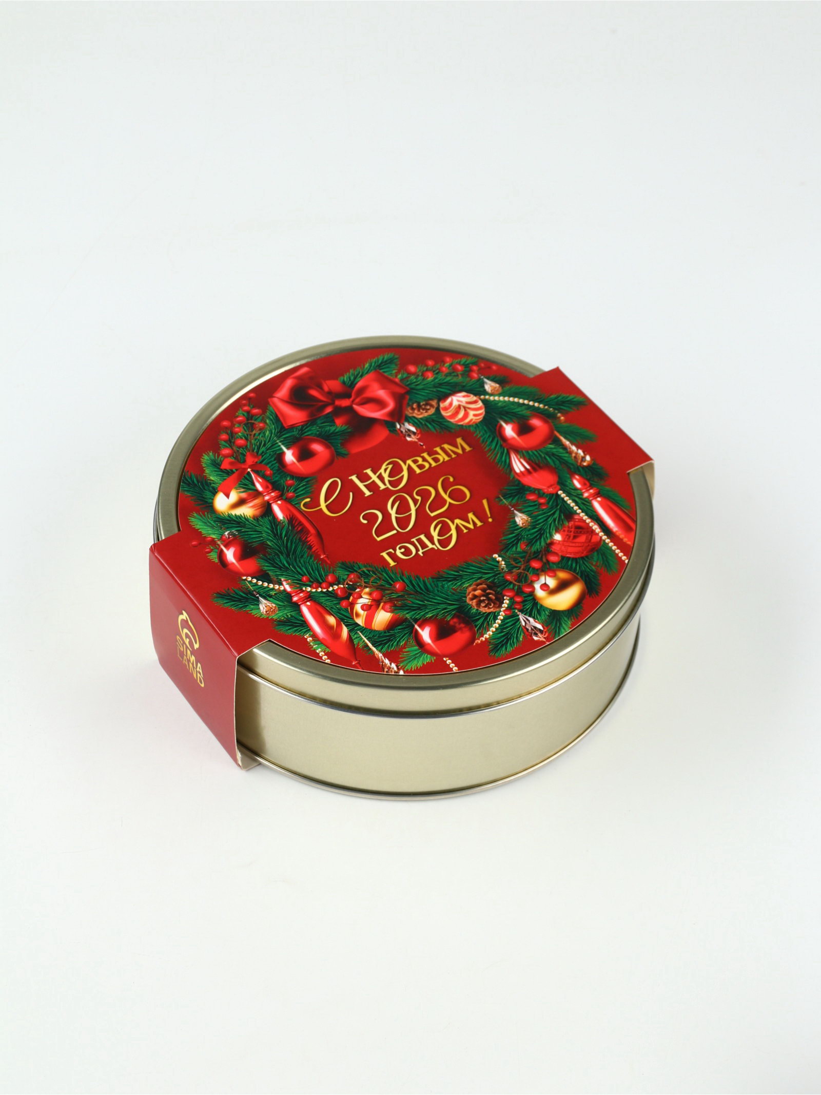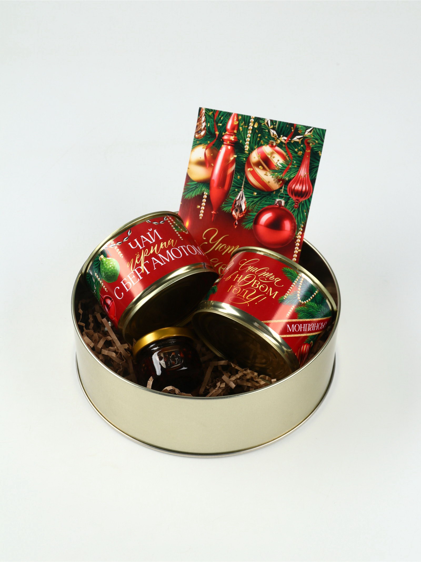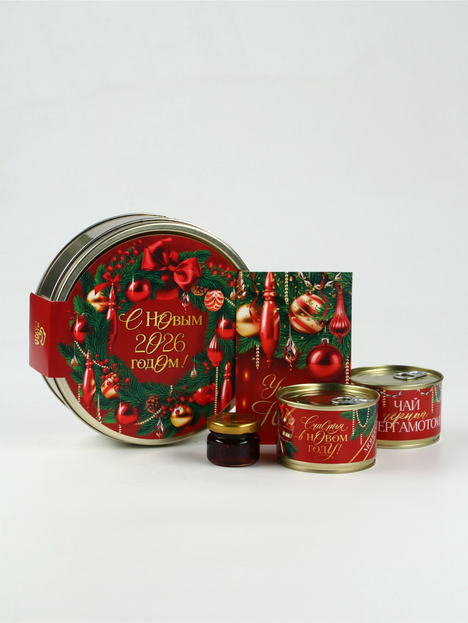 Подарочный набор новогодний "С Новым 2026 годом" в железной банке: чай, монпансье, варенье, открытка, Фабрика счастья, Россия