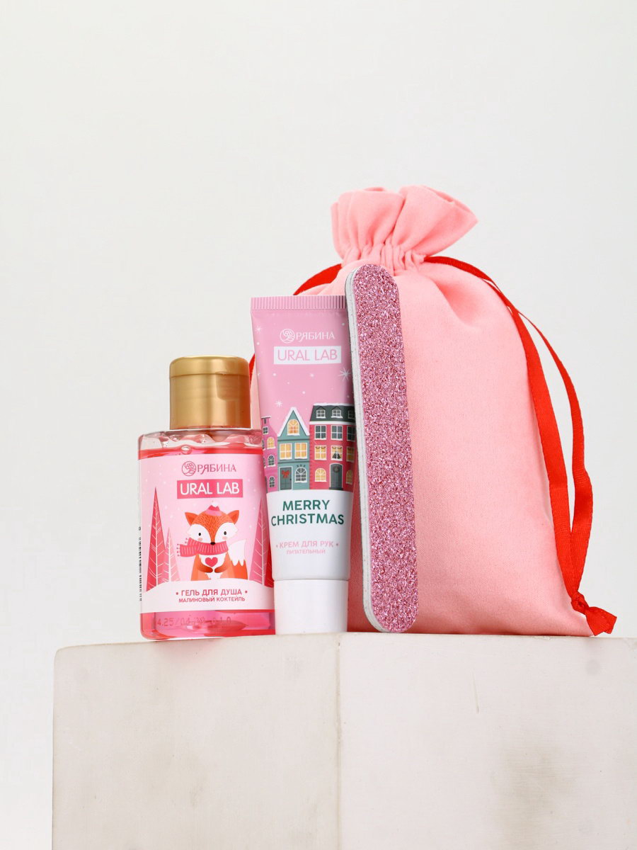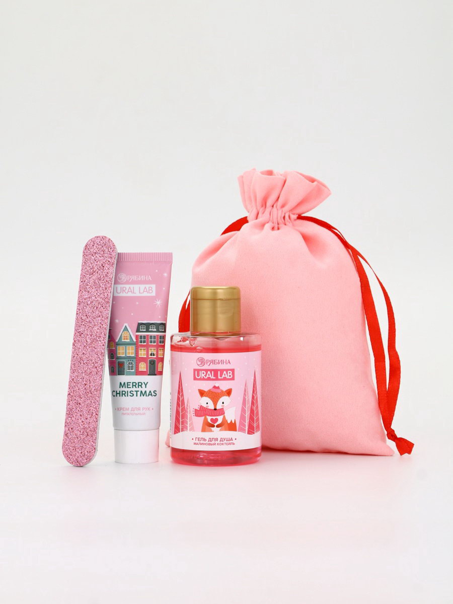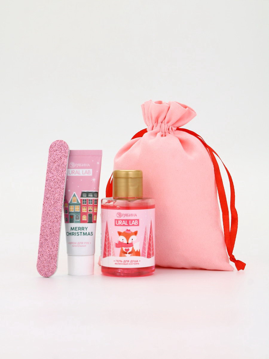 Подарочный набор косметики в мешке: крем для рук, пилочка, гель для душа, аромат малиновый коктейль, URAL LAB, Россия
