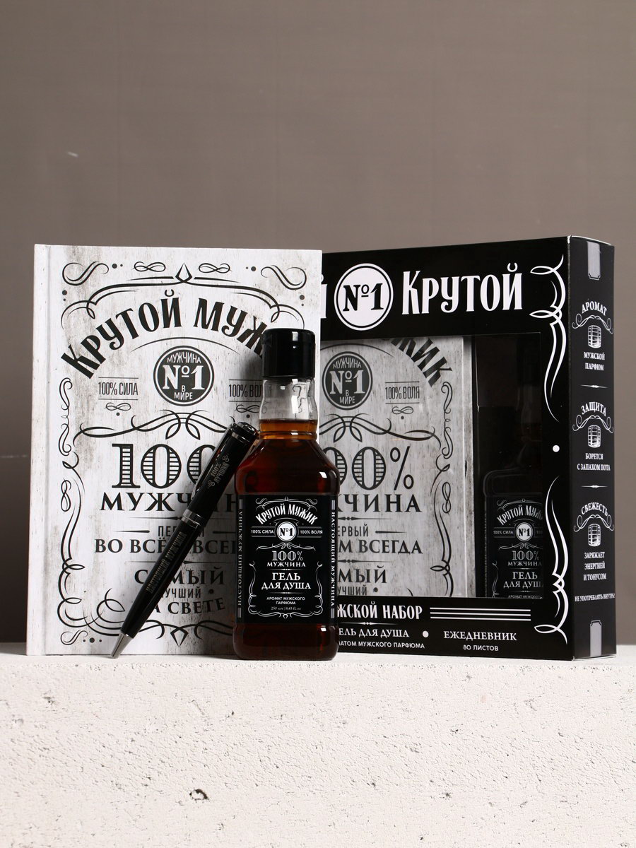 Набор "Самый крутой", гель для душа во флаконе виски, ежедневник и шариковая ручка, Чистое счастье, Россия