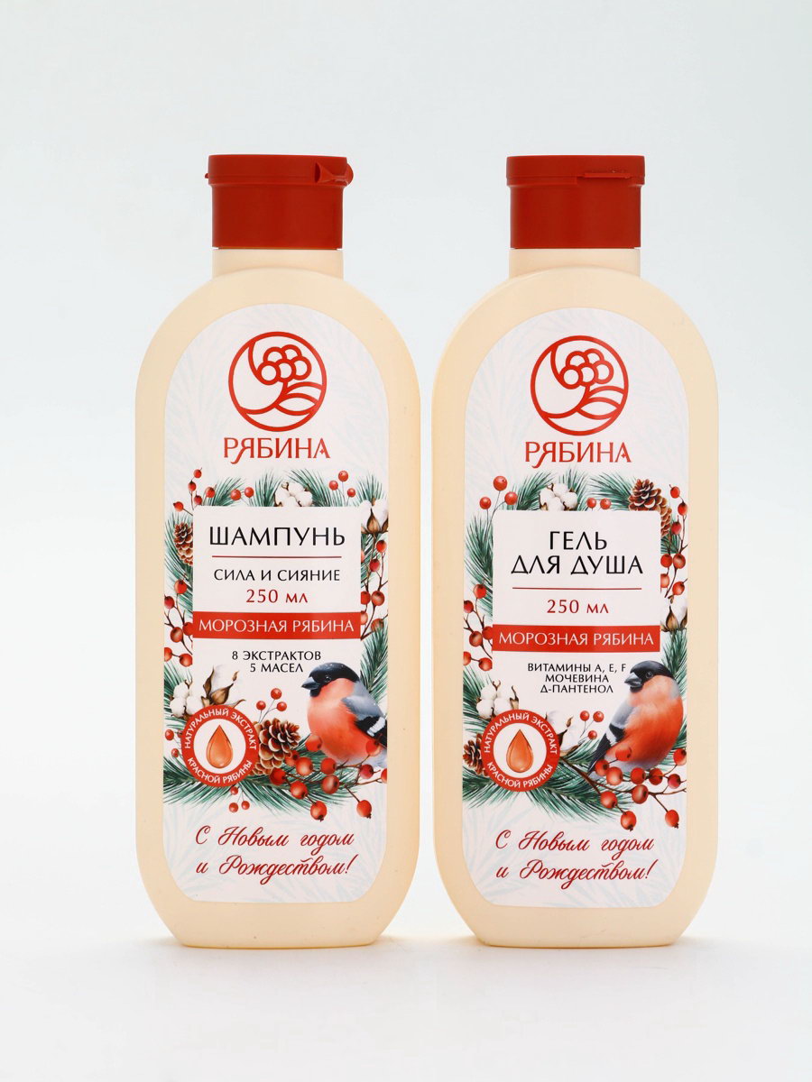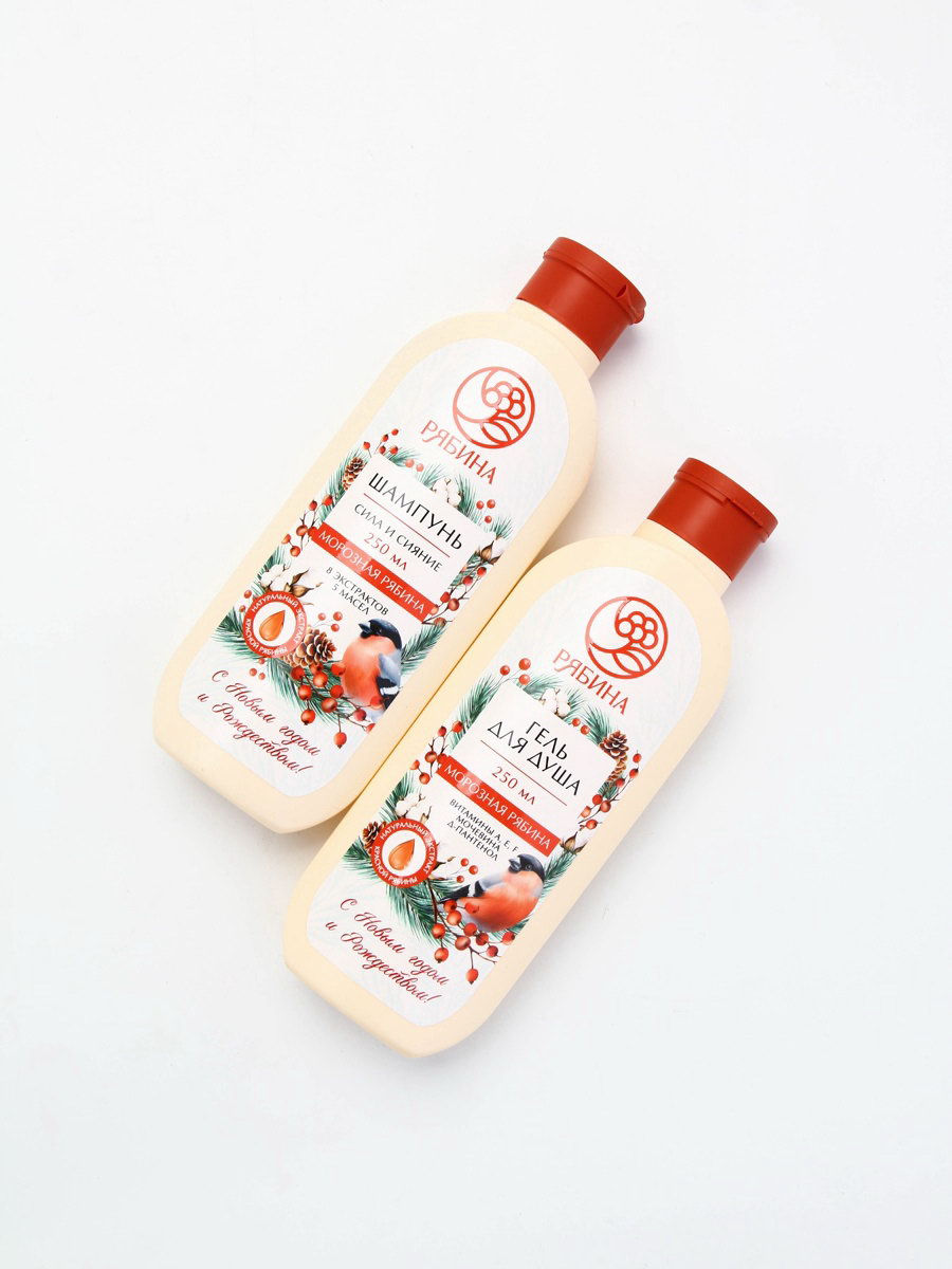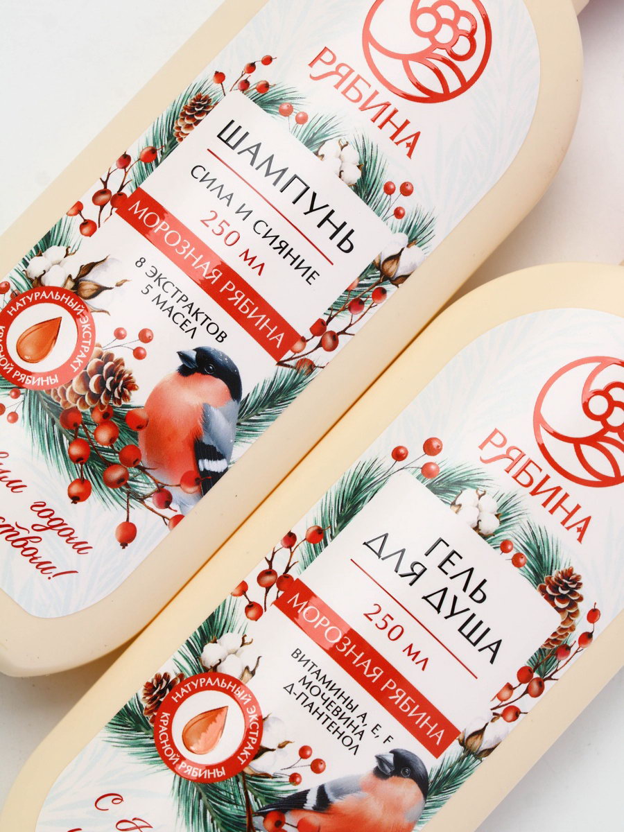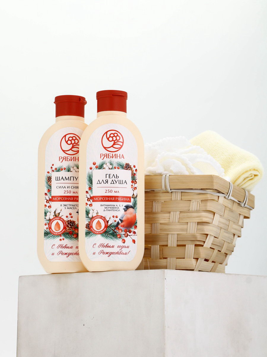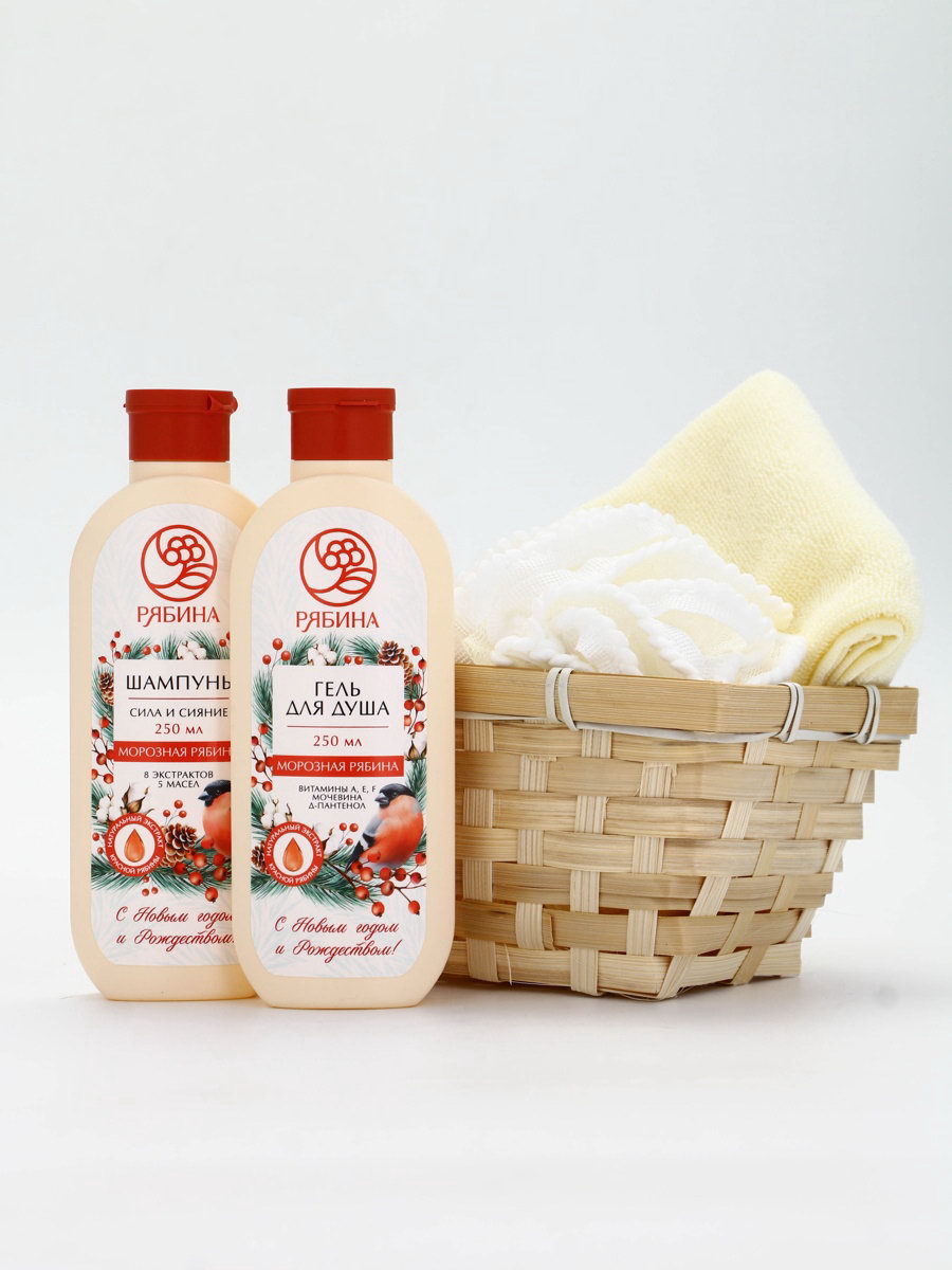 Подарочный набор в деревянной корзине "Рождество", гель для душа, шампунь, полотенце, РЯБИНА, Россия