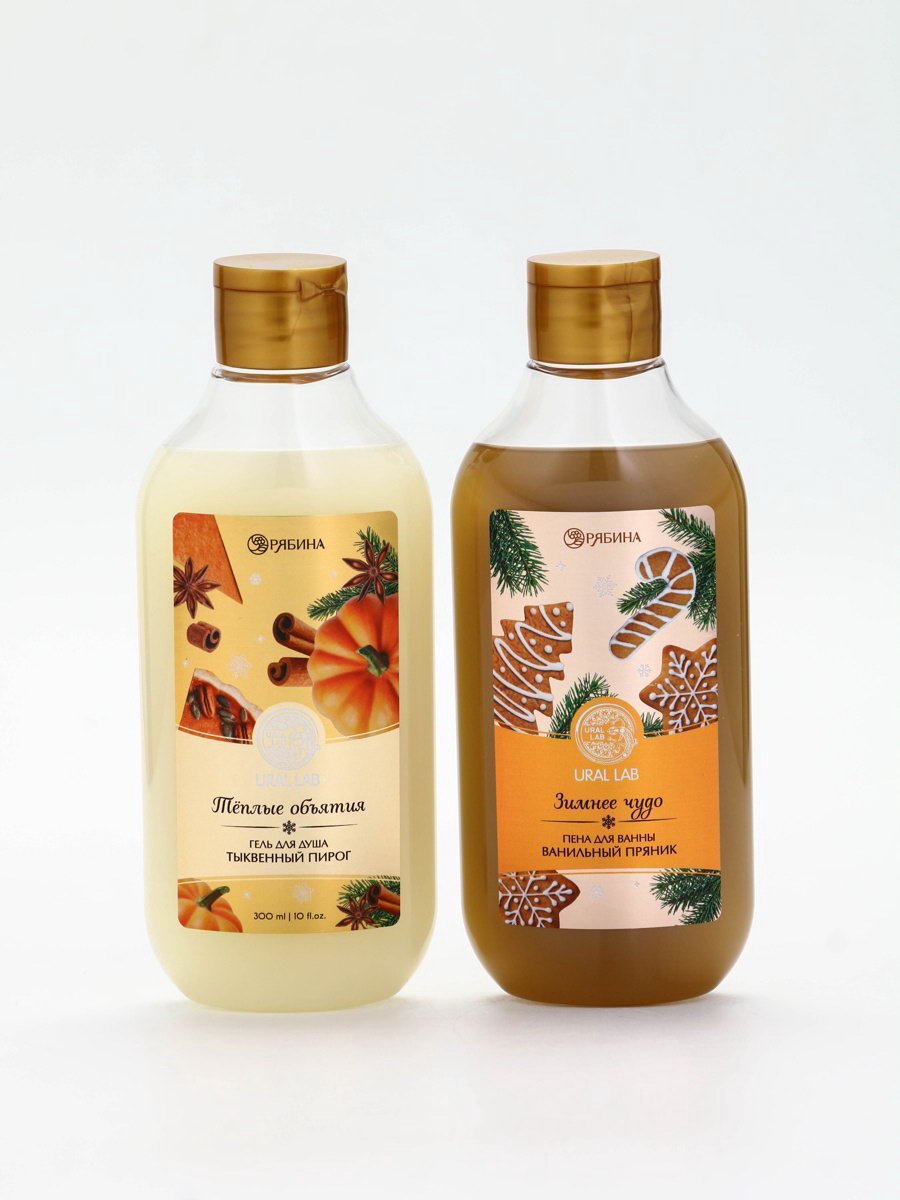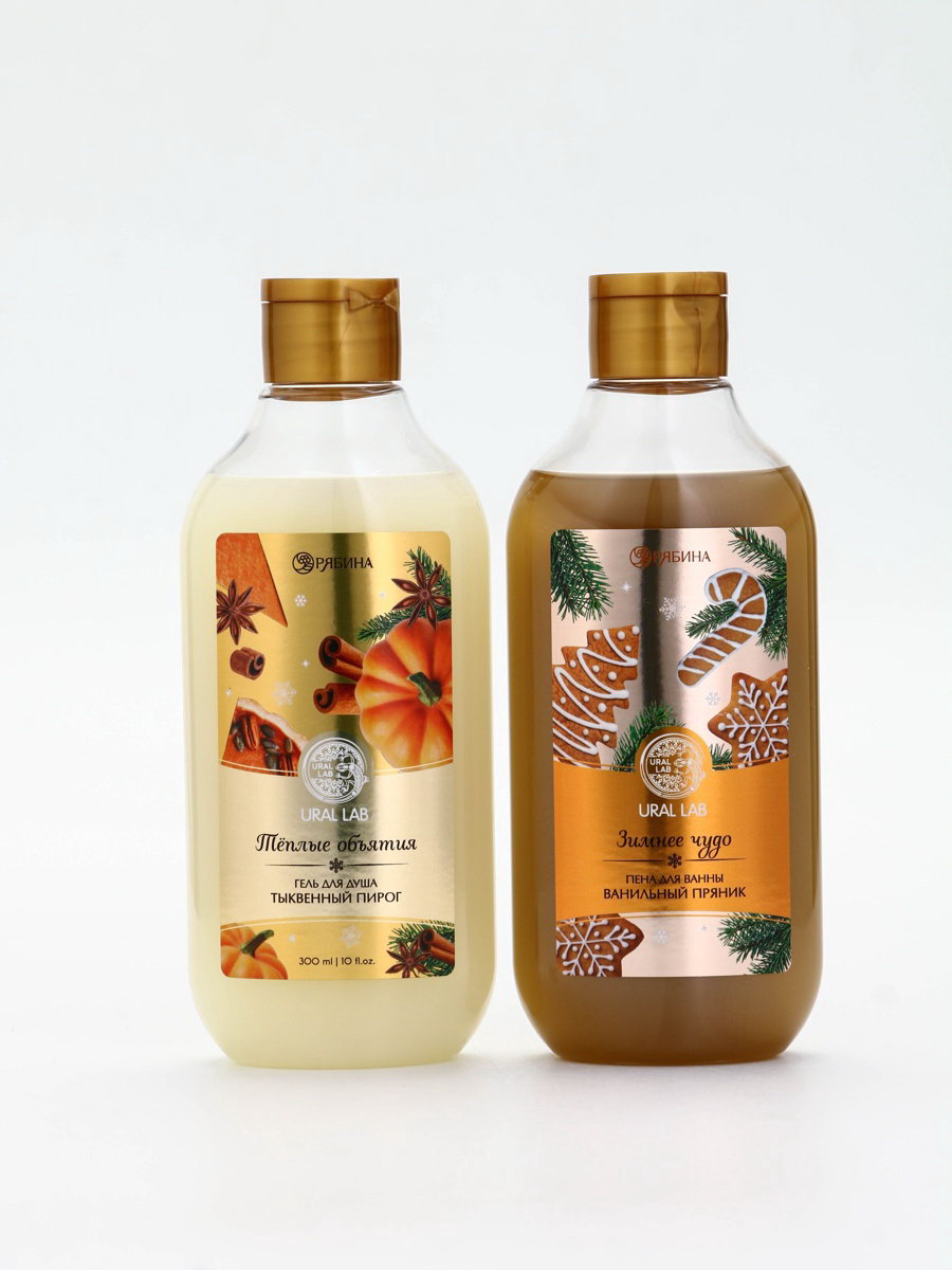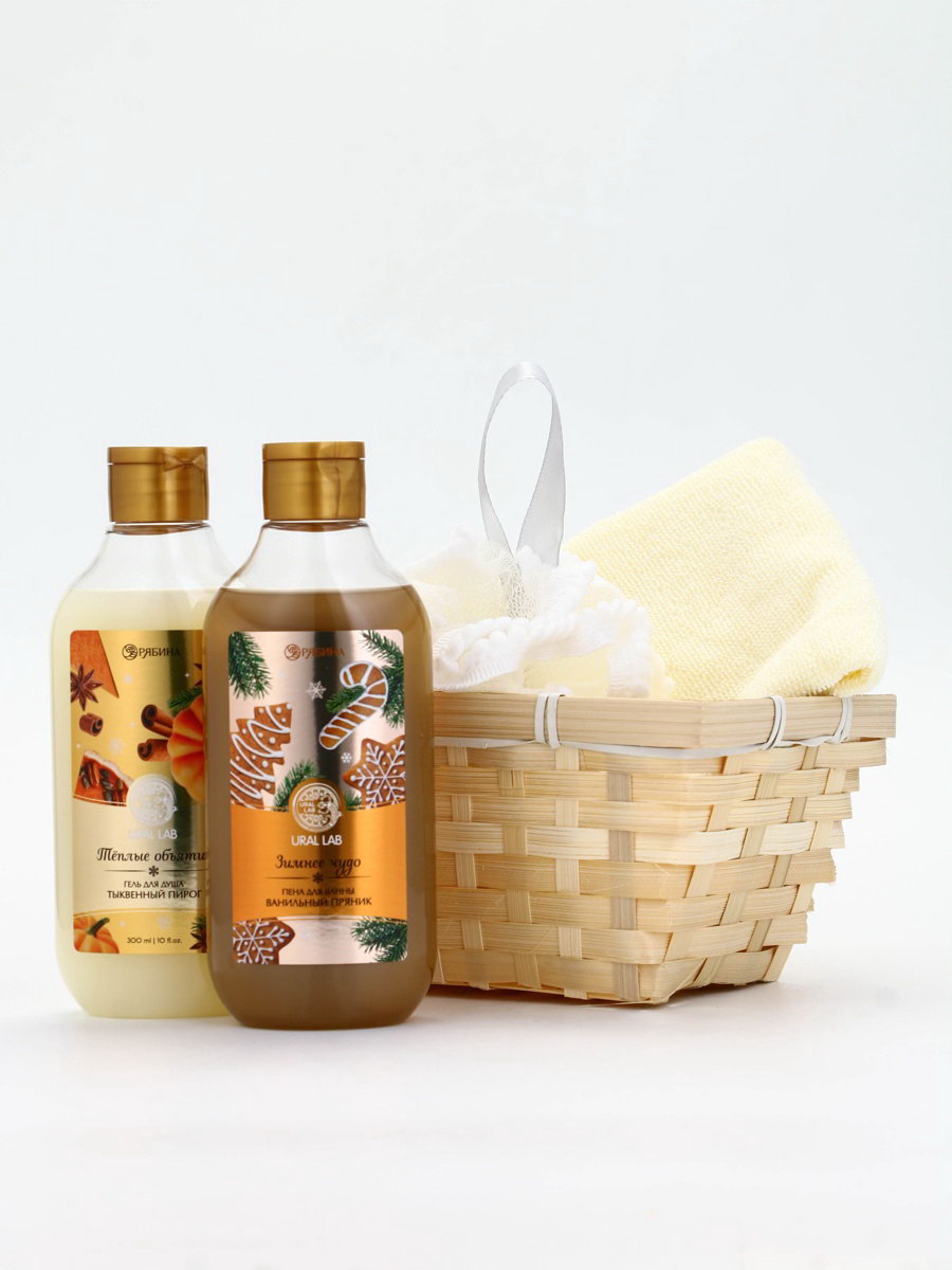 Подарочный набор новогодний в деревянной корзине: гель для душа, пена для ванны и полотенце, аромат тыквенный пирог и ванильный пряник, URAL LAB, Россия