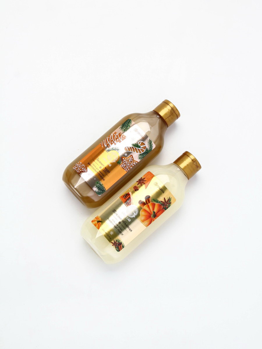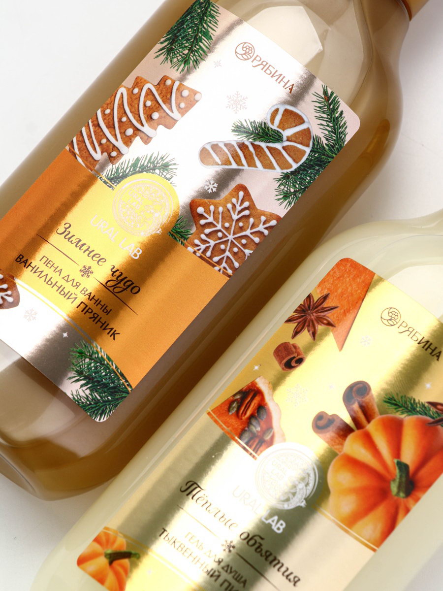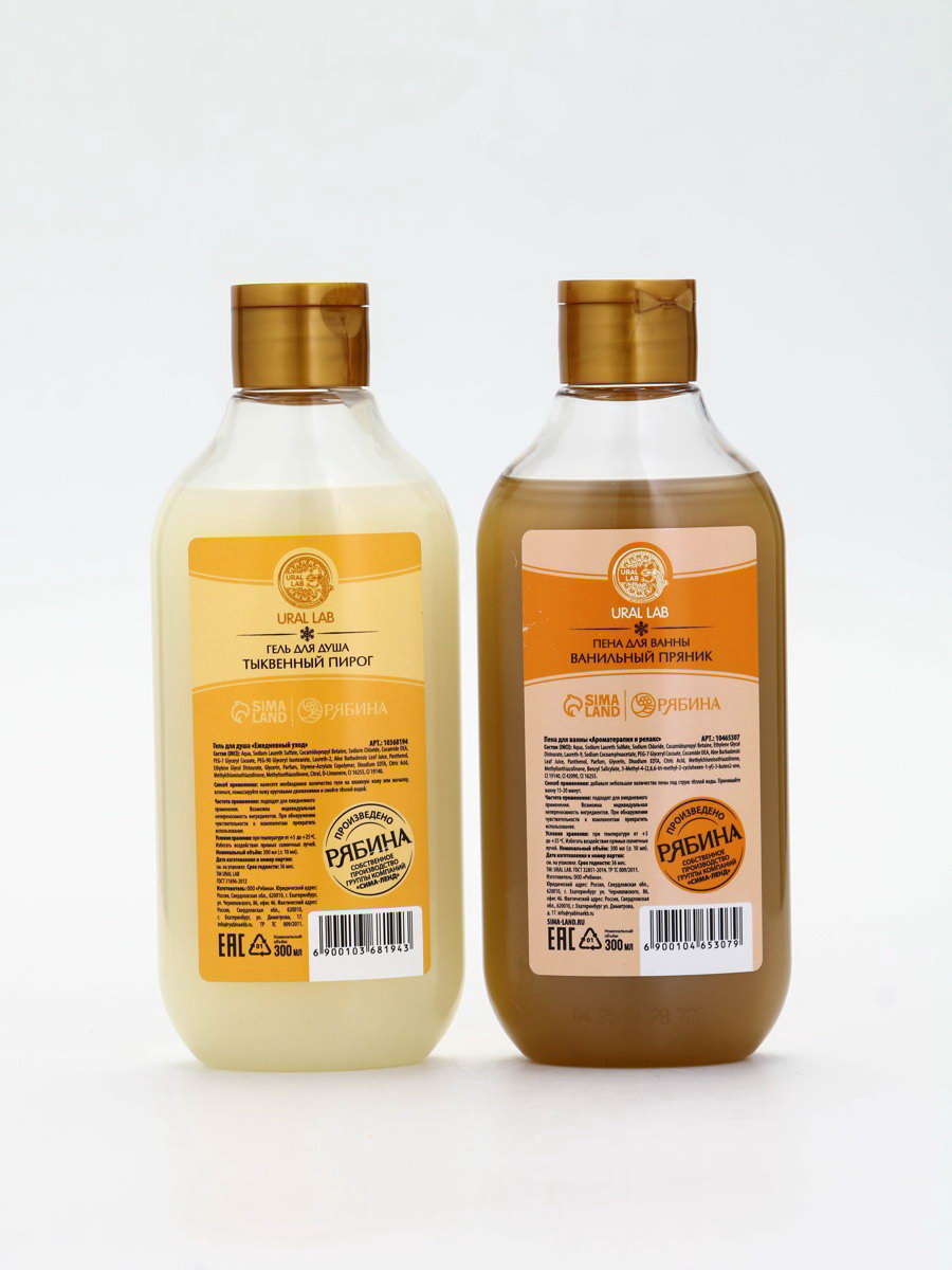 Подарочный набор новогодний в деревянной корзине: гель для душа, пена для ванны и полотенце, аромат тыквенный пирог и ванильный пряник, URAL LAB, Россия
