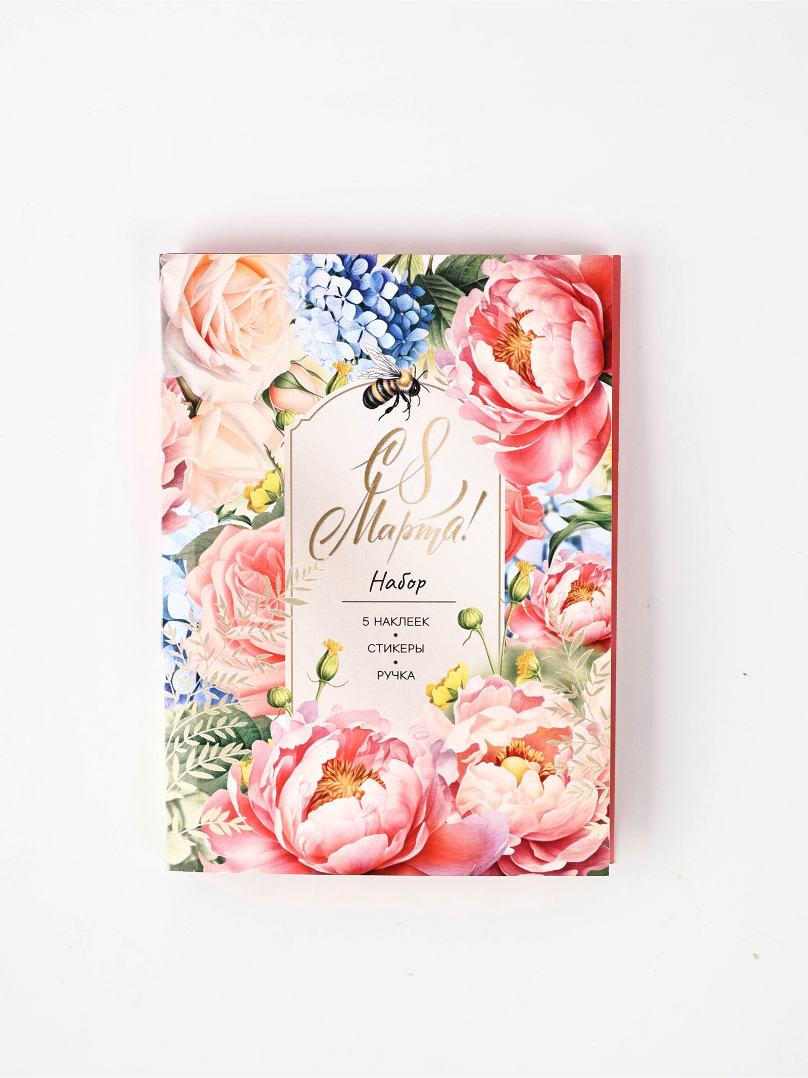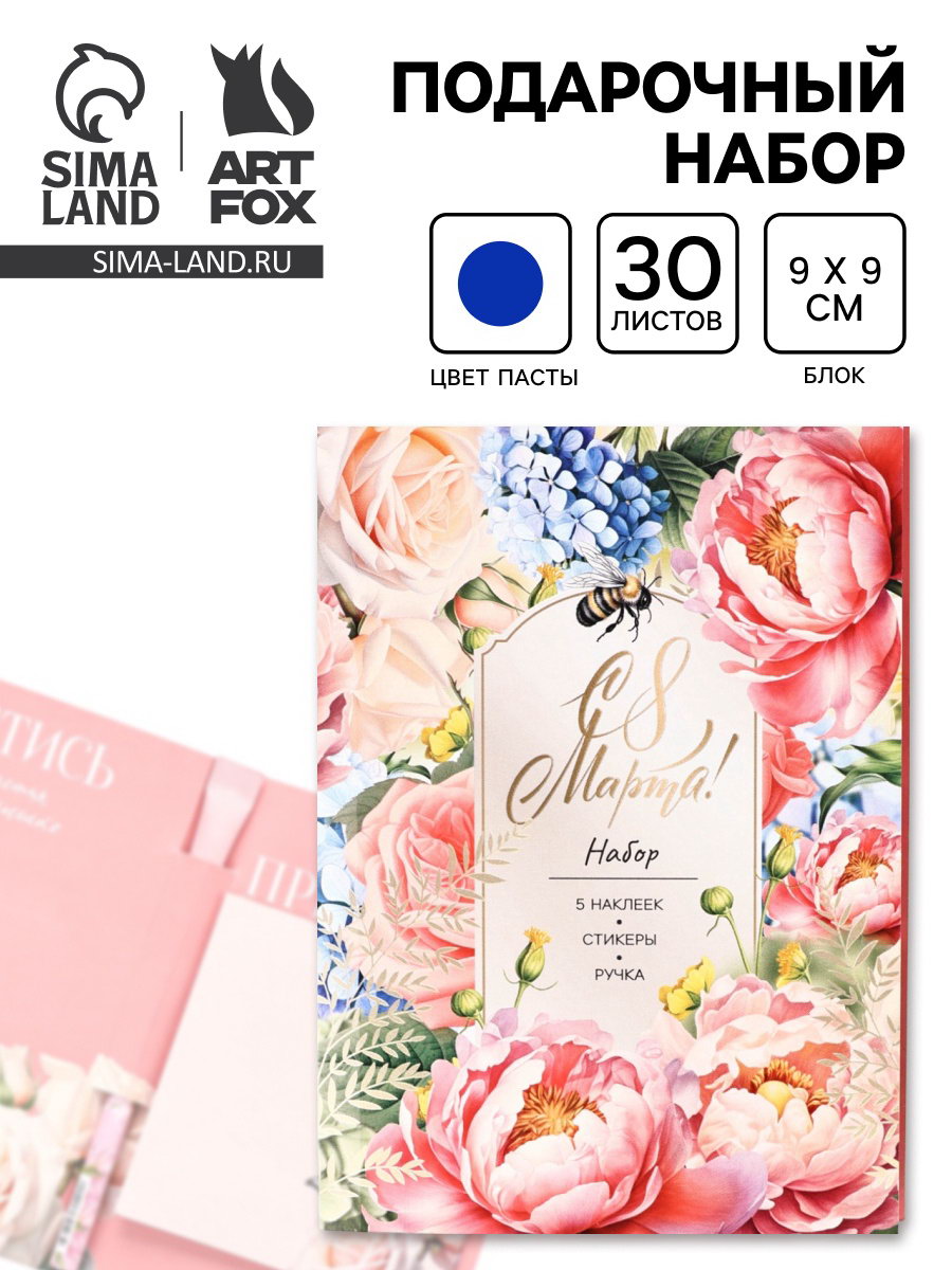 Подарочный набор, блок бумаги 30 л, ручка синяя паста 1.0 мм, наклейки 5 шт. "С 8 Марта", ArtFox, Китай