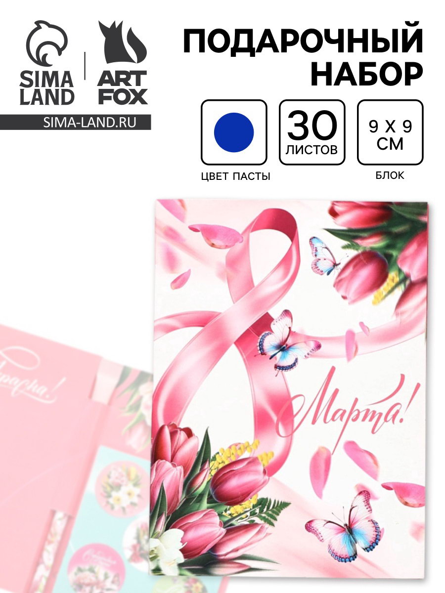 Подарочный набор, блок бумаги 30 л, ручка синяя паста 1.0 мм, наклейки 5 шт. "С 8 Марта. Открытка", ArtFox, Китай