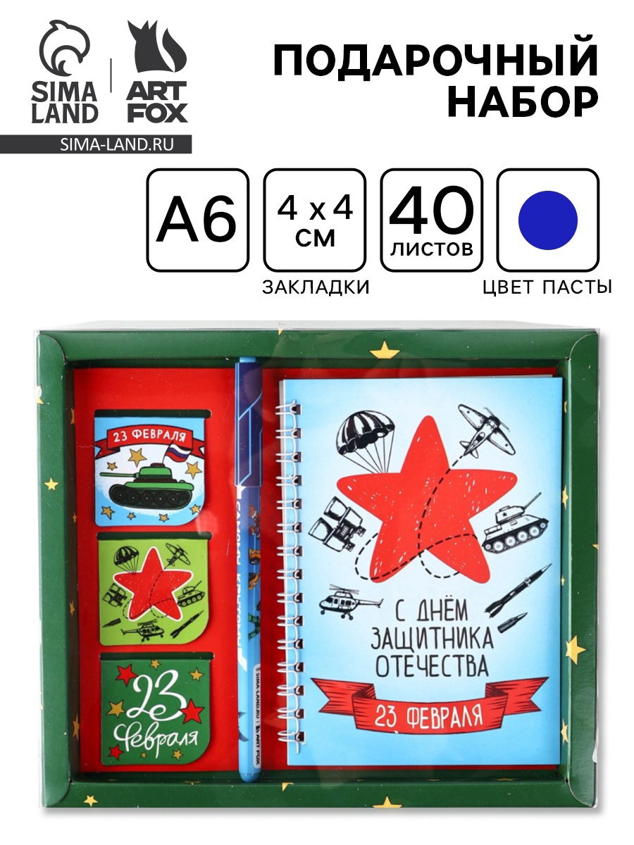 Подарочный набор: Блокнот А6, 40 л, магнитные закладки, ручка "С днем защитника отечества", ArtFox, Россия