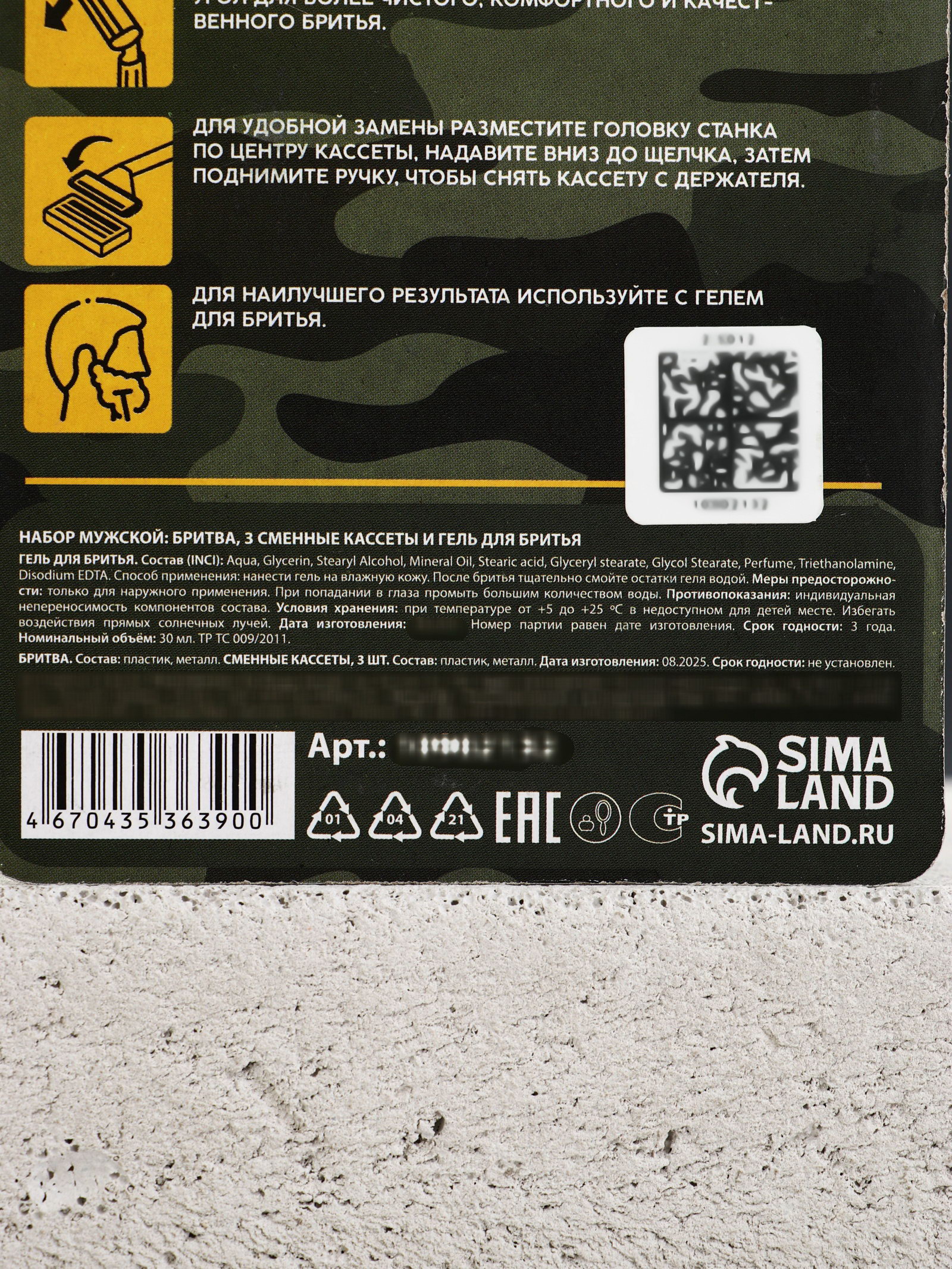 Возраст: Взрослый, Для взрослых Составляющие набора: Бритвенный станок, Гель для бритья, Сменные кассеты для бритвы Размер упаковки: 9.5 x 3 x 20 см. tnved: 3307100000 Тематика подарка: Уходовая косметика Аромат: Парфюм Вид упаковки: Блистер В наборе, шт.: 5 Для кого: Для мужчины Адресат: Без адресата Тематика праздника: Универсальная тематика | ||