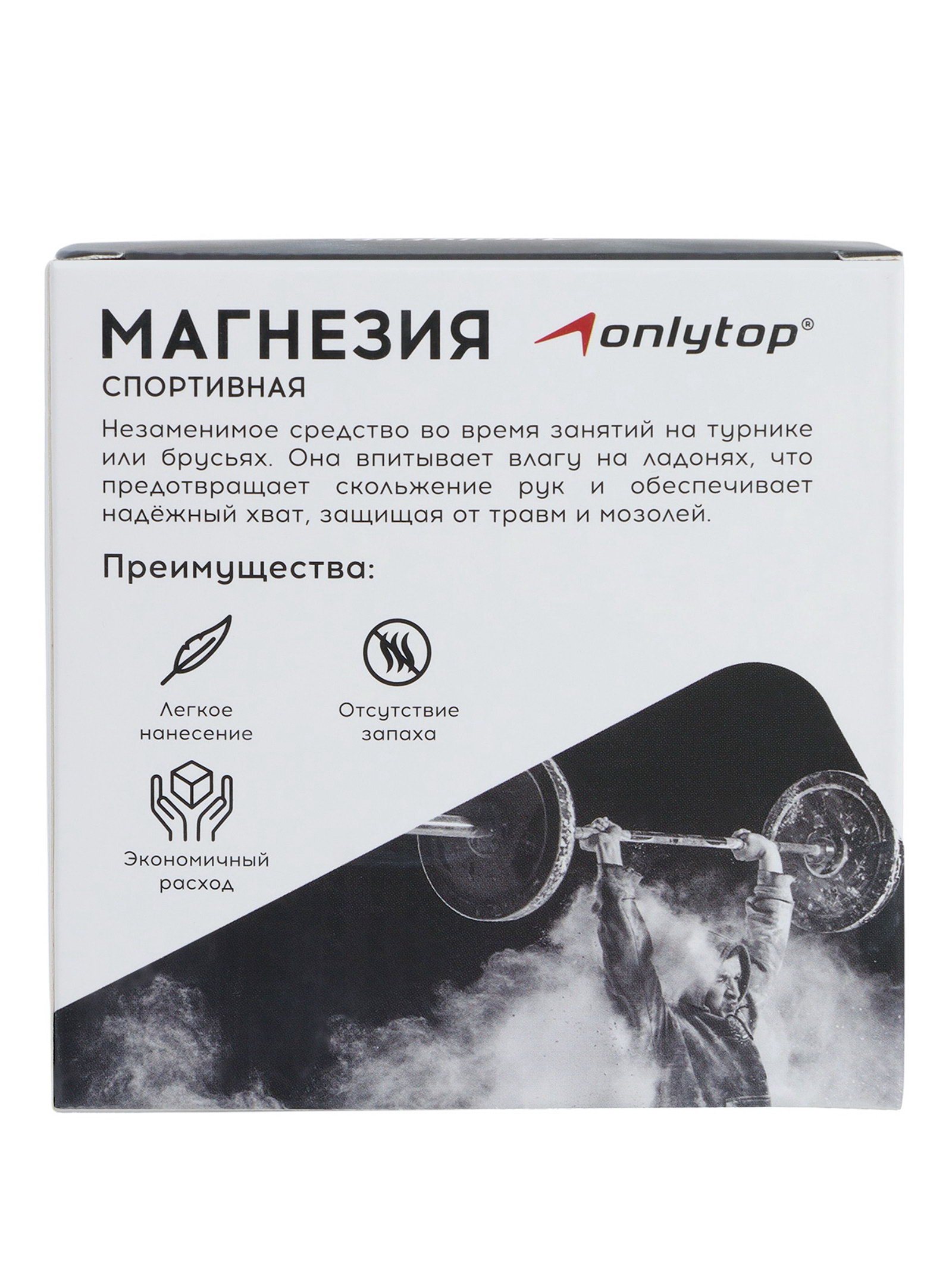 Вид: Магнезия, Сухая Размер упаковки: 9 x 4.5 x 9 см. Вид спорта: Тяжёлая атлетика tnved: 2836991000 tnved: 2836991000 Цвет: Белый Вес, г/Объём, мл: 77 Универсальная спортивная магнезия используется для занятий на турнике и брусьях, а также применяется в альпинизме и скалолазании, тяжёлой атлетике, в спортивной и уличной гимнастике. Прекрасно впитывает влагу, препятствует скольжению рук. Состав: карбонат магния. | ||