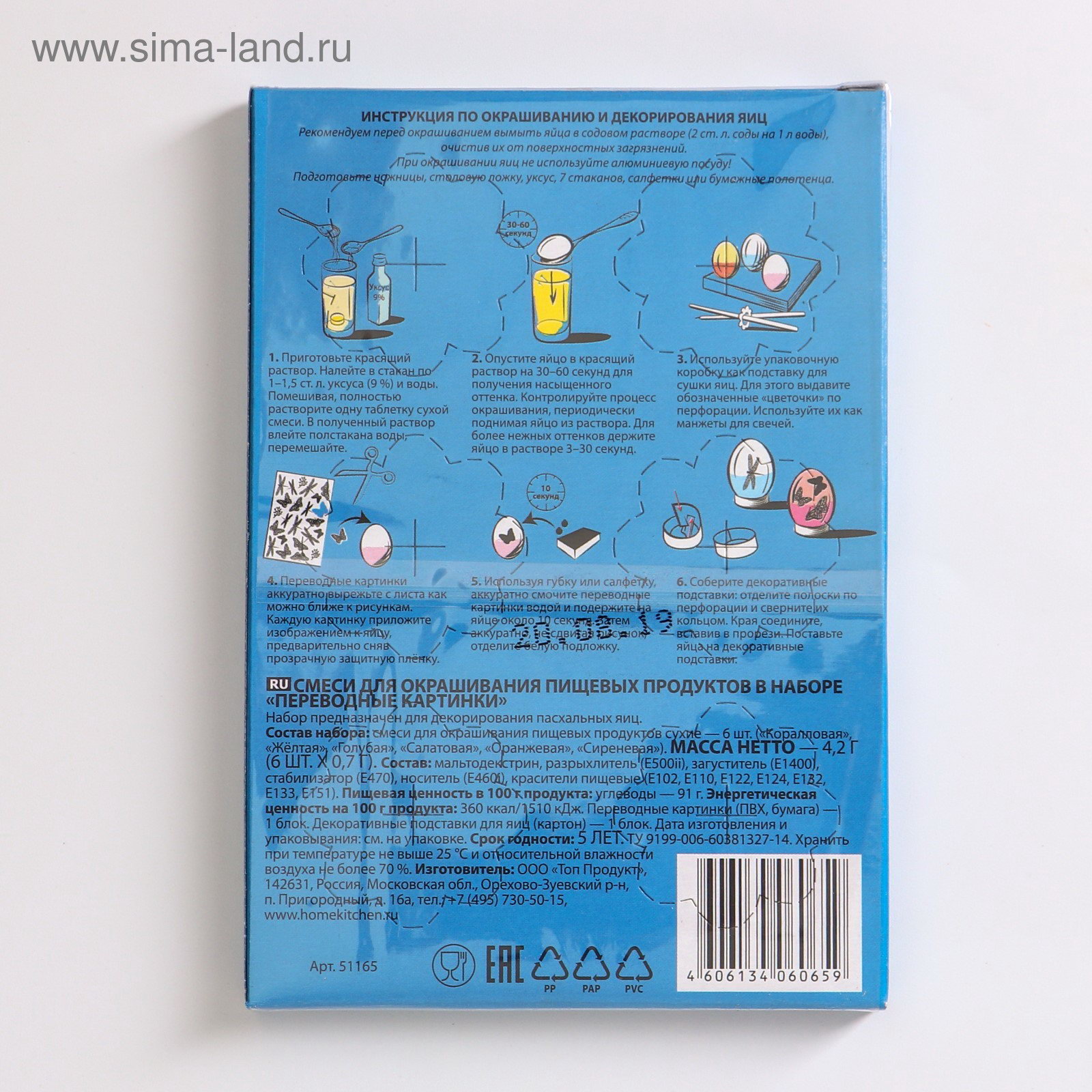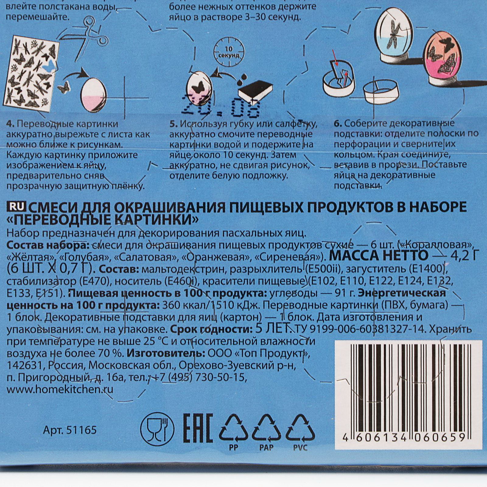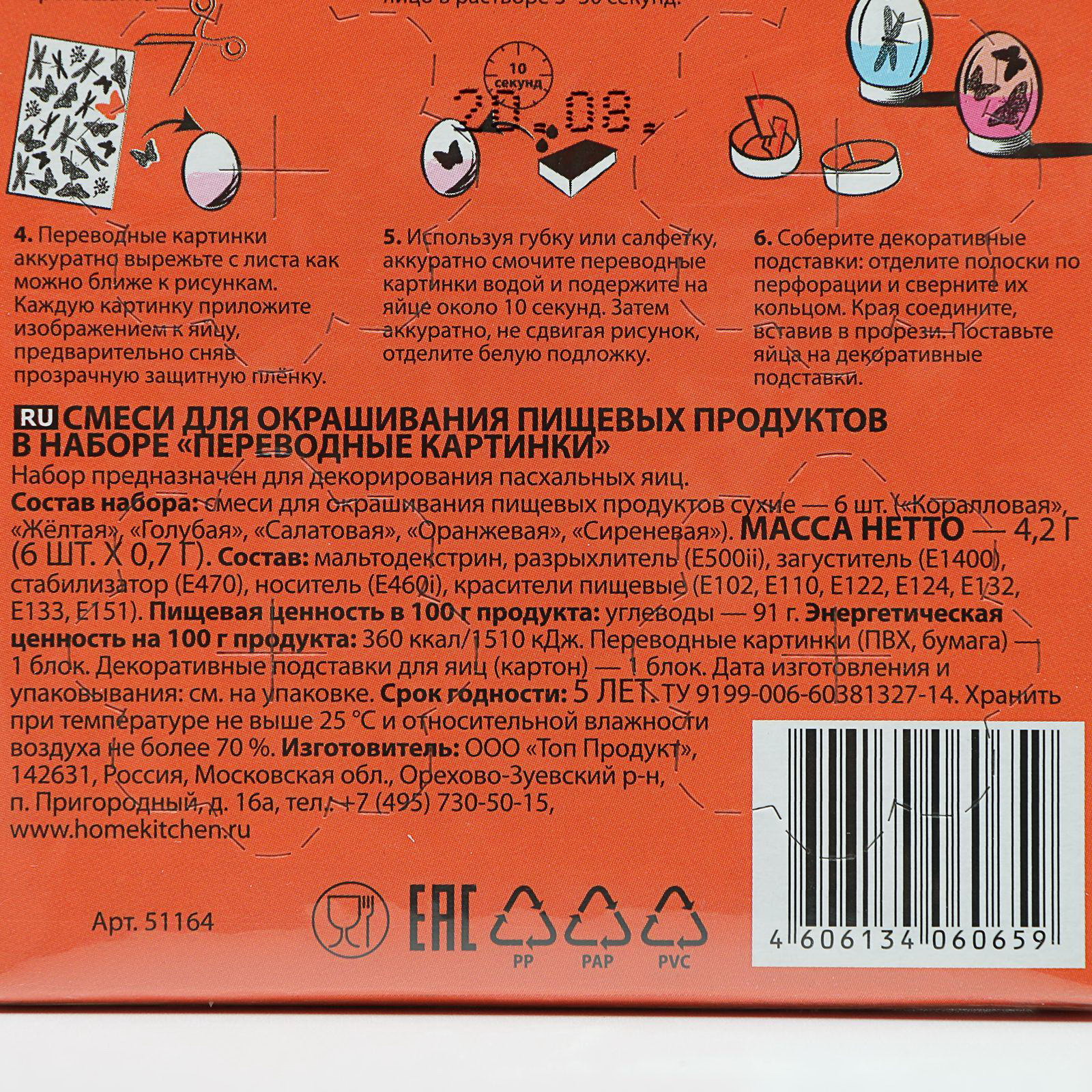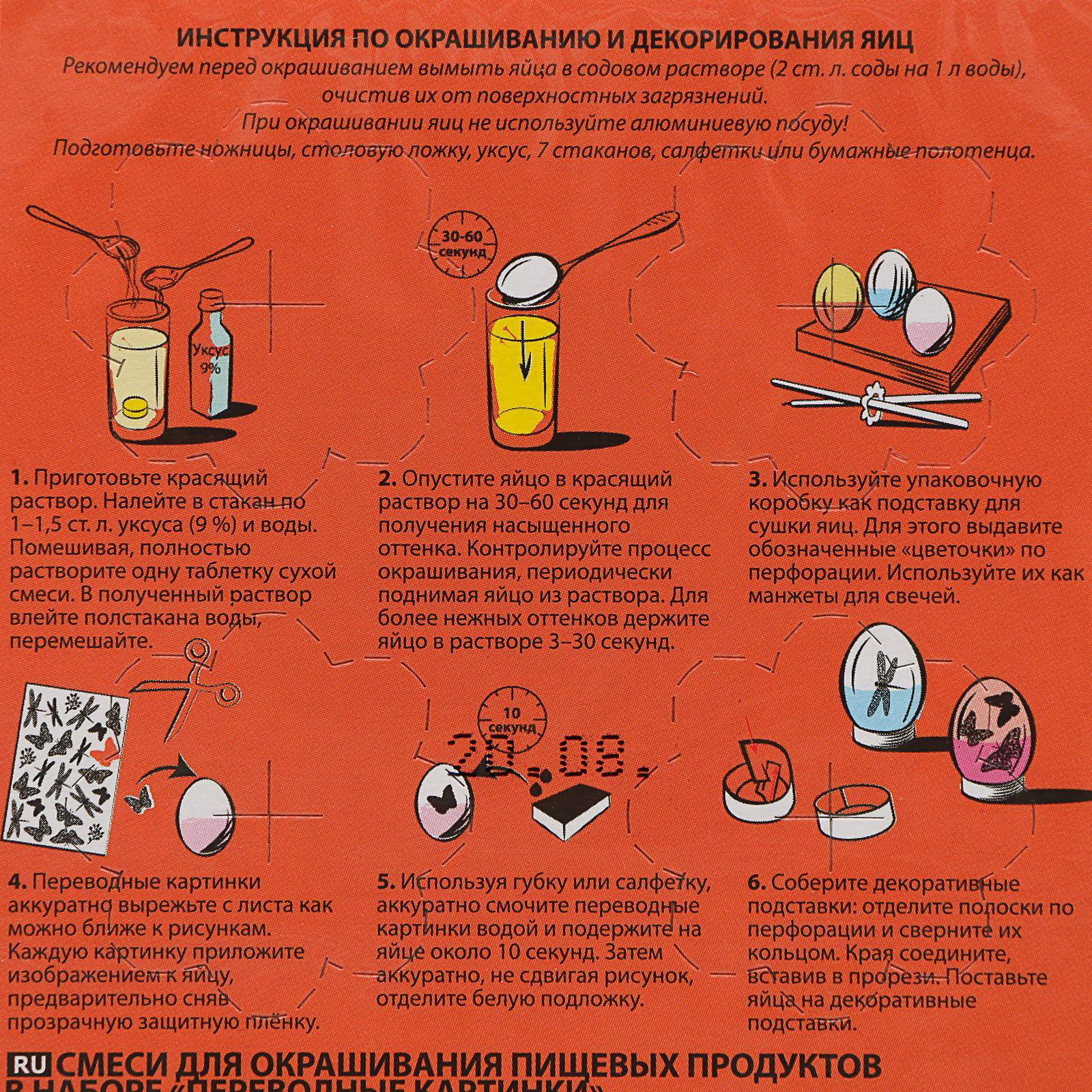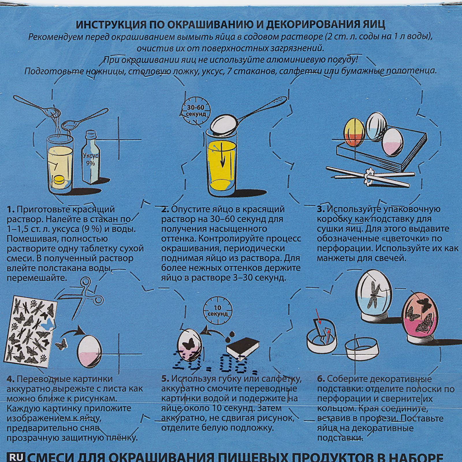 Цвет: Бирюзовый, Жёлтый, Красный, Оранжевый, Синий, Фиолетовый Вид: Краситель, Термоплёнка Размер упаковки: 11 x 1.3 x 15.5 см. tnved: 3204900000 Продукты: Да Температурное ограничение: Нет Набор: Да Вид красителя: Водорастворимый Назначение: Для яиц Набор предназначен для декорирования пасхальных яиц. Рекомендуем перед окрашиванием вымыть яйца в содовом растворе, очистив их от поверхностных загрязнений. При окрашивании яиц не используйте алюминиевую посуду! Состав: смеси для окрашивания пищевых продуктов сухие - 6 шт. (коралловая, жёлтая, голубая, салатовая, оранжевая, сиреневая), блок переводных картинок, декоративные подставки для яиц - 1 блок. | ||