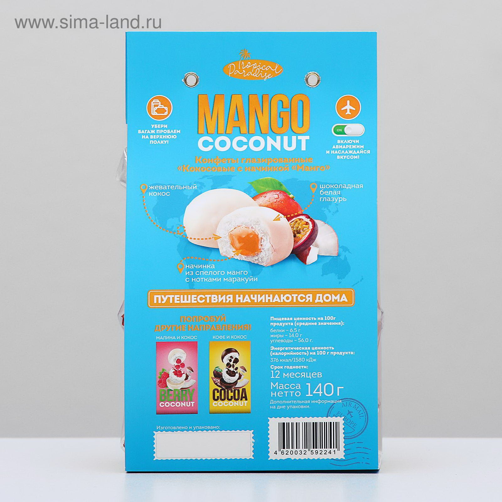 Вид упаковки: Картонная упаковка, Пакет Размер упаковки: 18.5 x 6 x 10.5 см. tnved: 1704909800 Вид: Кокосовые Продукты: Да Температурное ограничение: Нет Вес нетто, г: 140 Тематика праздника: Универсальная тематика Вкус: Манго Состав: кокосовая стружка, глюкозно-фруктозный сироп, сахар, сухое обезжиренное молоко, влагоудерживающие агенты (сорбит, глицерин), антиокислитель Е307, эмульгатор: лецитин соевый, консервант: сорбат калия, ароматизаторы; глазурь белая шоколадная (сахар, какао – масло, молоко сухое цельное, сухая молочная сыворотка, эквивалент какао-масла (масла растительные (пальмовое, сал, эллипе), эмульгаторы (лецитин соевый, Е476)), ароматизатор), начинка (апельсин, пюре яблочное, сахар, фруктоза, кусочки манго, загустители (пектин, камедь рожкового дерева), стабилизатор (Е1422), регуляторы кислотности (Е330, E450, E341), консервант: сорбат калия, краситель пищевой: каротин). | ||