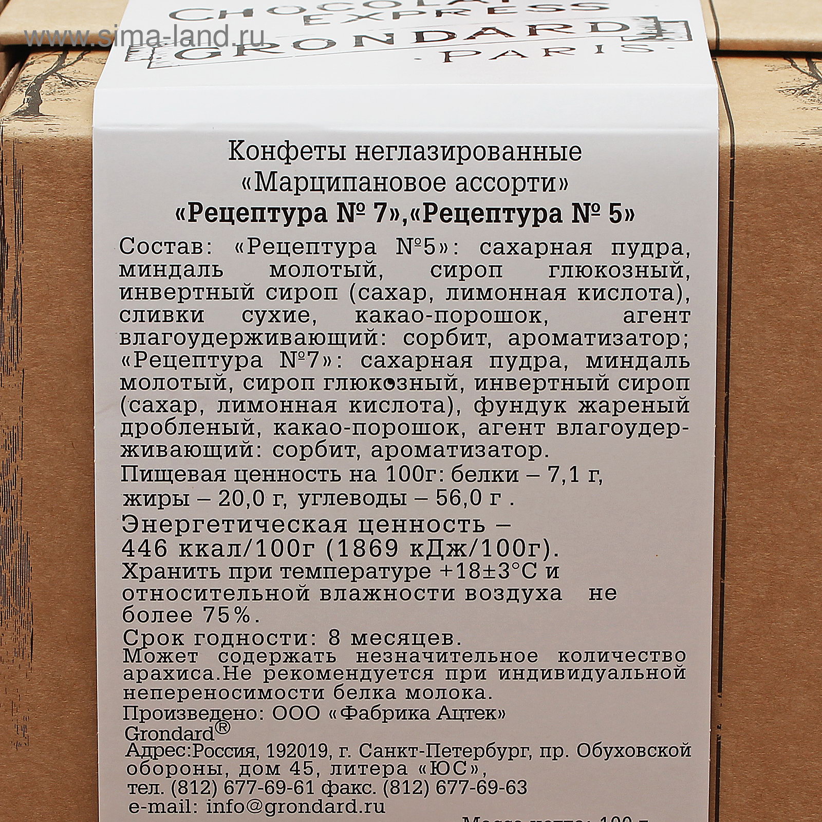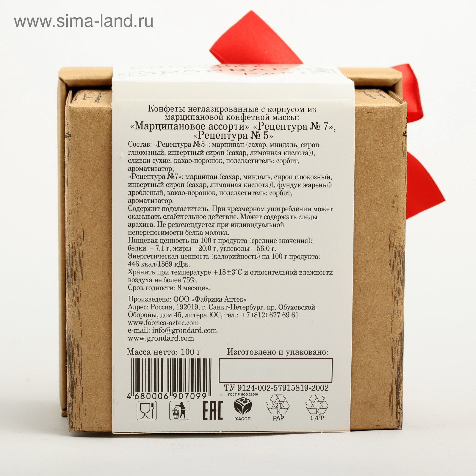 Вкус: Ассорти, Марципан Размер упаковки: 10 x 2 x 33 см. Вес нетто, г: 100 tnved: 1704909800 Вид: Марципан Вид упаковки: Коробка картонная Тематика праздника: Универсальная тематика Срок годности, мес: 8 Продукты: Да Набор конфет из отборного миндаля с двумя вкусами: какао и сливки (Рецептура №5) и какао и дроблёный жареный фундук (Рецептура №7). Подарок для истинных ценителей настоящего марципана! Состав: марципан (сахар, миндаль, глюкозный сироп, инвертный сироп (сахар, лимонная кислота)), сухие сливки, жареный дробленый фундук, какао-порошок, подсластитель (сорбит), ароматизатор. | ||