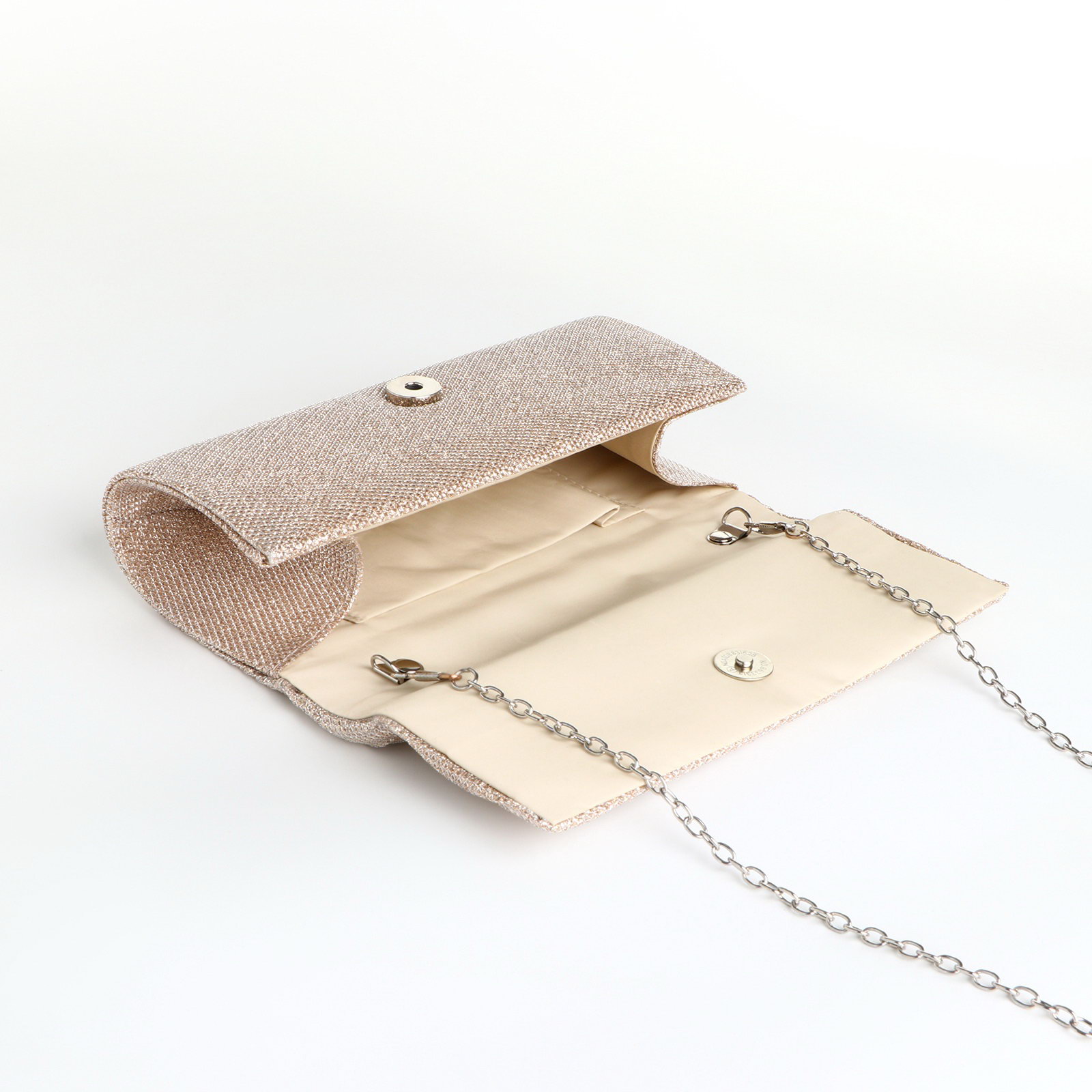 Сумка-клатч женская вечерняя на магните, на длинной цепочке, блестящая, золотистая, 5x20x9 см., Китай