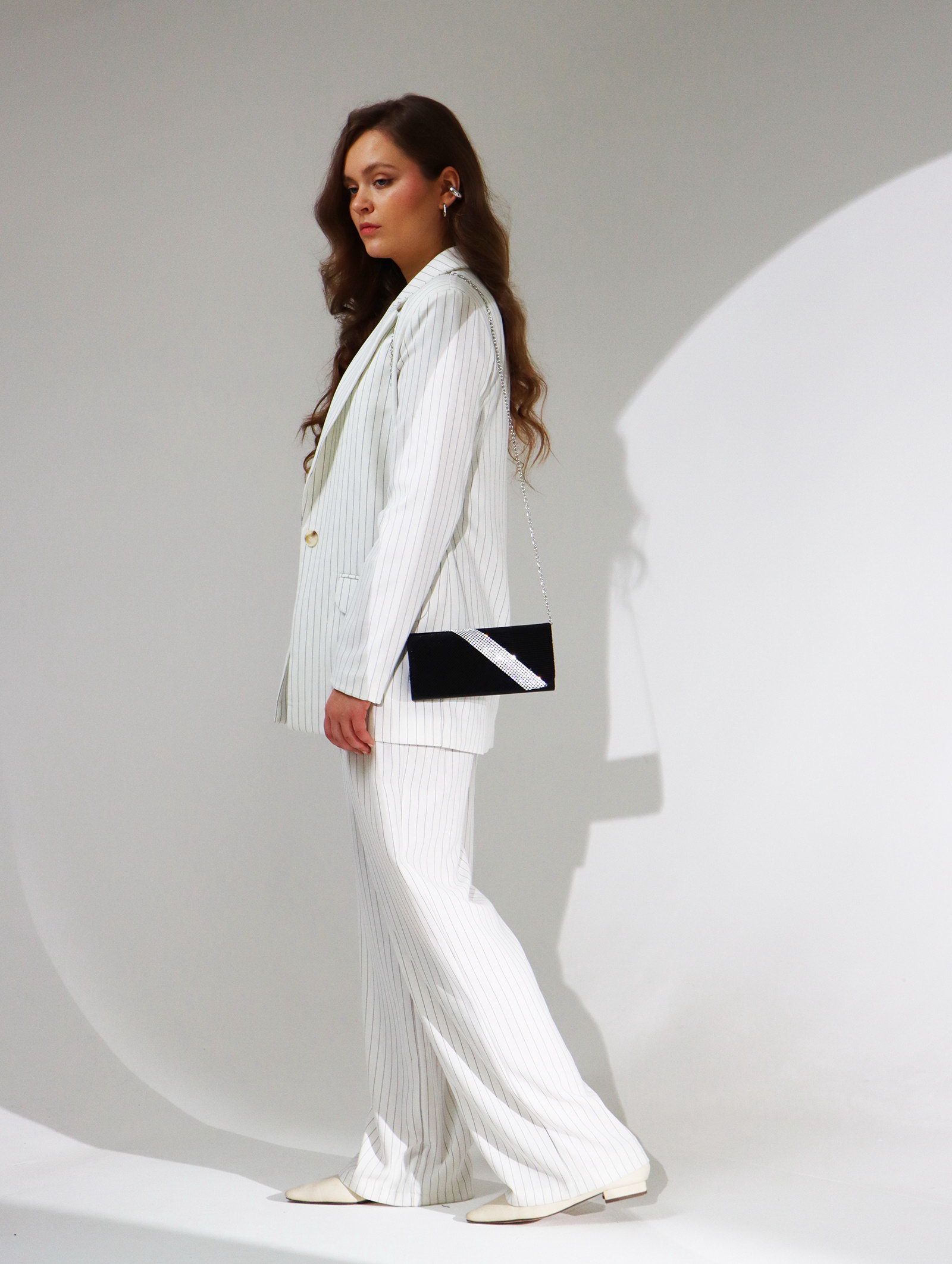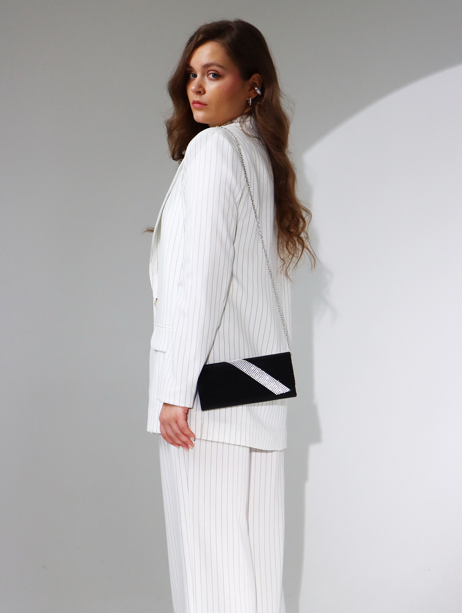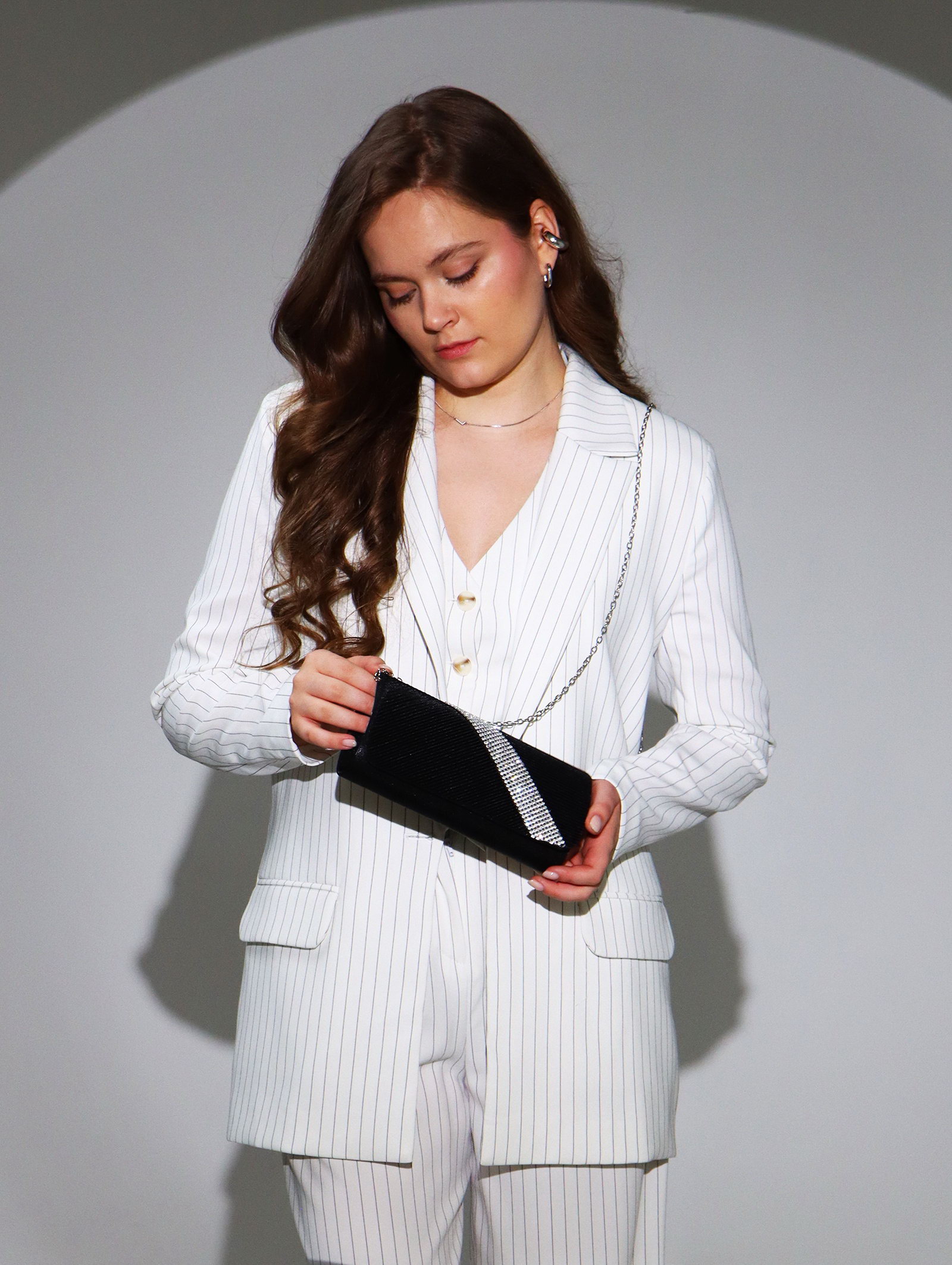 Сумка-клатч вечерняя на магните, на длинной цепочке, с серебристой вставкой, чёрная, 6x21x10 см., Китай