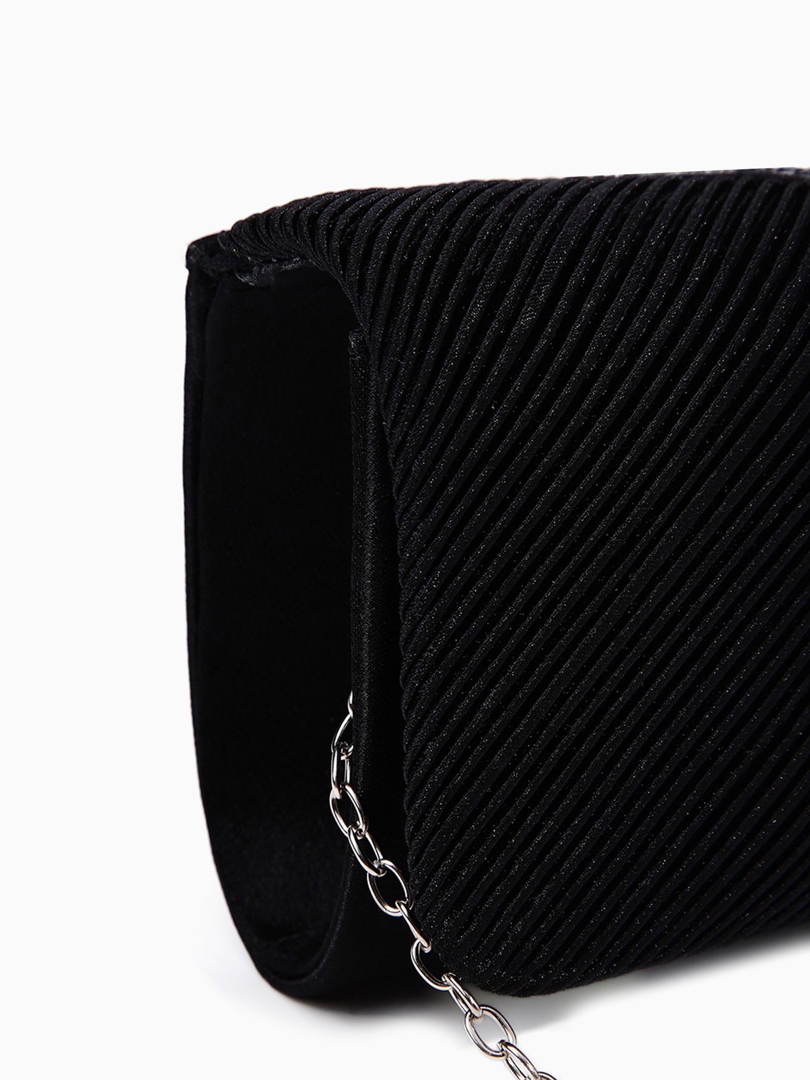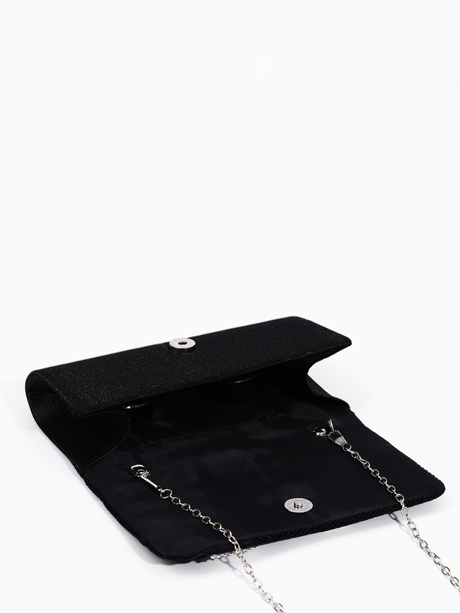Сумка-клатч вечерняя на магните, на длинной цепочке, с серебристой вставкой, чёрная, 6x21x10 см., Китай