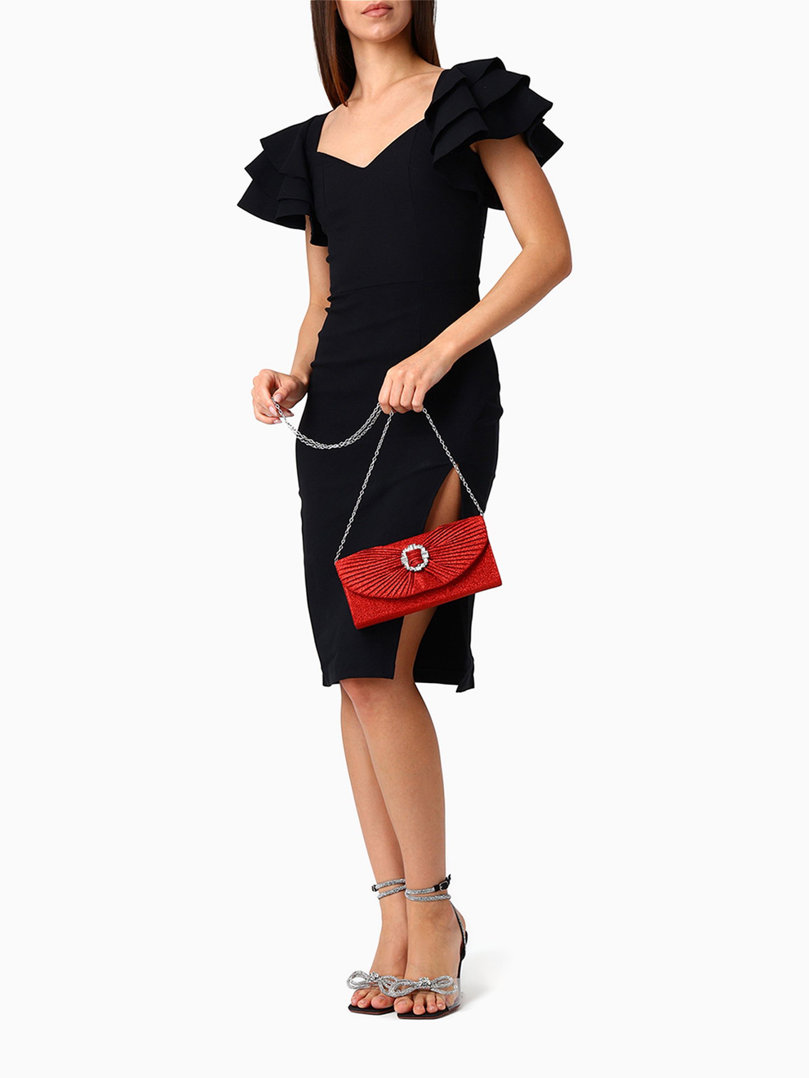 Сумка-клатч женская вечерняя на магните, на длинной цепочке, с декоративной пряжкой, блестящая, красная, 5x24x11 см., Китай