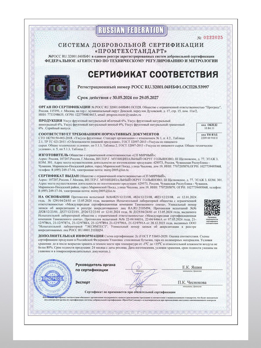 Уксус яблочный натуральный, 6%, 500 мл, 500 мл., СП Мирный, Россия