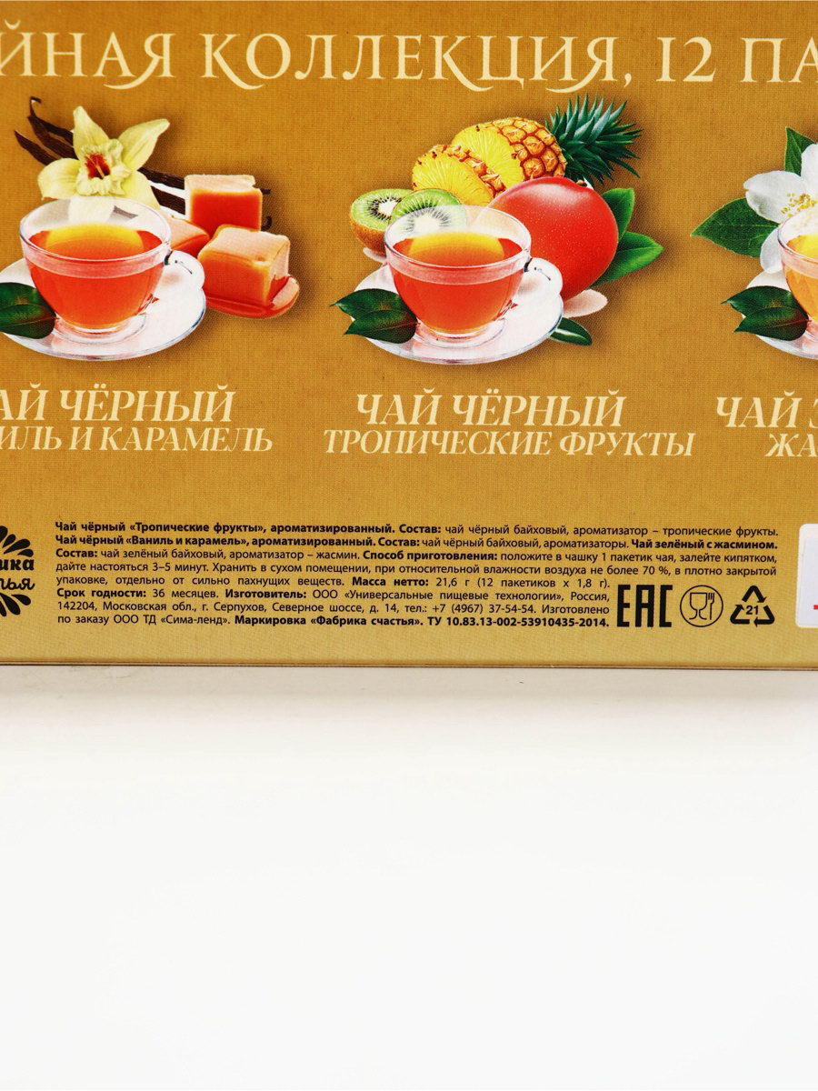 Запрет реализации по сегментам: 00000000266, 00000000593 Возраст: Для взрослых, Для детей Вкус: Ваниль, Жасмин, Карамель, Тропические фрукты Размер упаковки: 24 x 9 x 2.5 см. Тематика праздника: Универсальная тематика tnved: 902300000 Для кого: Унисекс Адресат: Без адресата Температурное ограничение: Нет Вид: В индивидуальных конвертах Подарочный чай: Да Вес нетто, г: 21.6 Добавки чая: Без добавок Фасовка: Пакетированный Вид чая: Ассорти Набор: Нет Чай чёрный "Ваниль и карамель", ароматизированный Состав: чай чёрный байховый, ароматизаторы пищевые. Чай чёрный "Тропические фрукты". Состав: чай чёрный байховый, ароматизаторы пищевые. Чай зелёный "Жасмин", ароматизированный. Состав: чай зелёный байховый, ароматизатор: жасмин. Масса нетто: 21,6 г (12 пакетика x 1,8 г) Срок годности: 36 месяцев. | ||