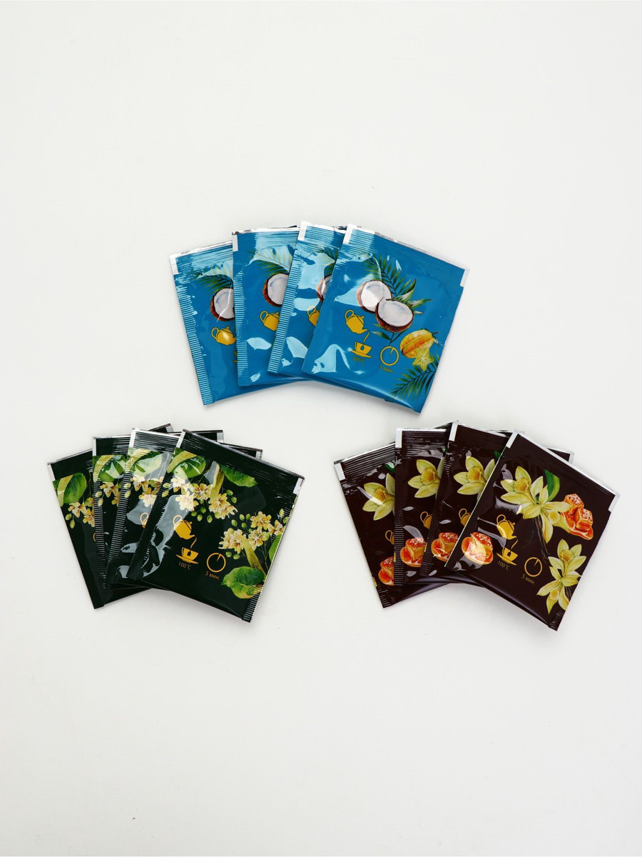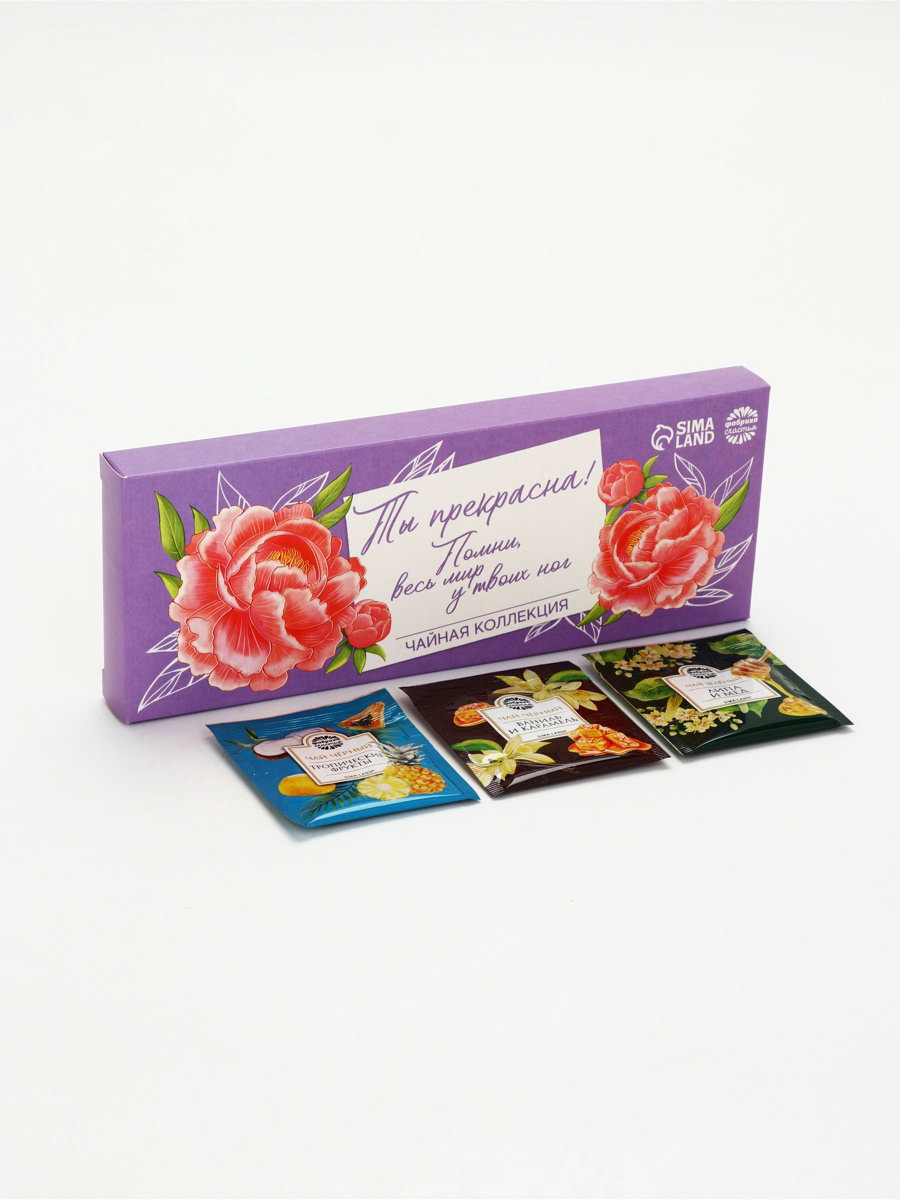 Запрет реализации по сегментам: 00000000266, 00000000593 Добавки чая: Липа, Мёд, Тропические фрукты, Чабрец Для кого: Для девочки, Для женщины Размер упаковки: 9 x 2.5 x 24 см. Фасовка: Пакетированный Вид: В индивидуальных конвертах Вид чая: Ассорти Вес нетто, г: 21.6 Набор: Нет Подарочный чай: Да Тематика подарка: Продукты питания tnved: 902300000 Тематика праздника: Универсальная тематика Адресат: Без адресата Возраст: Для взрослых Вкус: Фруктовый микс ПРИ ОФОРМЛЕНИИ ЗАКАЗА, ПРОСИМ ЗАПРАШИВАТЬ АКТУАЛЬНЫЕ СРОКИ ГОДНОСТИ У МЕНЕДЖЕРА Чай чёрный ""Тропические фрукты"". Состав: чай чёрный байховый, ароматизаторы пищевые. Чай чёрный "Ваниль и карамель". Состав: чай чёрный байховый, ароматизаторы. Чай зелёный "Липа и мёд". Состав: чай зелёный байховый, ароматизаторы пищевые. Способ приготовления: 1 чайный пакетик на 250 мл залить горячей водой, настаивать 3–5 минут. Срок годности: 36 месяцев Масса нетто: 21.6 г (12 шт. x 1,8 г). | ||