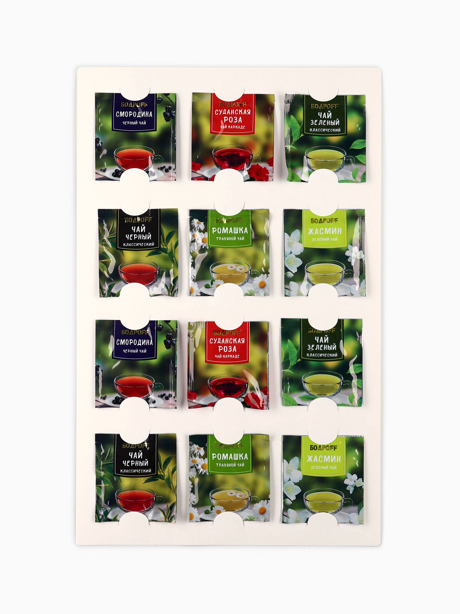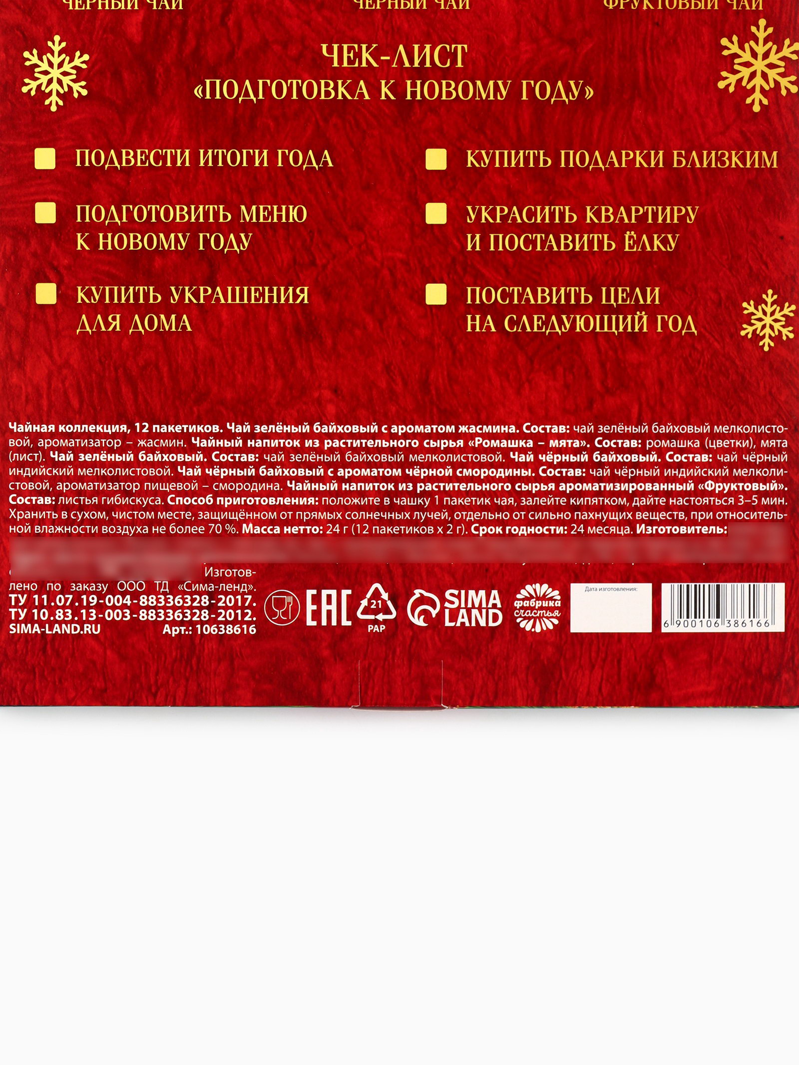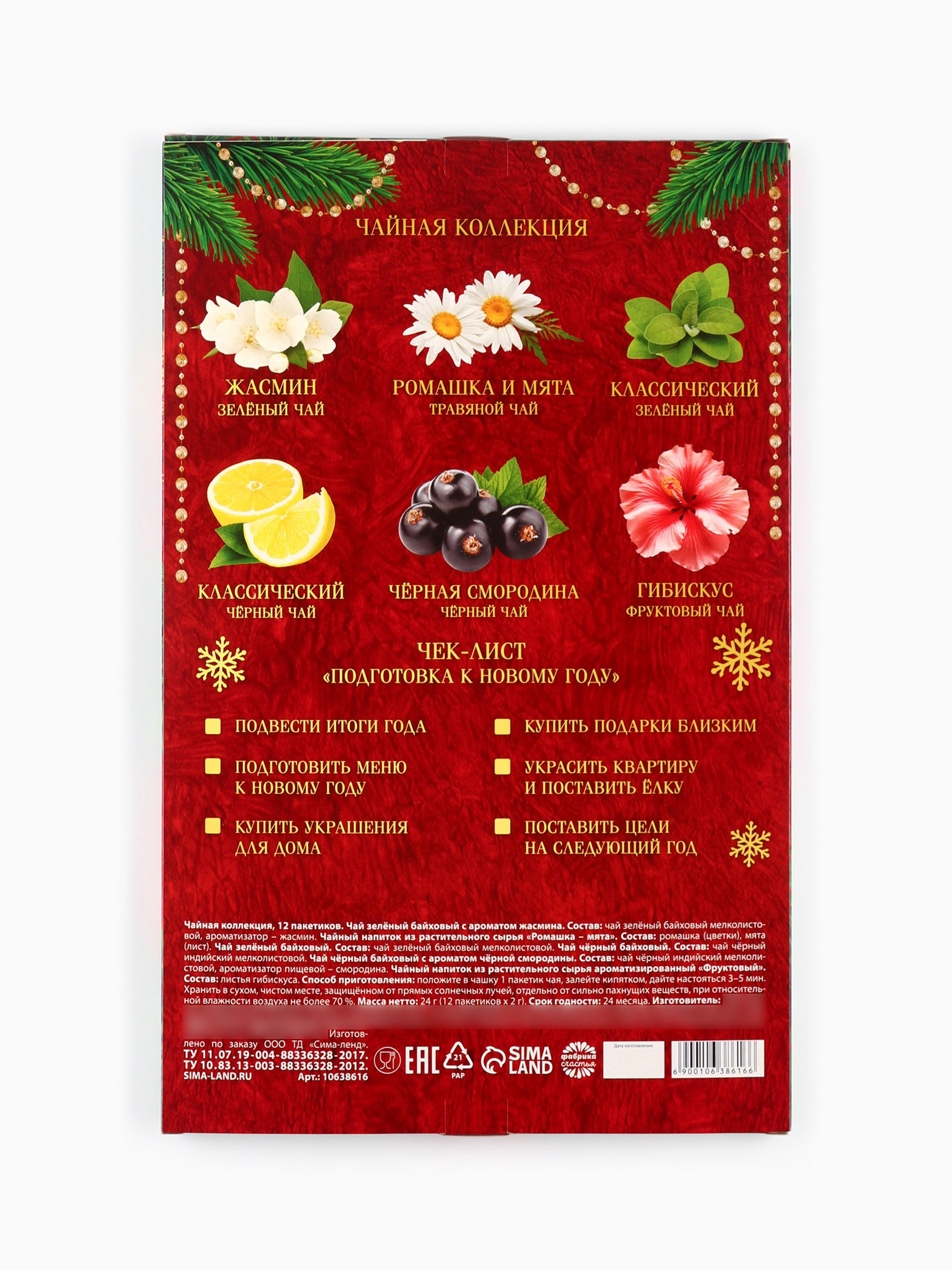 Запрет реализации по сегментам: 00000000266, 00000000593 Размер упаковки: 26 x 1 x 41 см. Тематика праздника: Новый год Добавки чая: Ассорти Фасовка: Пакетированный Вид чая: Ассорти Вид: В индивидуальных конвертах Набор: Да Подарочный чай: Да Вес нетто, г: 21.6 Вес нетто, г: 21.6 tnved: 902300000 Символ года: Нет Новогодняя коллекция: Новый год ПРИ ОФОРМЛЕНИИ ЗАКАЗА, ПРОСИМ ЗАПРАШИВАТЬ АКТУАЛЬНЫЕ СРОКИ ГОДНОСТИ У МЕНЕДЖЕРА Чайный напиток из растительного сырья ароматизированный "Фруктовый"Состав: листья гибискуса. Чайный зелёный байховый с ароматом жасминаСостав: чай зелёный байховый мелколистовой, ароматизатор – жасмин. Чай зелёный байховыйСостав: чай зелёный байховый мелколистовой. Чай чёрный байховыйСостав: чай чёрный индийский мелколистовой. Чай чёрный байховый с ароматом чёрной смородиныСостав: чай чёрный индийский мелколистовой, ароматизатор пищевой – смородина. Чайный напиток из растительного сырья "Ромашка – мята"Состав: ромашка (цветки), мята (лист). Срок годности: 24 месяца. Масса нетто: 24 г (12 пакетиков x 2 г) | ||