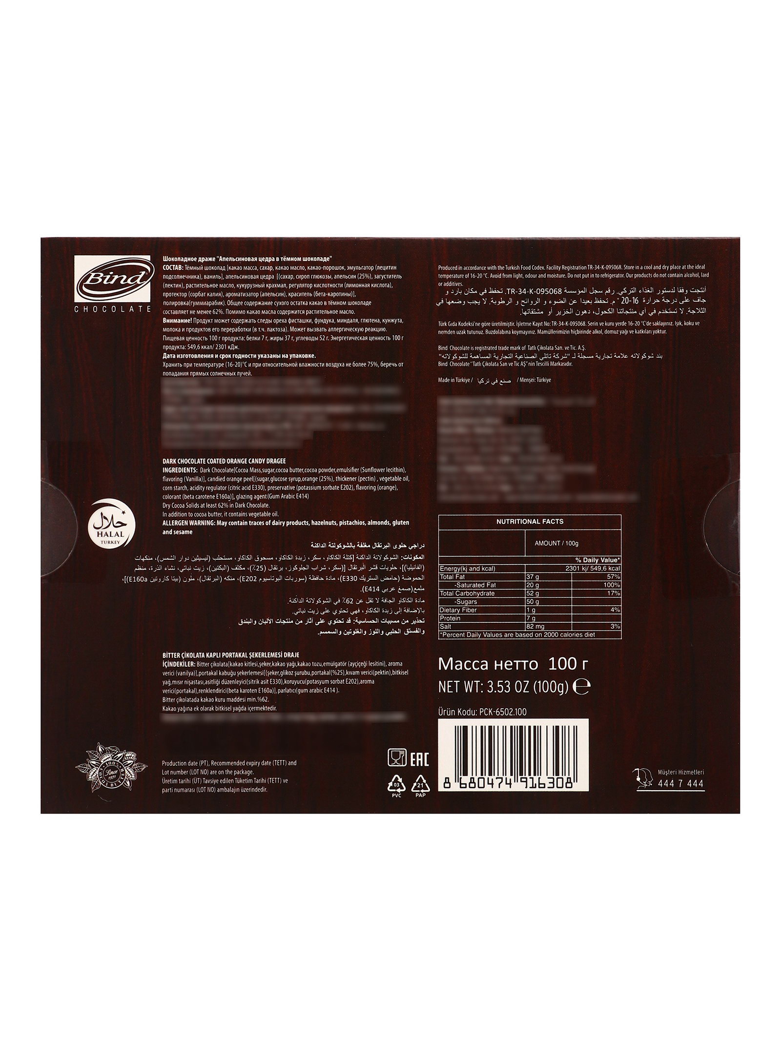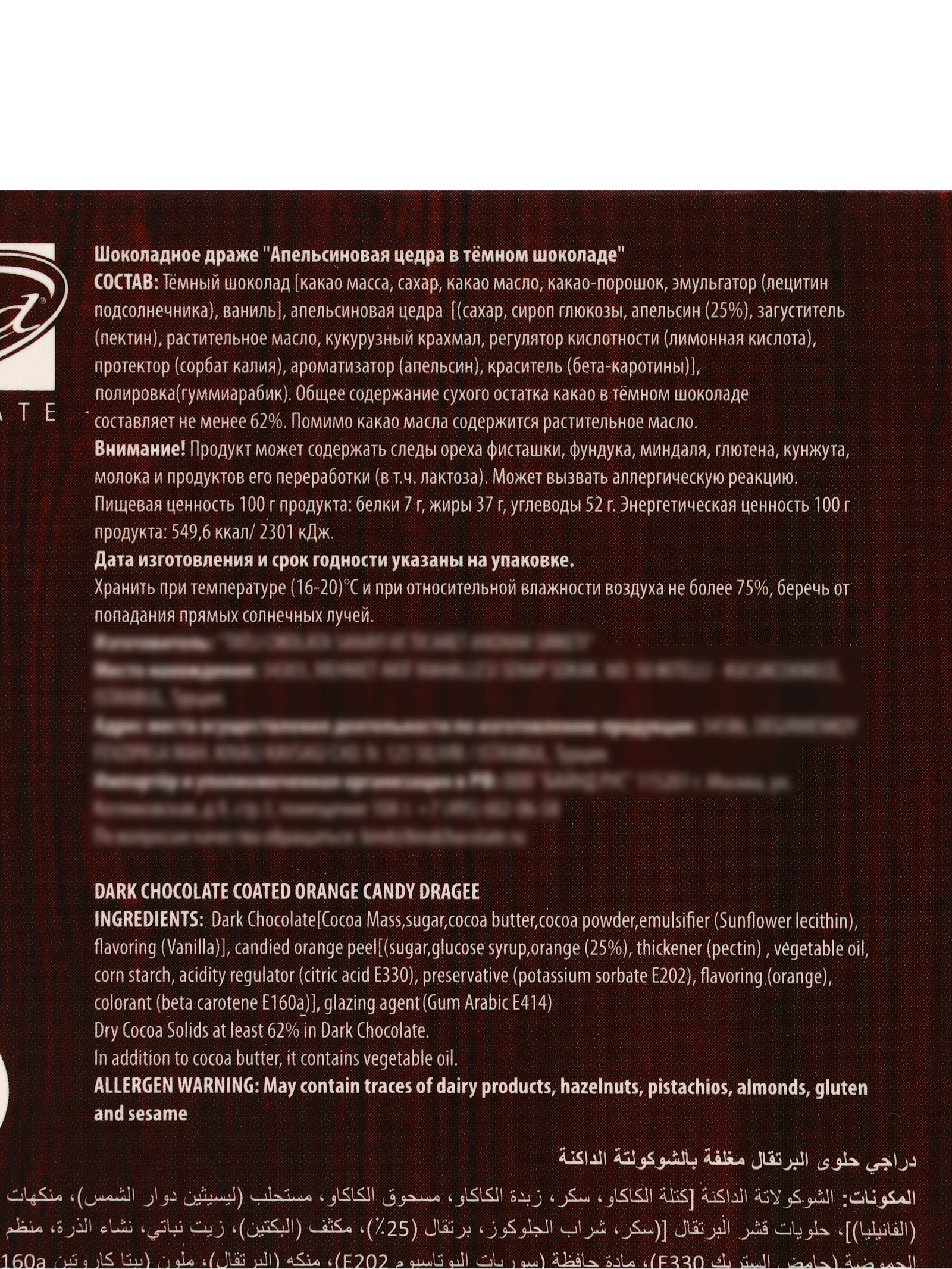 Новогодняя коллекция: Новый год, Рождество Вкус: Апельсин, Шоколад Размер упаковки: 12 x 2.5 x 15 см. Тематика: Новогодняя Символ года: Нет tnved: 1806310000 Тематика праздника: Универсальная тематика Вес нетто, г: 100 Срок годности, мес: 12 Продукты: Да Вид: Драже Вид упаковки: Коробка картонная Bind Chocolate представляет покупателям различные коллекции шоколада ручной работы. Каждая коллекция выделяется уникальным вкусом, оригинальным дизайном конфет и роскошной упаковкой. Наша формула успеха – это сочетание изысканного вкуса и изящного дизайна шоколада. Состав: тёмный шоколад (какао масса, сахар, какао масло, какао порошок, эмульгатор (лецитин подсолнечника), ваниль), апельсиновая цедра (%70) (Корочки апельсина, сахар, сироп глюкозы, регулятор кислотности (лимонная кислота), сорбат калия)). | ||