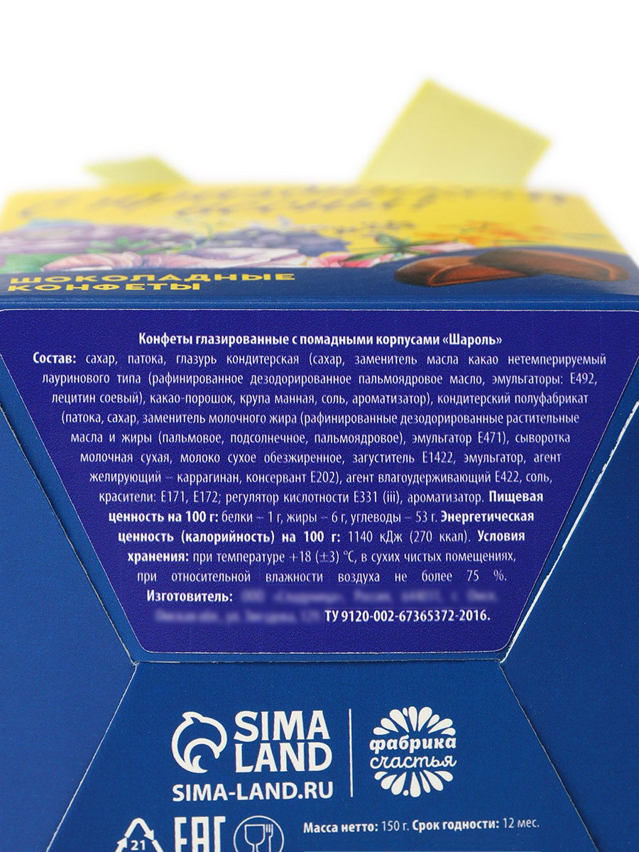 Запрет реализации по сегментам: 00000000266, 00000000593 Размер упаковки: 8.5 x 16.5 x 8.5 см. Вид упаковки: Подарочная коробка Вид: Шоколадные Тематика подарка: Продукты питания Тематика праздника: Универсальная тематика tnved: 1806310000 Температурное ограничение: Нет Вес нетто, г: 150 Вкус: Шоколад Состав: шоколад темный (тертое какао, сахар, масло какао, эмульгатор (лецитин соевый 0,2%), ароматизатор), сахар, жир специального назначения, сухое обезжиренное молоко, сыворотка молочная сухая, эмульгатор (лецитин соевый 0,2%), ароматизаторы. Масса нетто: 150 гр Срок годности: 12 месяцев. | ||