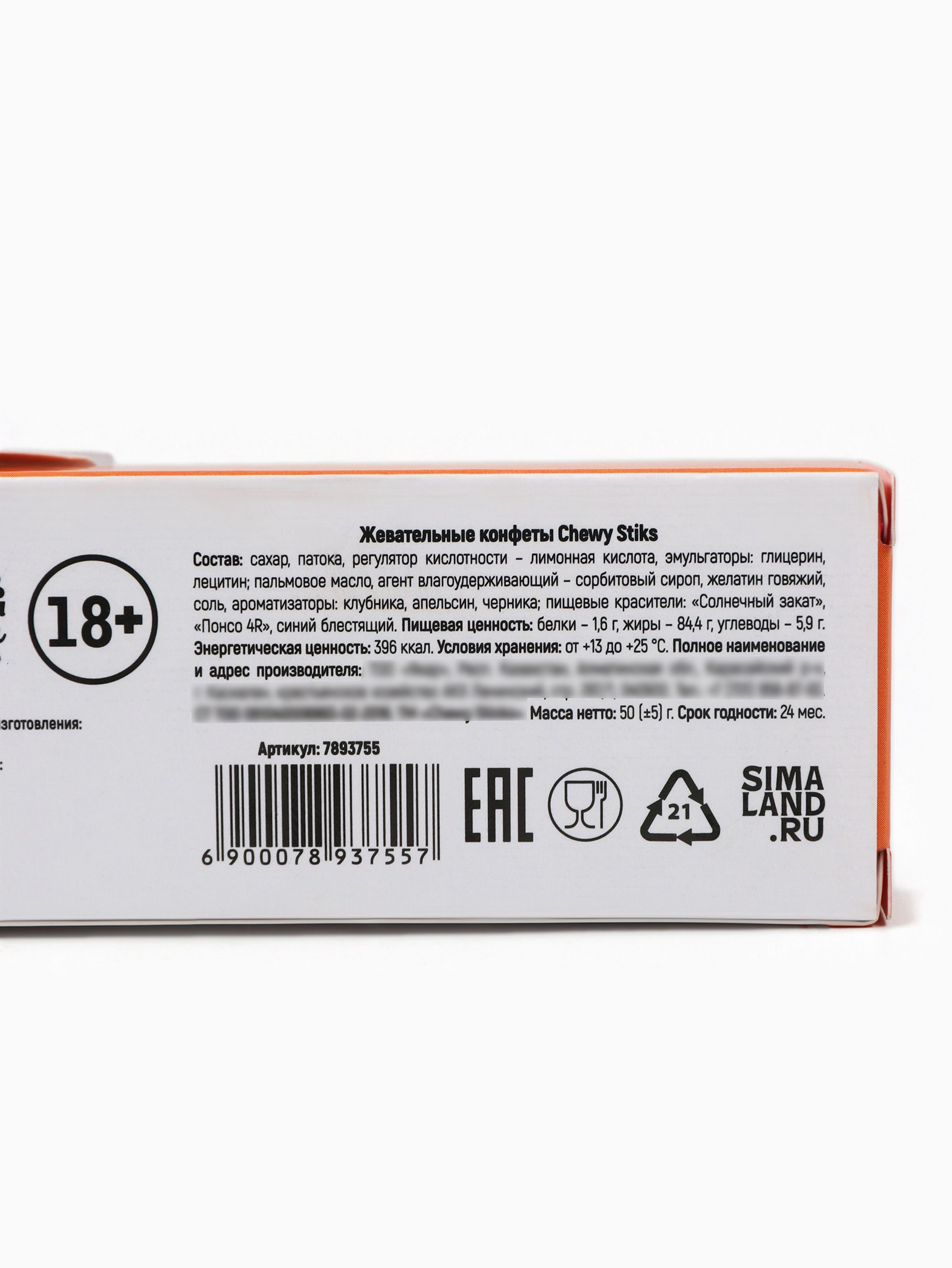 Запрет реализации по сегментам: 00000000266, 00000000534, 00000000593 Размер упаковки: 2 x 10 x 4.5 см. Темпер. ограничение НЕ ВЫШЕ ℃: +18 Темпер. ограничение НЕ ВЫШЕ ℃: +18 tnved: 1704101000 Температурное ограничение: Нет Вес нетто, г: 50 Тематика праздника: Универсальная тематика Вкус: Апельсин Вид: Жевательные Вид упаковки: Подарочная коробка Состав: сахар, сироп глюкозный, масло растительное (пальмовое), регулятор кислотности (лимонная кислота), желатин говяжий, концентрат сока клубники (0,3 %), концентрат сока вишни (0,4 %), концентрат соков апельсина и лимона (0,2 %), эмульгаторы (Е471, лецитин подсолнечный), ароматизатор искусственный, идентичный натуральному, краситель (красный свекольный, Е160а). Срок годности: 24 месяца. Масса нетто: 50 г (±5 г) | ||