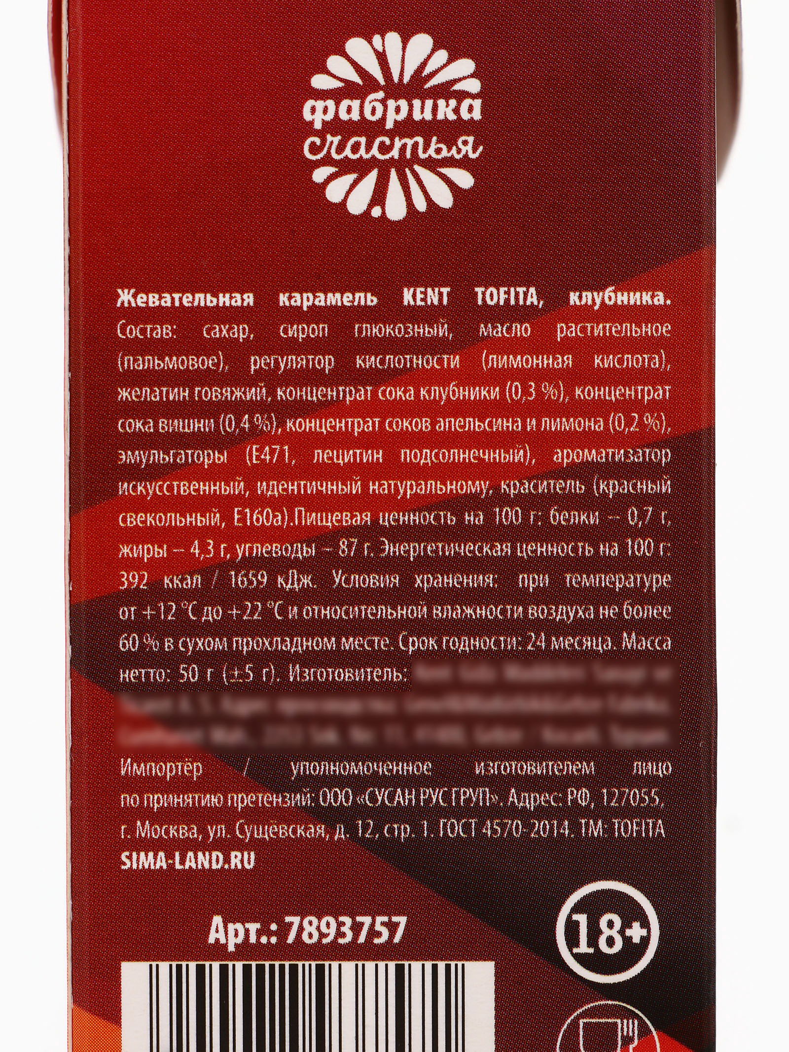 Запрет реализации по сегментам: 00000000266, 00000000534, 00000000593 Размер упаковки: 2 x 10 x 4.5 см. Темпер. ограничение НЕ ВЫШЕ ℃: +18 Вид: Жевательные Вид упаковки: Коробка картонная Тематика праздника: Универсальная тематика Тематика праздника: Универсальная тематика tnved: 1704101000 Температурное ограничение: Нет Вес нетто, г: 50 Вкус: Клубника При оформление заказа, просим запрашивать актуальные сроки годности у менеджераСостав: сахар, сироп глюкозный, масло растительное (пальмовое), регулятор кислотности (лимонная кислота), желатин говяжий, концентрат сока клубники (0,3 %), концентрат сока вишни (0,4 %), концентрат соков апельсина и лимона (0,2 %), эмульгаторы (Е471, лецитин подсолнечный), ароматизатор искусственный, идентичный натуральному, краситель (красный свекольный, Е160а). Срок годности: 24 месяца. Масса нетто: 50 г (±5 г) | ||
