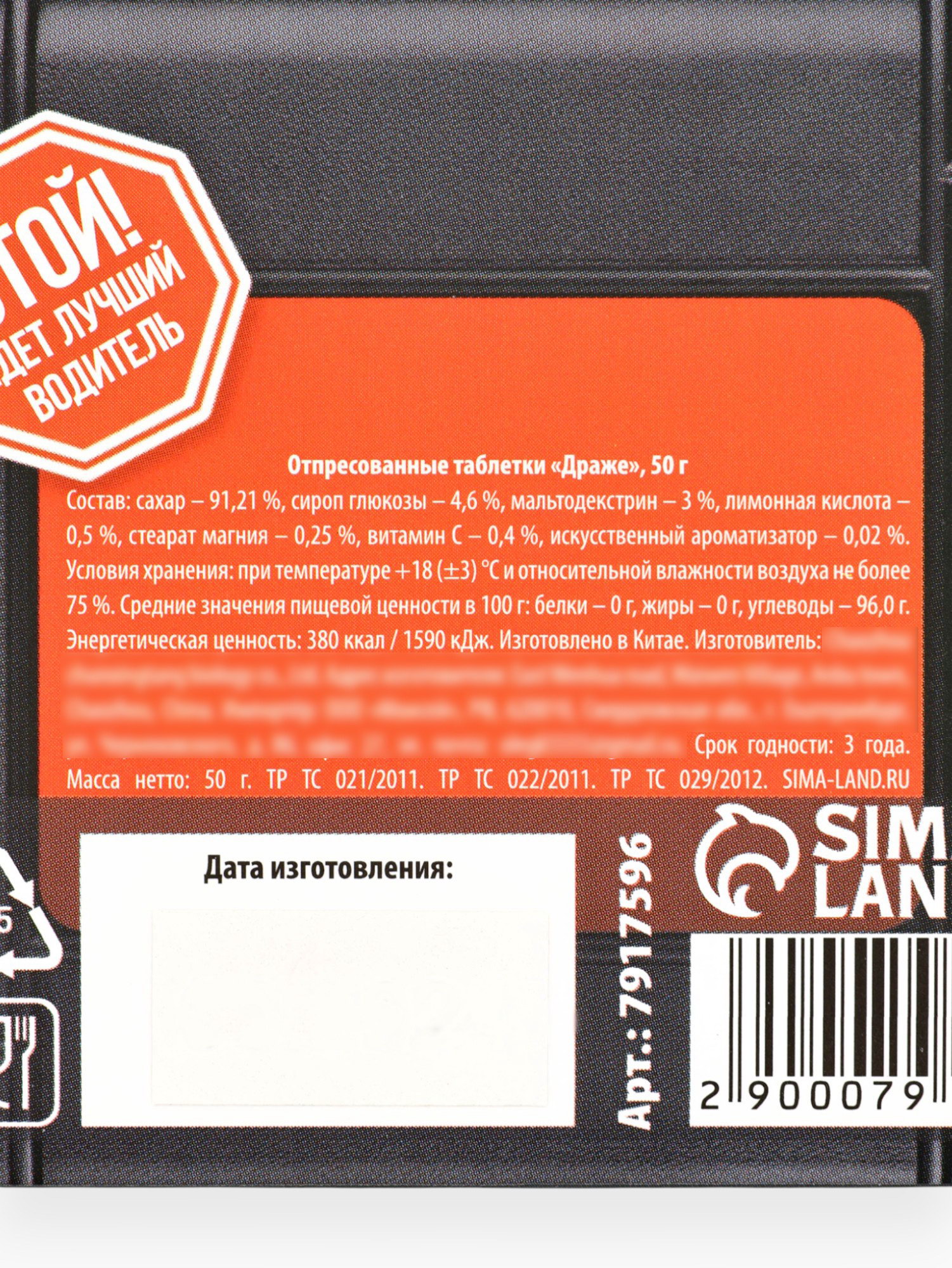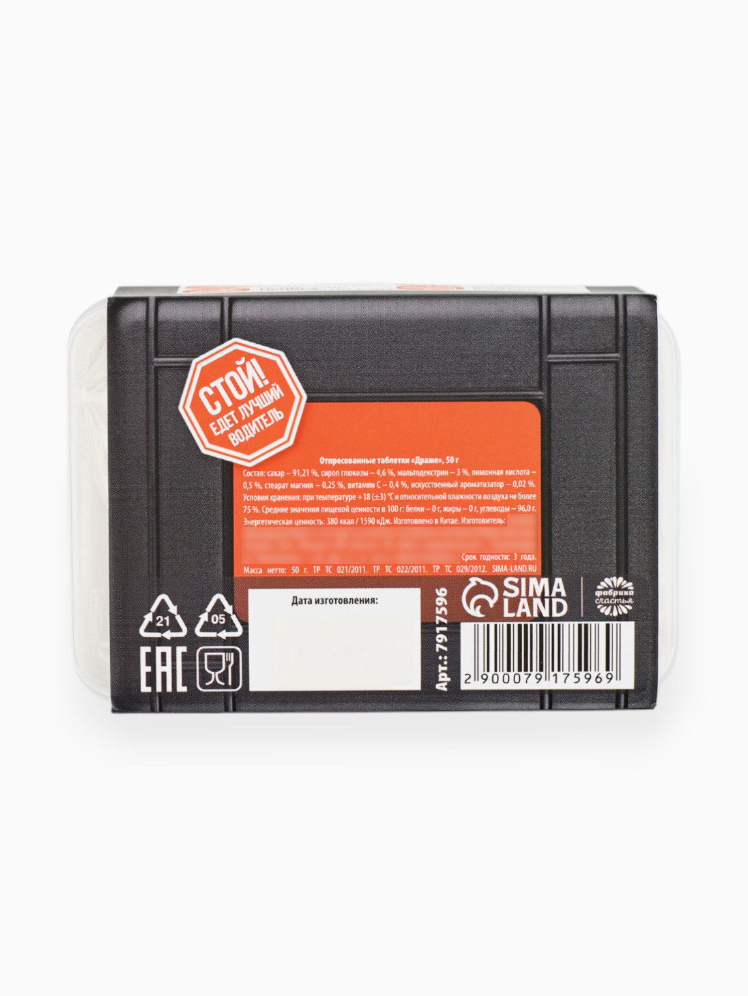 Запрет реализации по сегментам: 00000000266, 00000000593 Размер упаковки: 6.5 x 3.5 x 8.5 см. Темпер. ограничение НЕ ВЫШЕ ℃: +18 Срок годности, мес: 36 Вид упаковки: Коробка пластиковая Начинка: Без начинки Вкус: Без вкуса Тематика праздника: Универсальная тематика tnved: 1704906200 tnved: 1704906200 Вес нетто, г: 50 Вид: Драже При оформление заказа, просим запрашивать актуальные сроки годности у менеджераСостав: сахар – 91,21 %, сироп глюкозы – 4,6 %, мальтодекстрин – 3 %, лимонная кислота – 0,5 %, стеарат магния – 0,25 %, витамин С – 0,4 %, искусственный ароматизатор – 0,02 %, красители – 0,01 %, E124, E102, E133, E110. Срок годности: 3 года. Масса нетто: 50 г (± 5 г) | ||